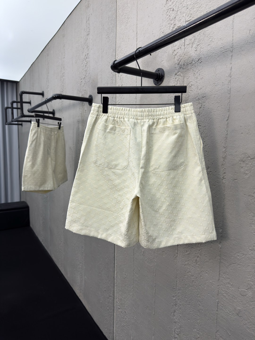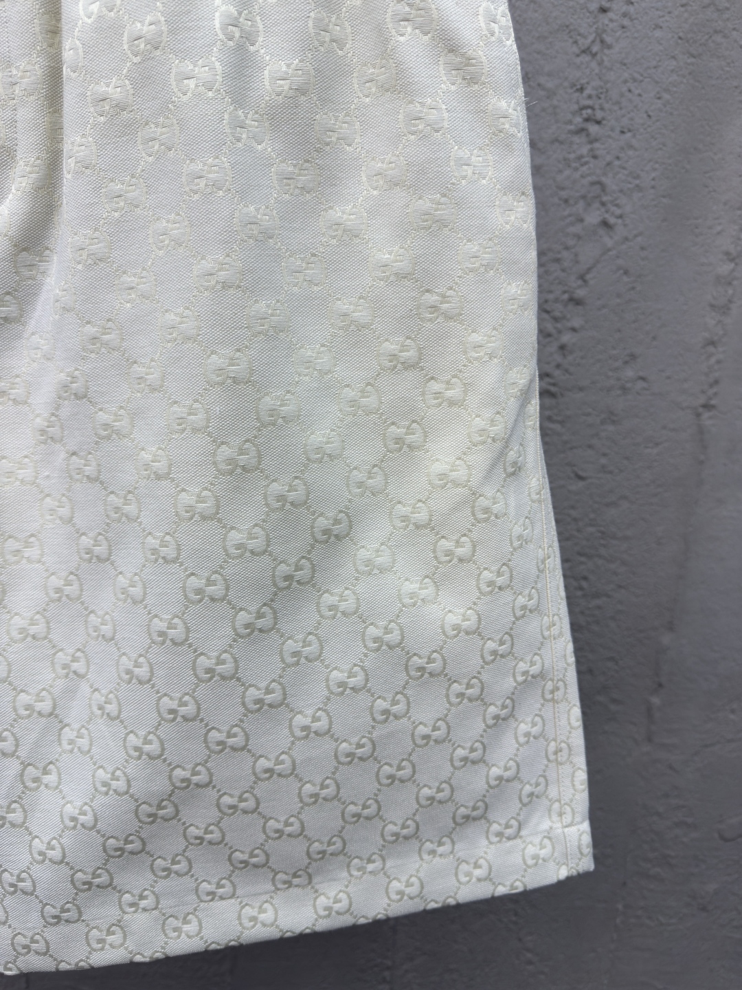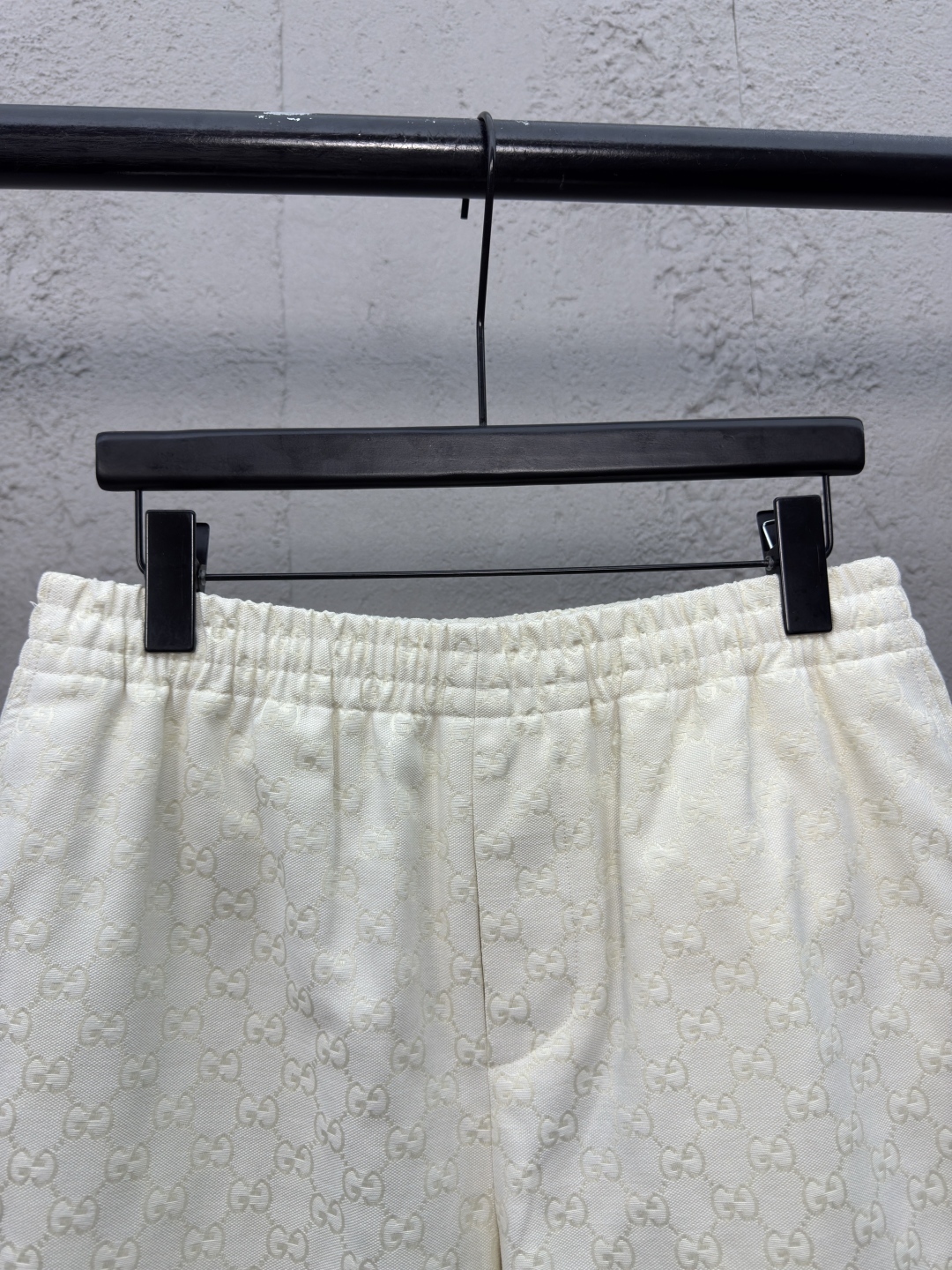 GUCCI 提花满印双G短裤 工艺说明:定制经典提花面料,满身经典双G互扣logo。松紧弹力带腰围设计,手缝压花皮质吊粒,微廓形裤脚设计,整体走线平直细腻,面料舒适柔软,颜色一致无色差 能与同款搭配营造时尚造型,驾驭各种场合,定制辅料,三标齐全,男女同款! ⚠️颜色:米白色 ⚠️Size:S/M/L/XL