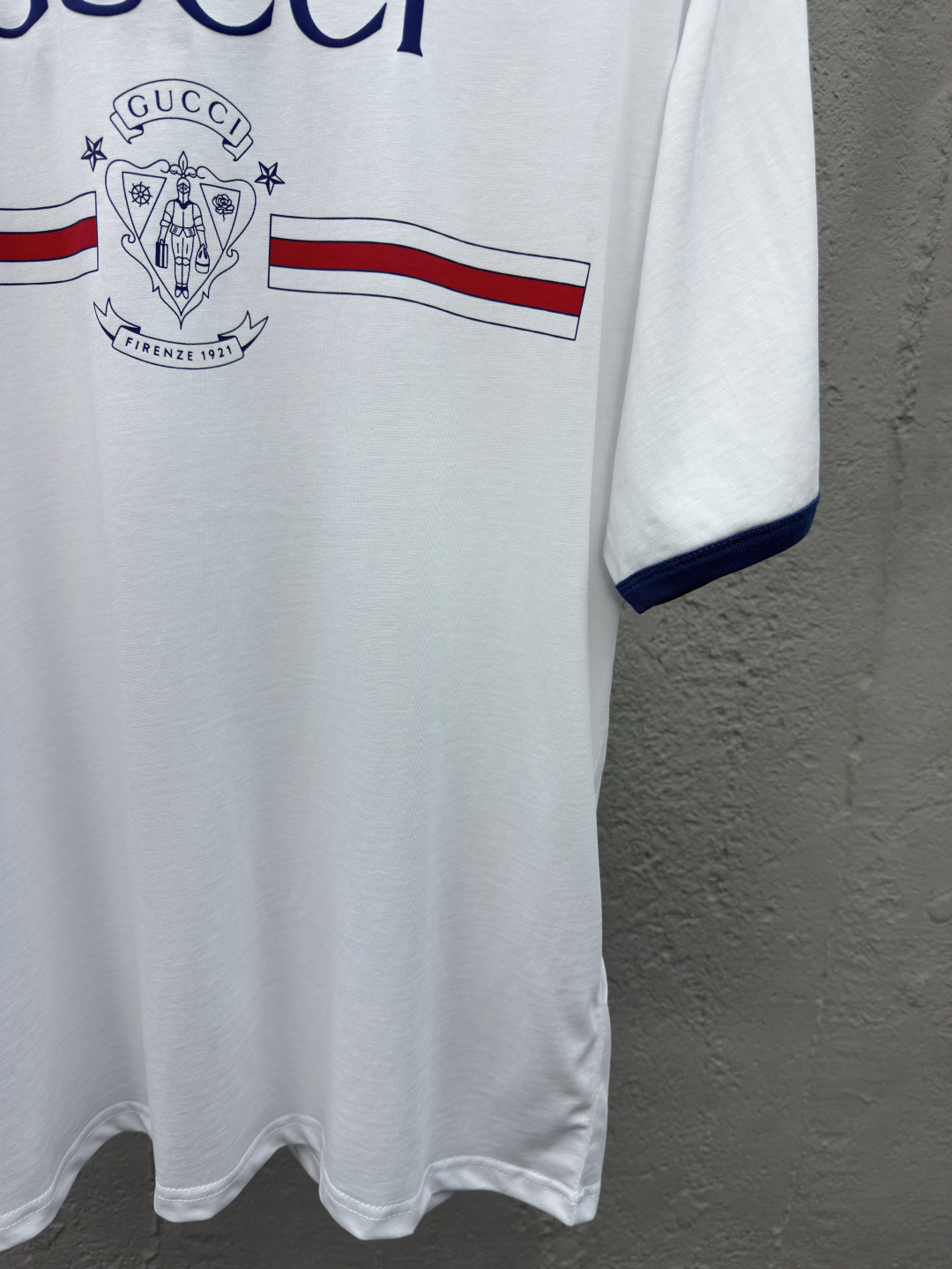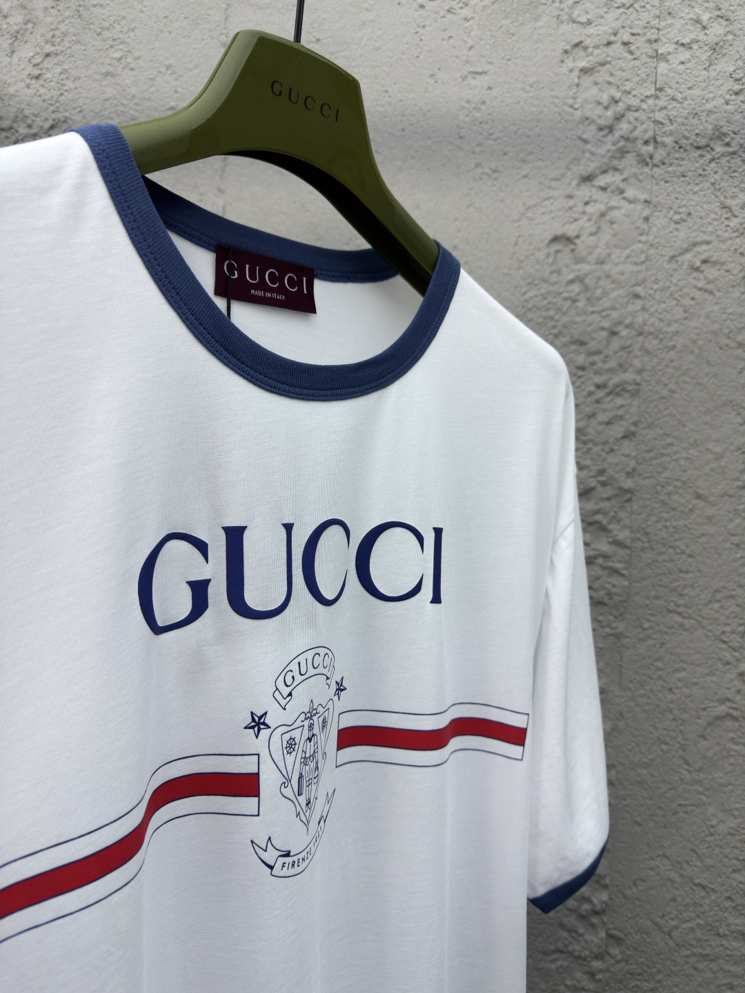 GUCCI 织带印花短袖 工艺说明:采用24支的特纺紧密棉纱线织造而成,织造工艺要求较高,需要使用先进的织机和高品质的原材料。微发泡叠加多层套印,模仿手工刺绣的立体纹理。硅油的添加能有效降低胶膜硬度,提升面料滑爽度,避免传统胶浆的橡胶感。整体走线平直细腻,面料舒适柔软,颜色一致无色差 能与同款搭配营造时尚造型,驾驭各种场合,定制辅料,三标齐全,男女同款! ⚠️颜色:白色 ⚠️Size:XS/S/M/L