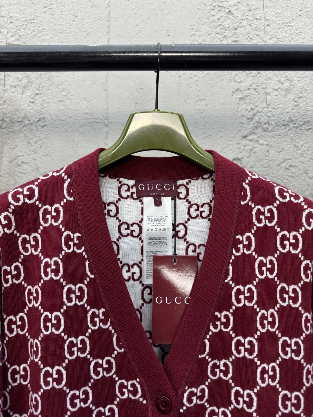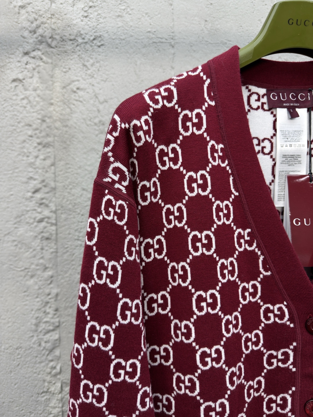 GUCCI 提花满印字母开衫 工艺说明:定制YB羊毛针织材质 V领针织开衫 点缀开模扭扣 再饰以V领处理 通体装饰撞色黑白双G标识,整体走线平直细腻,面料舒适柔软,颜色一致无色差 能与同款搭配营造时尚造型,驾驭各种场合,定制辅料,三标齐全,男女同款! ⚠️颜色:红色 ⚠️Size:S/M/L