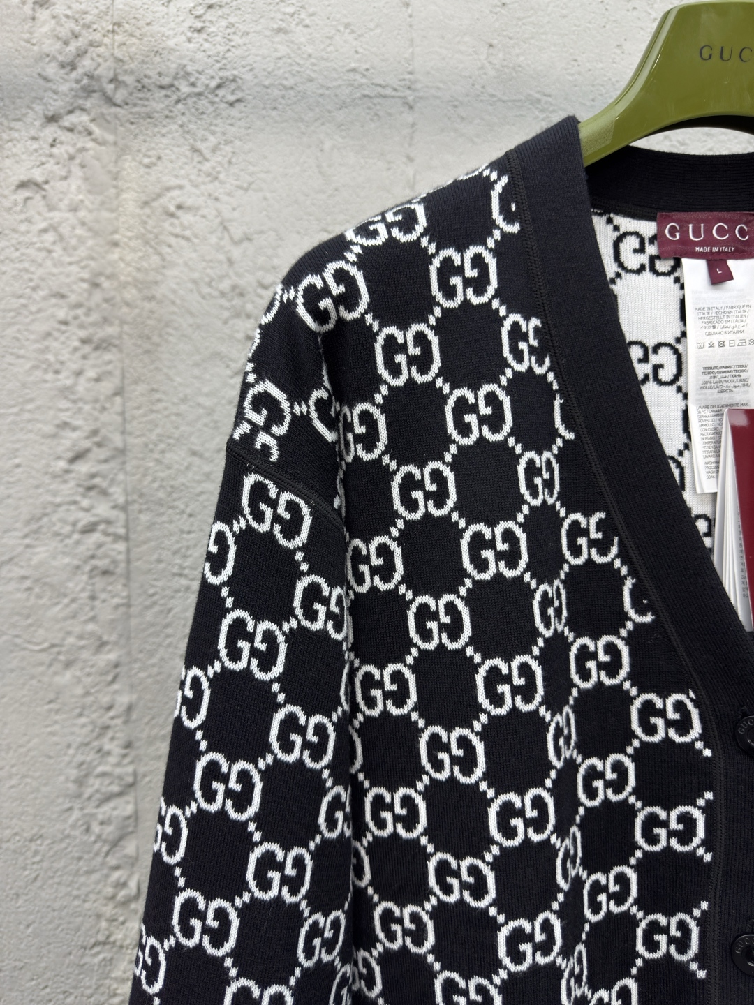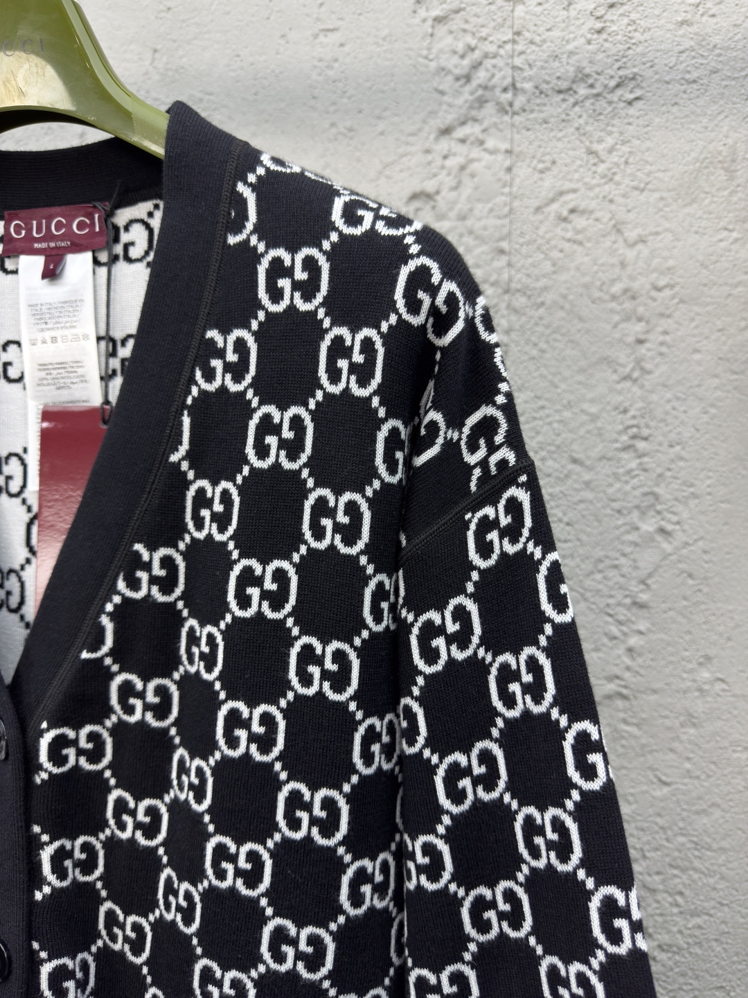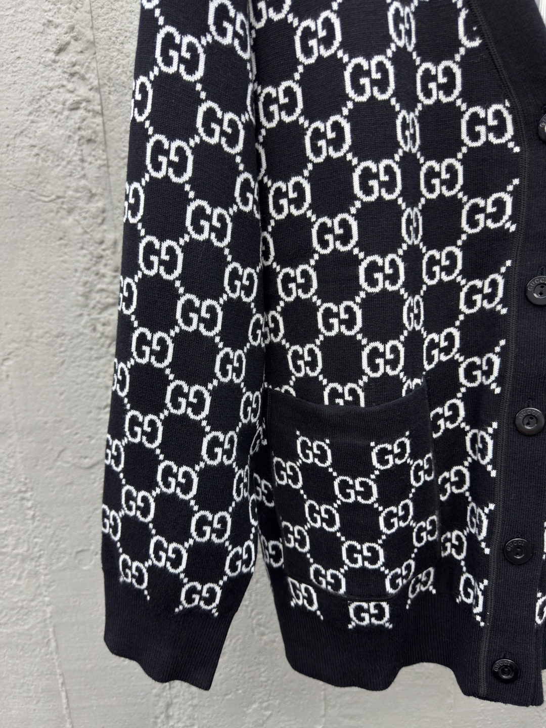 GUCCI 提花满印字母开衫 工艺说明:定制YB羊毛针织材质 V领针织开衫 点缀开模扭扣 再饰以V领处理 通体装饰撞色黑白双G标识,整体走线平直细腻,面料舒适柔软,颜色一致无色差 能与同款搭配营造时尚造型,驾驭各种场合,定制辅料,三标齐全,男女同款! ⚠️颜色:黑色 ⚠️Size:S/M/L