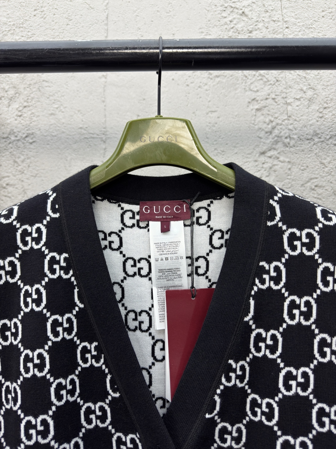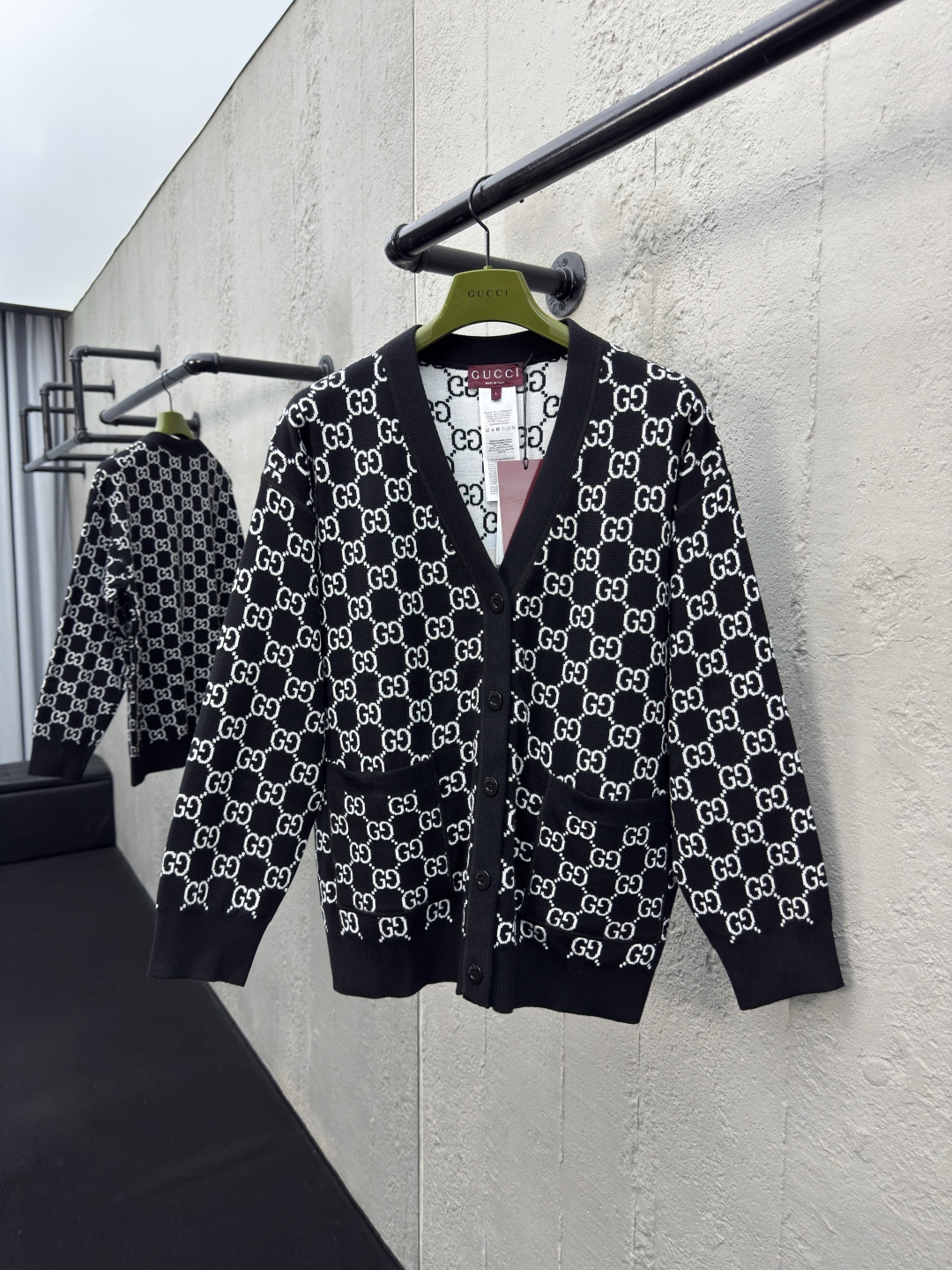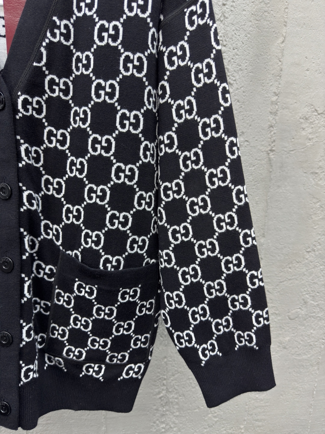GUCCI 提花满印字母开衫 工艺说明:定制YB羊毛针织材质 V领针织开衫 点缀开模扭扣 再饰以V领处理 通体装饰撞色黑白双G标识,整体走线平直细腻,面料舒适柔软,颜色一致无色差 能与同款搭配营造时尚造型,驾驭各种场合,定制辅料,三标齐全,男女同款! ⚠️颜色:黑色 ⚠️Size:S/M/L