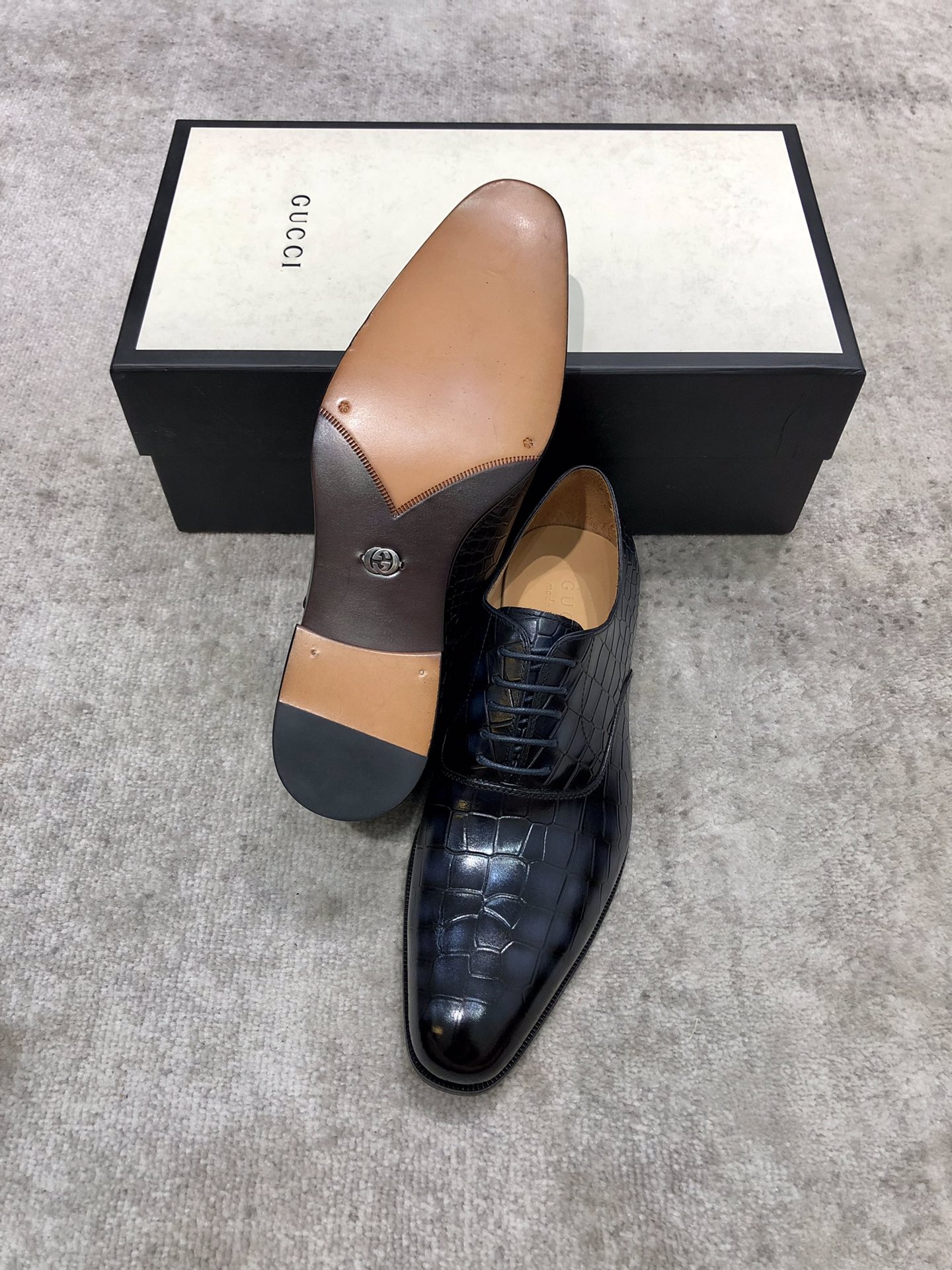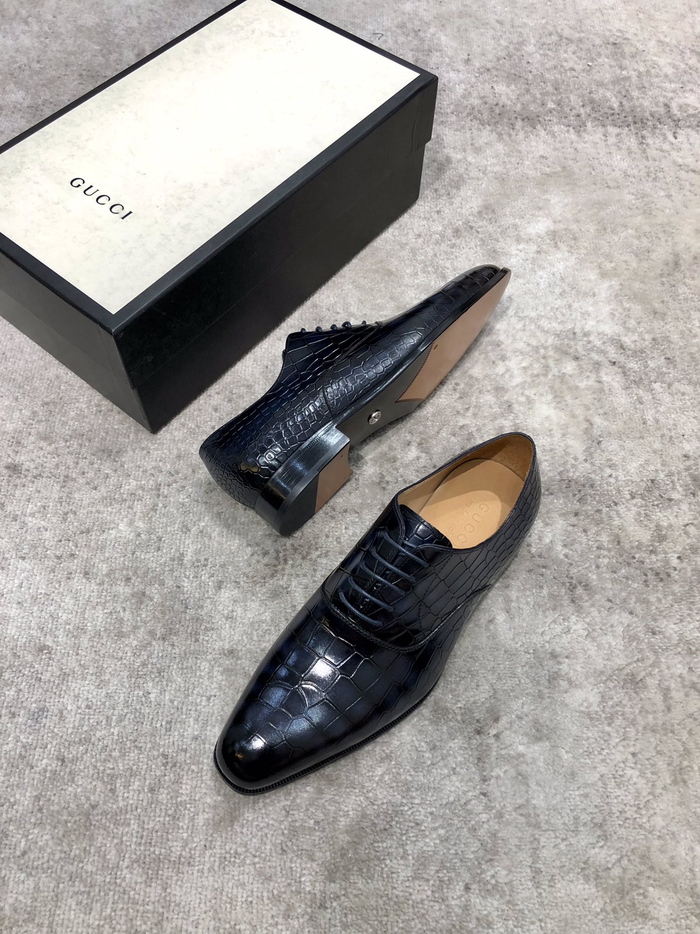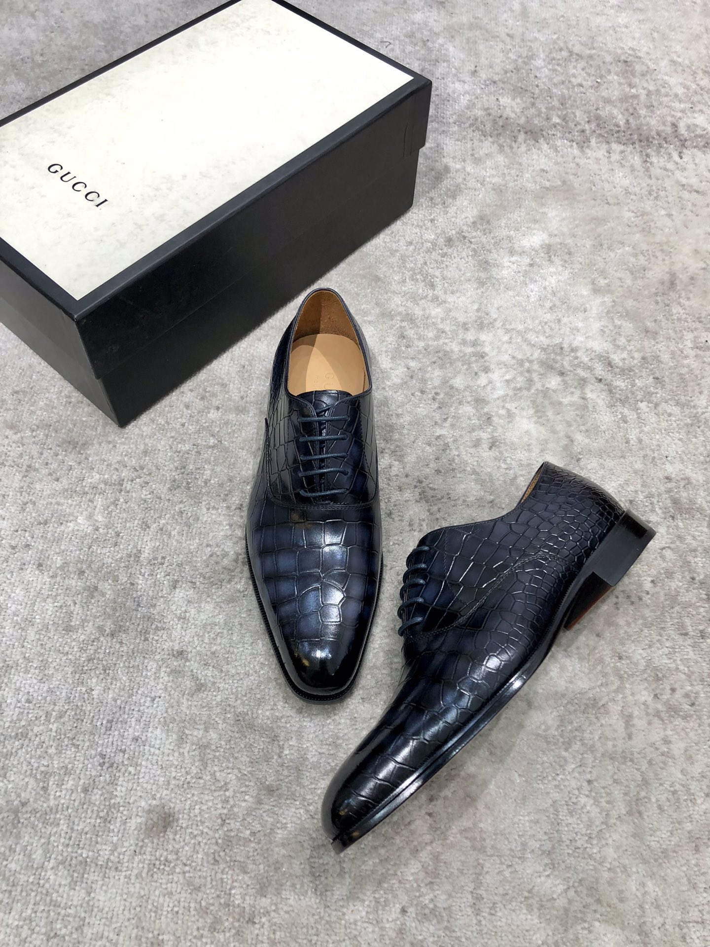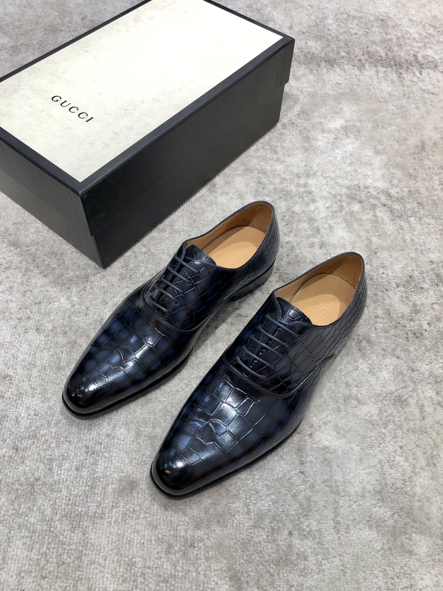 Gucci 男士经典牛津鞋男士商务正装皮鞋 经典款 极致艺术 全鞋采用进口打蜡饮奶牛牛皮古法手工描改擦色(深蓝) 精挑细选 毛孔细腻 光泽度极好,质感柔软 韧性强耐穿不易变形,杏色小牛皮内里,柔软舒适,吸汗透气。真皮大底,后跟复合橡胶底片 柳钉加固,防滑耐磨。固特异工艺制作 鞋型极好 轻奢有型 出入各类正式场合都能压阵!原盒 防尘袋包装 !标准码39-44(38.45定做不退不换)