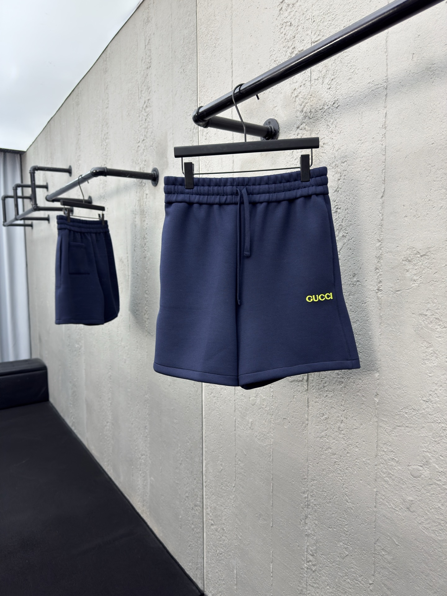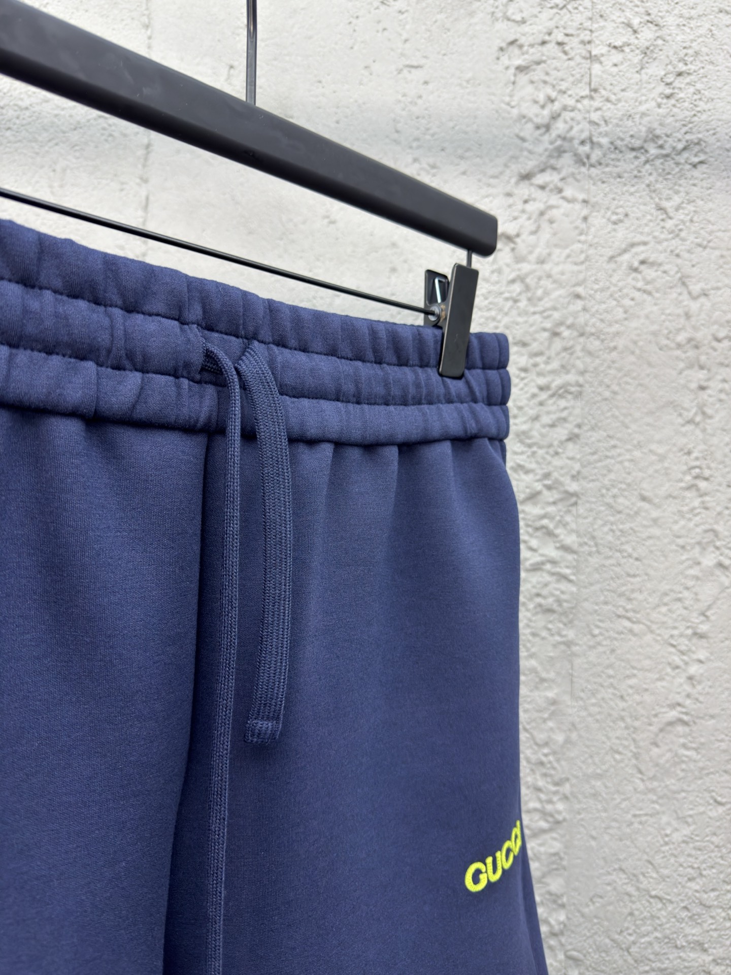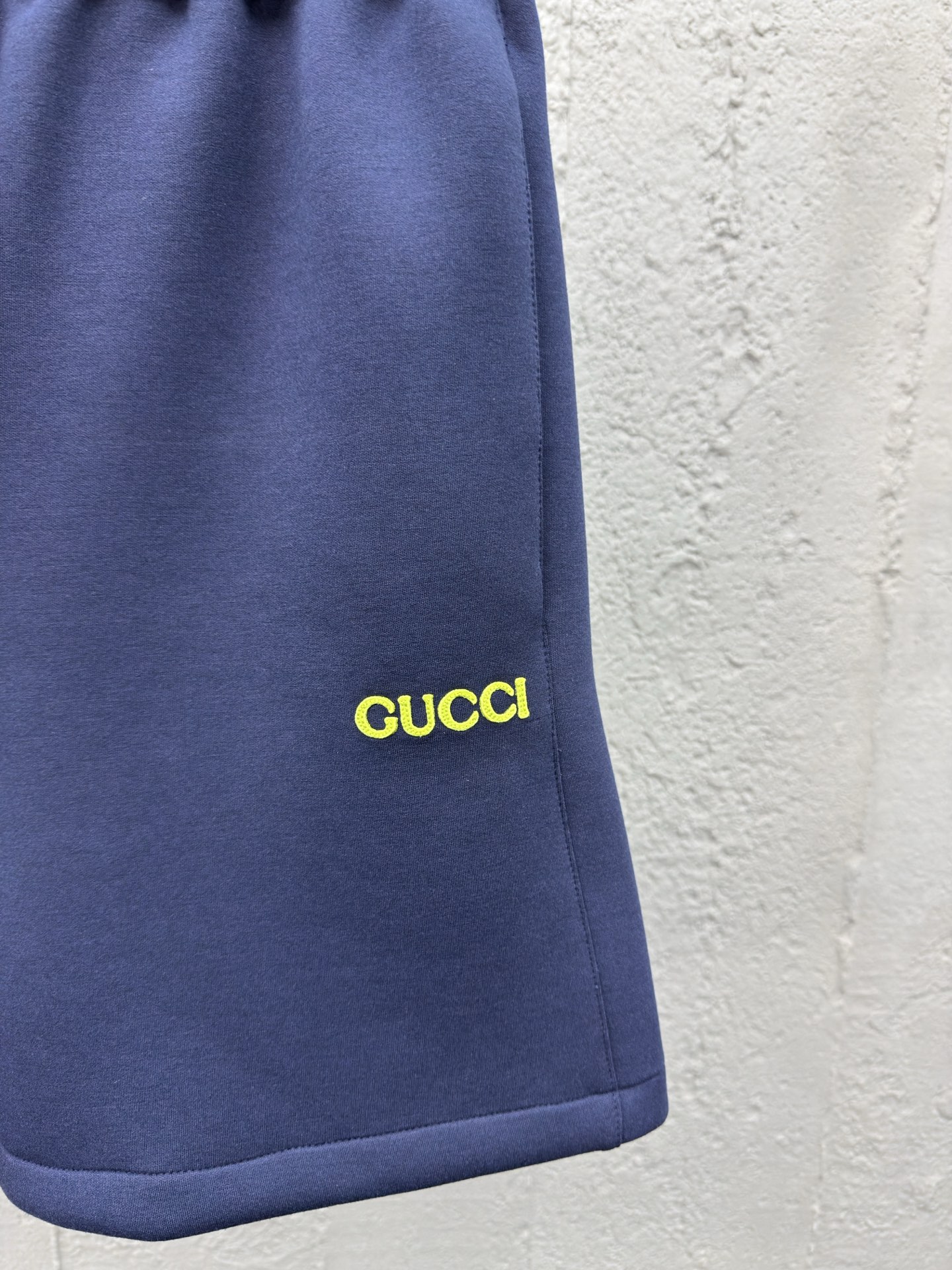 GUCCI 饰贴饰针织短裤 工艺说明采用95%再生黏胶纤维与5%氨纶的黄金配比,织造出如第二层肌肤的柔感体验。黏胶纤维结构具有天然的亲水性,可快速吸收并蒸发汗液。LOGO刺绣贴饰采用0.3毫米超细聚酯绣线,经12小时激光切割定型工艺打造浮雕质感。每片贴饰经过5道抗皱处理,确保水洗后仍保持原有形态。整体走线平直细腻,面料舒适柔软,颜色一致无色差 能与同款搭配营造时尚造型,驾驭各种场合,定制辅料,三标齐全,男女同款! ⚠️颜色:蓝色 ⚠️Size:S/M/L/XL
