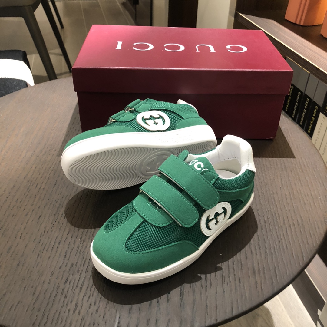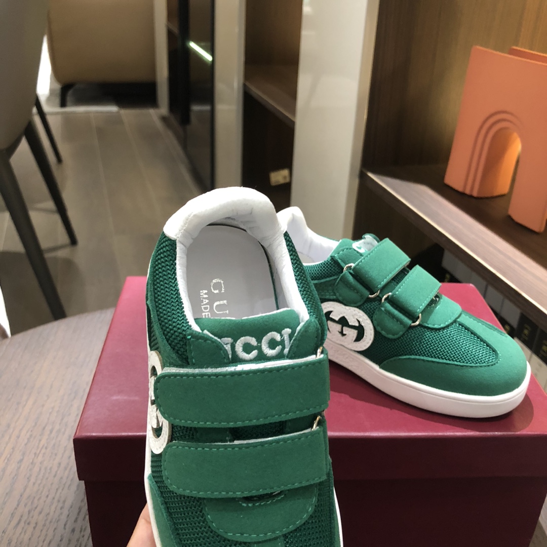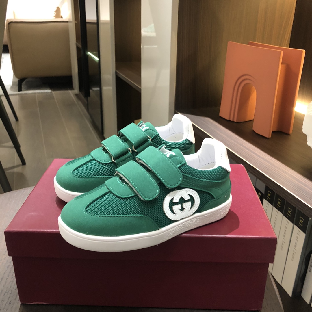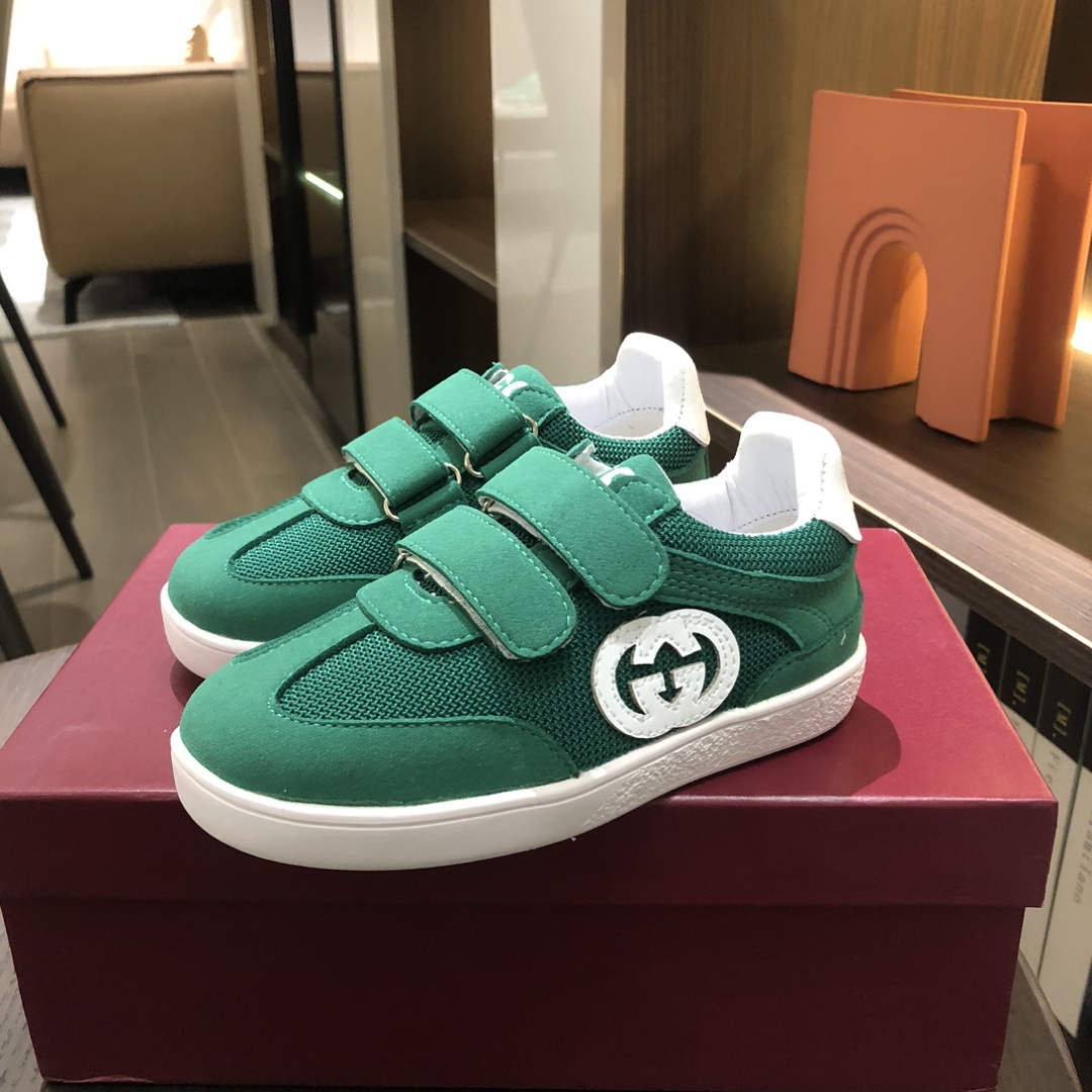 Gucikinds 2025最新款 阿甘鞋 儿童德训鞋 休闲鞋 复古时尚 魔术贴设计 上脚非常轻便舒适 丝绒皮面 网面拼接 配真皮内里 橡胶原版大底 四色 黑色 绿色 红色 白色