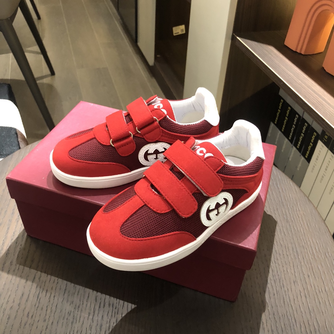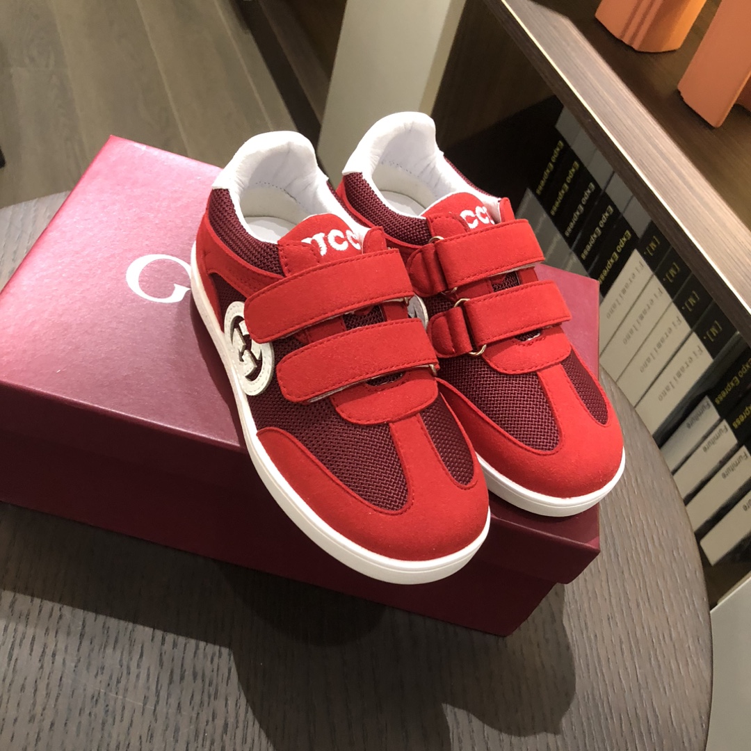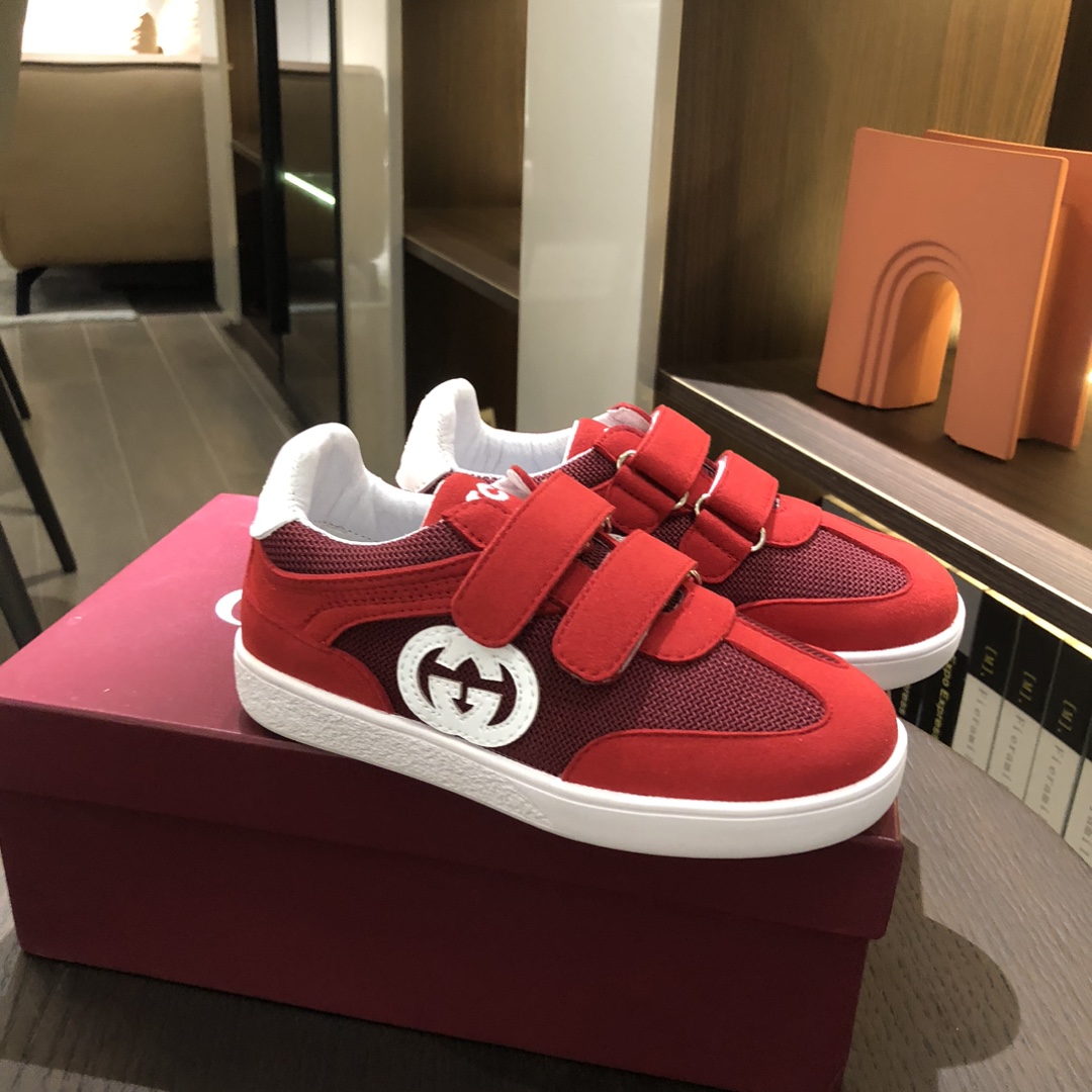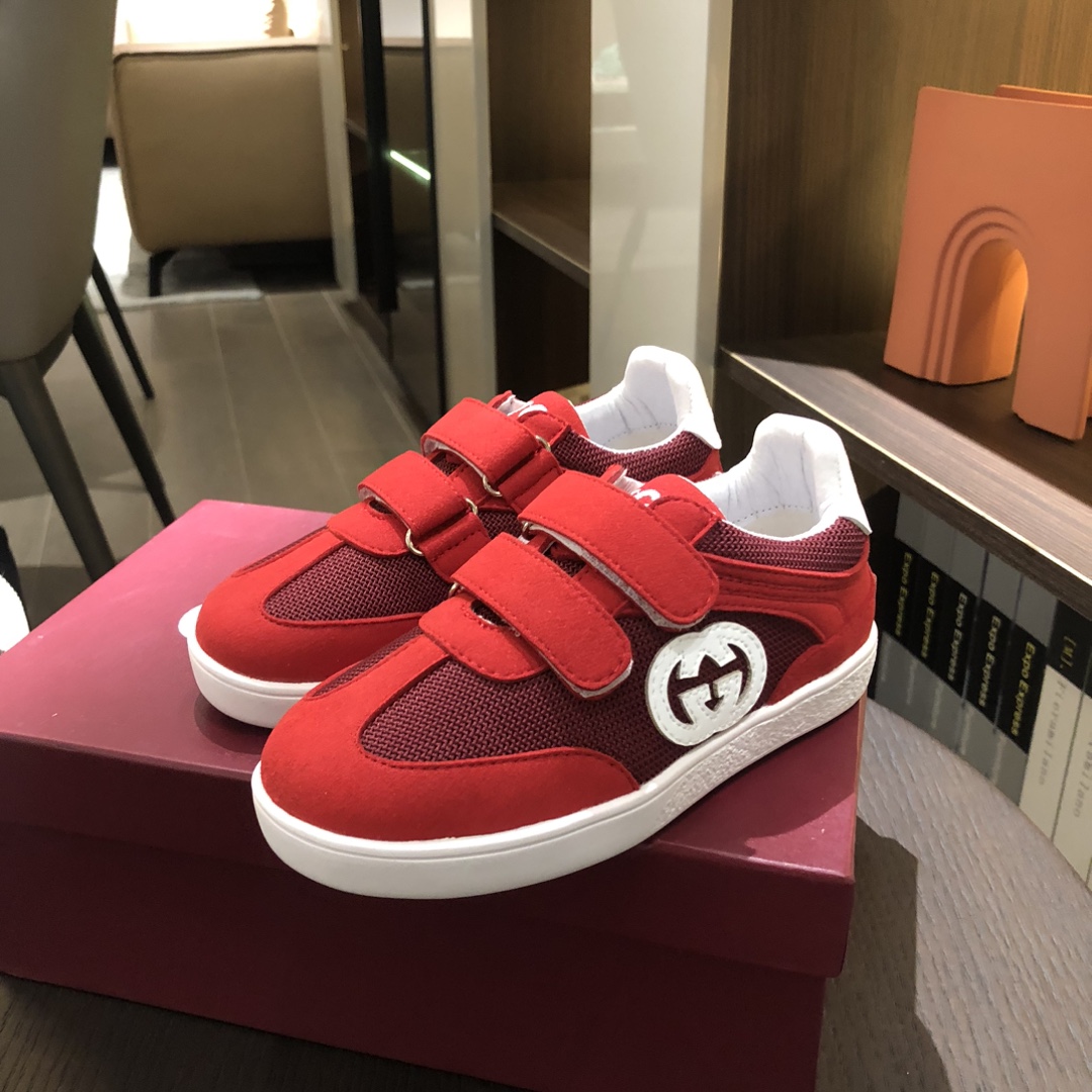 Gucikinds 2025最新款 阿甘鞋 儿童德训鞋 休闲鞋 复古时尚 魔术贴设计 上脚非常轻便舒适 丝绒皮面 网面拼接 配真皮内里 橡胶原版大底 四色 黑色 绿色 红色 白色 码数 26 27 28 29 30 31 32 33 34 35