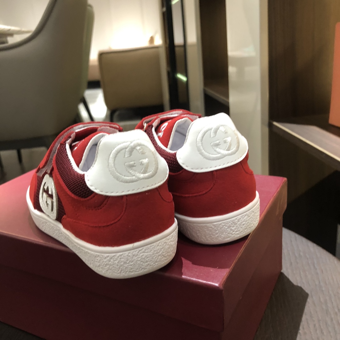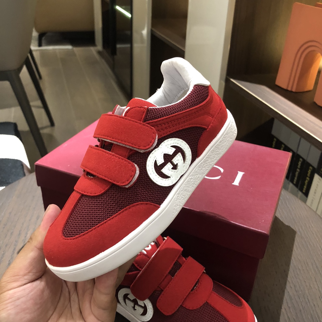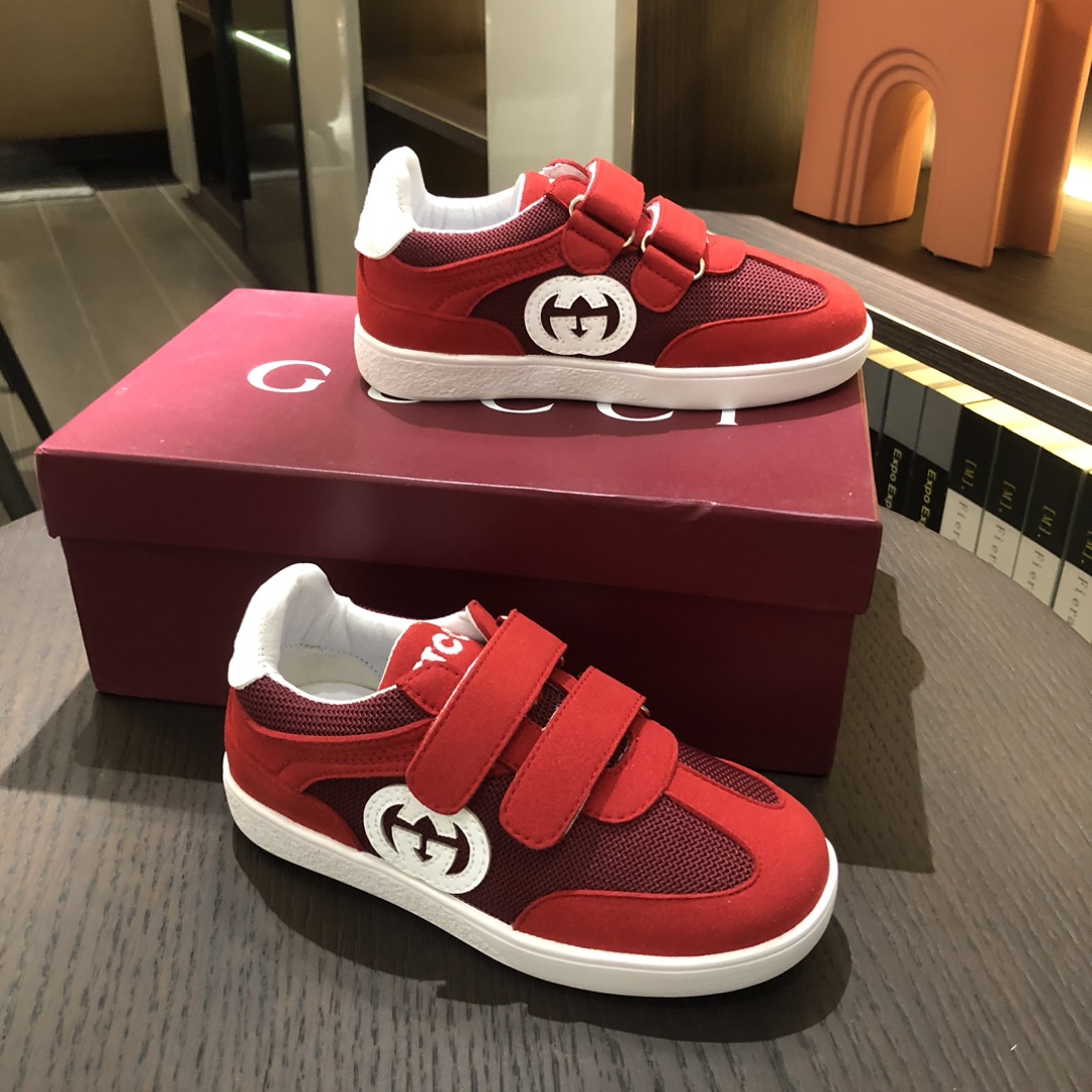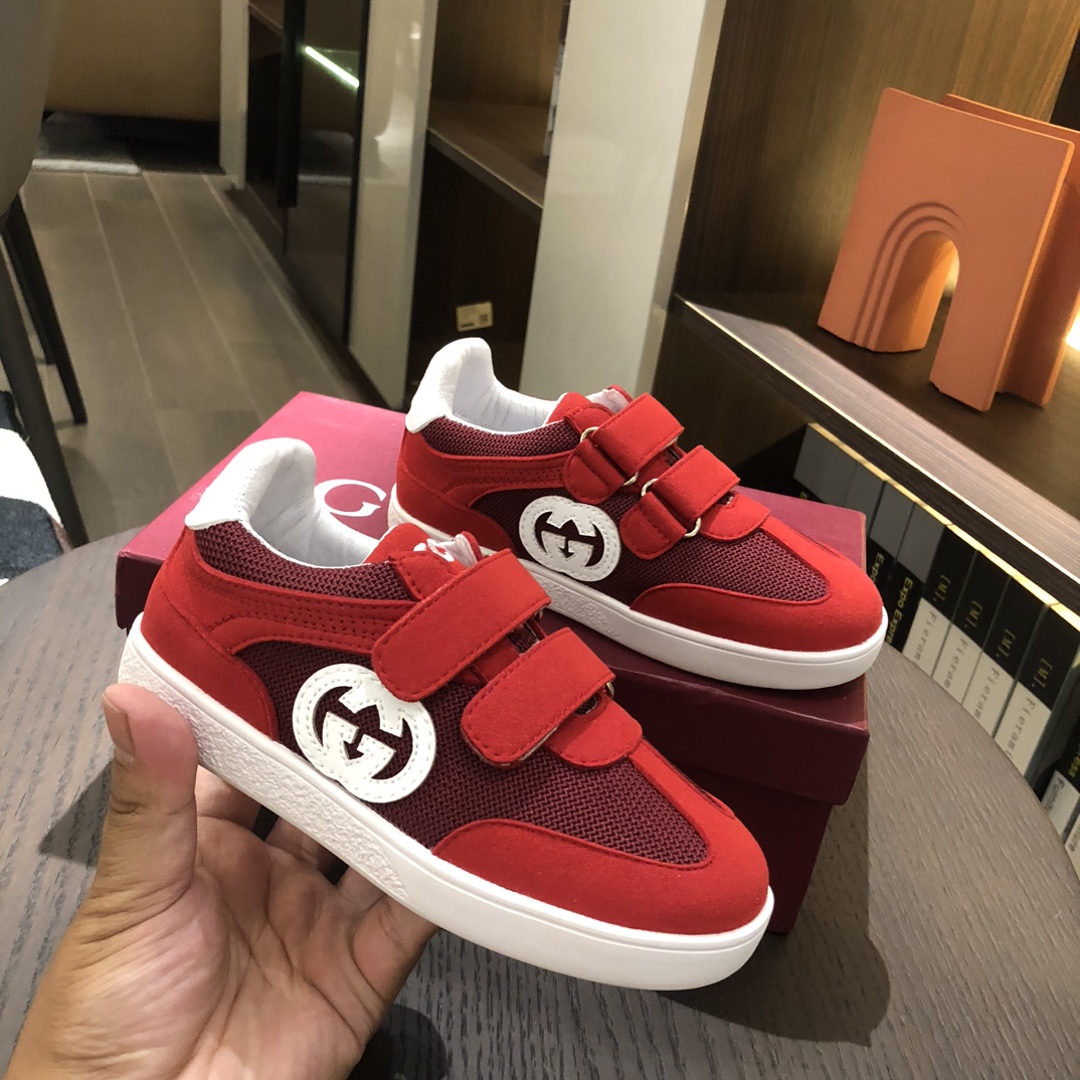Gucikinds 2025最新款 阿甘鞋 儿童德训鞋 休闲鞋 复古时尚 魔术贴设计 上脚非常轻便舒适 丝绒皮面 网面拼接 配真皮内里 橡胶原版大底 四色 黑色 绿色 红色 白色 码数 26 27 28 29 30 31 32 33 34 35
