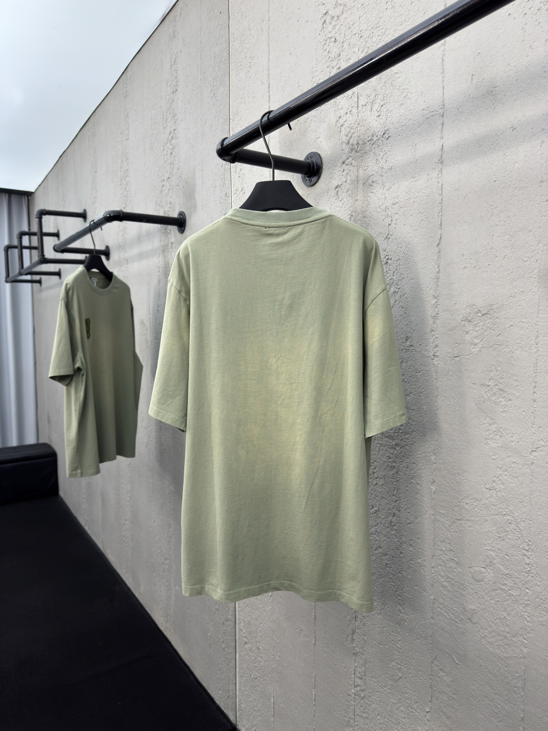 LOEWE 毛巾绣花洗水短袖 工艺说明:采用高品质纯棉面料,确保了穿着的舒适性和透气性。面料经过精心挑选,以保证柔软触感和良好的吸湿性。胸前 Anagram 毛巾布刺绣的立体图案采用了精细的工艺技术,增加了服装的质感和视觉吸引力。整体走线平直细腻,面料舒适柔软,颜色一致无色差 能与同款搭配营造时尚造型,驾驭各种场合,定制辅料,三标齐全,男女同款! ⚠️颜色:灰绿色 ⚠️尺码:XS/S/M/L