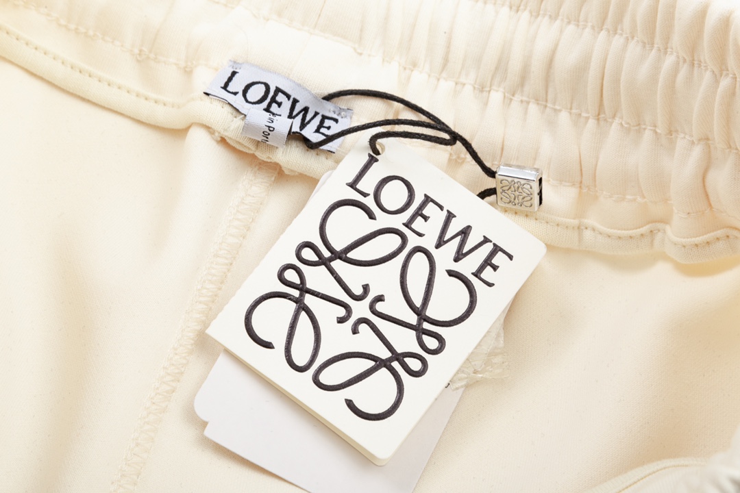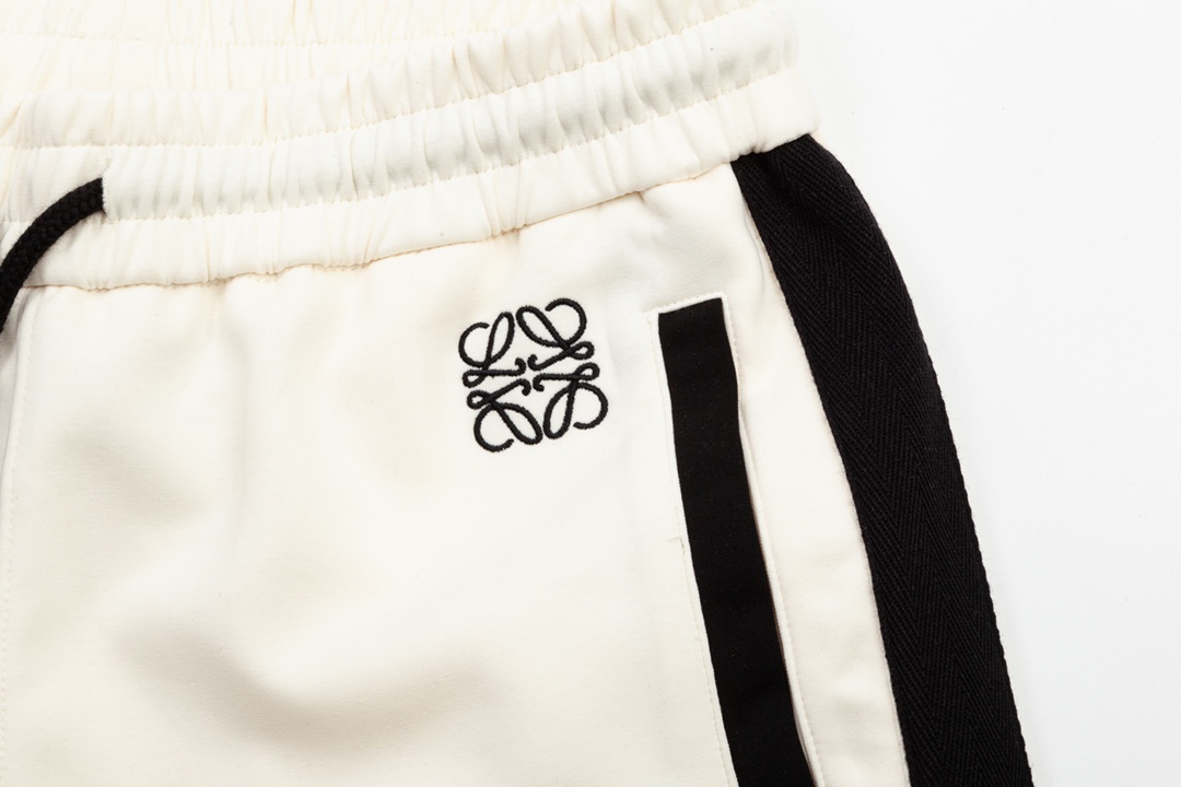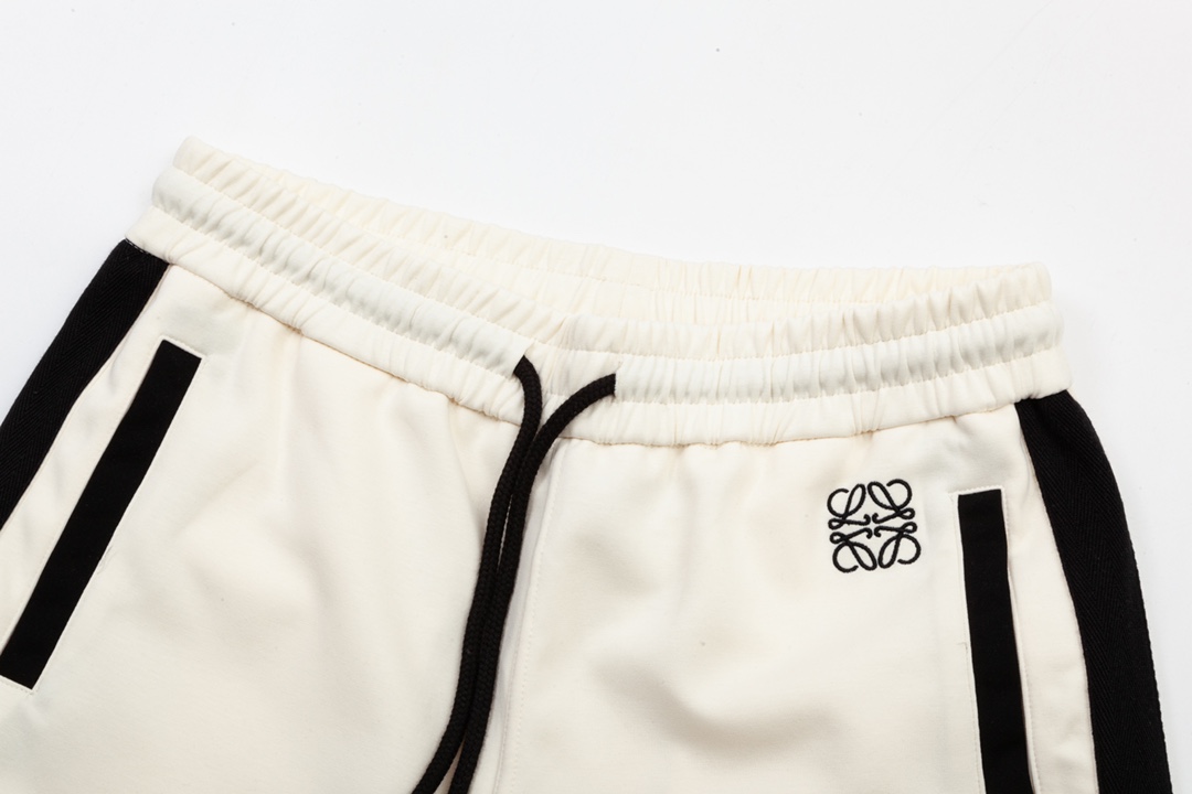 LOEWE 罗意威 织带拼接 口袋字母 LoGO标识刺绣 五分裤、高品质纯棉 面料、特别手感、超级质感 舒适柔软透气 休闲宽松版型 潮流男女同款 短裤 颜色:杏色 码数: XS S M L