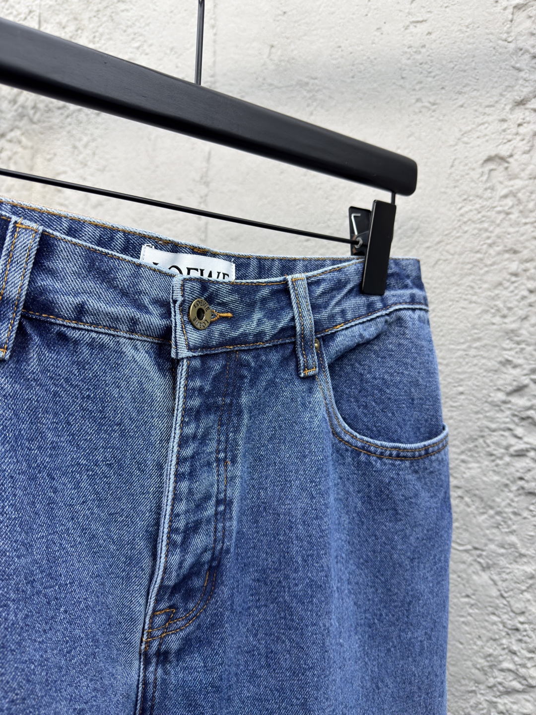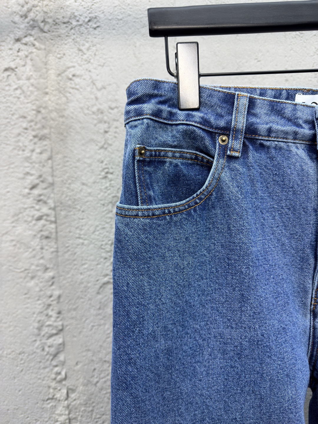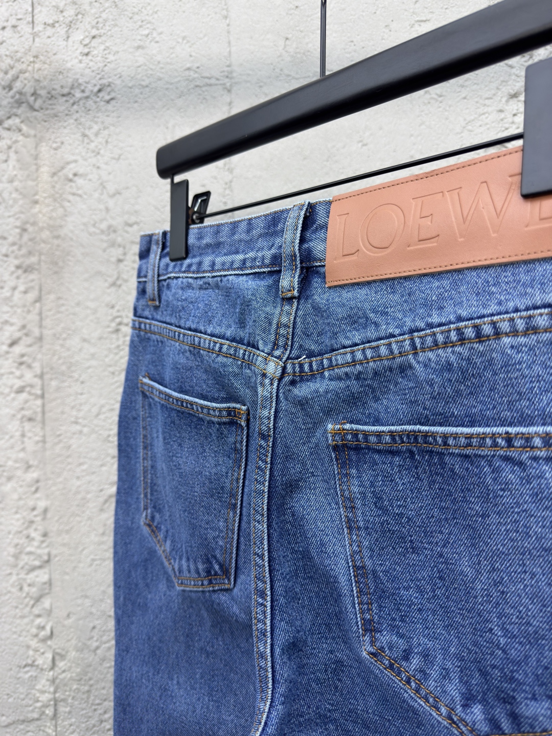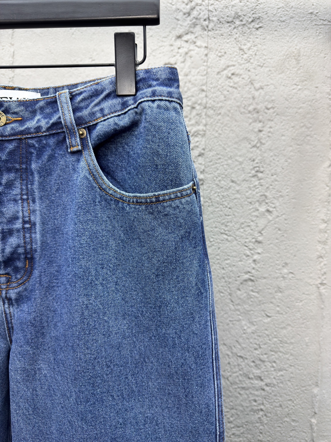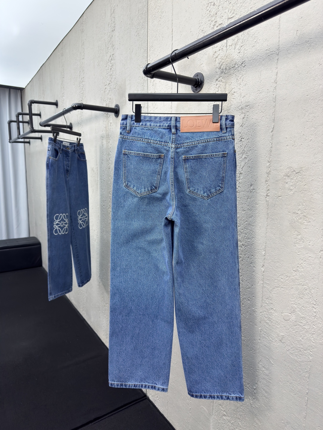 LOEWE Anagram单宁牛仔裤 工艺说明:采用紧密双芯纱 舒适贴肤 质感十足 膝盖处饰有激光切割Anagram 经典皮标采用激光切割 人工拆开裤筒 平铺出来做激光切割Anagram图案 再手工内部贴布最后再人工车缝上去 工费昂贵 损耗高 日产量低 采用进口专机红外线定位“Loewe 皮标” 位置更为精准 牢固结实 采用洗水炒色工艺 优先选择特制的退浆剂 再讲布料浸泡其中 均匀受浆 退浆后 最终再进行漂洗 做工复杂至极 男女同款! ⚠️颜色:蓝色 ⚠️Size:46/48/50/52