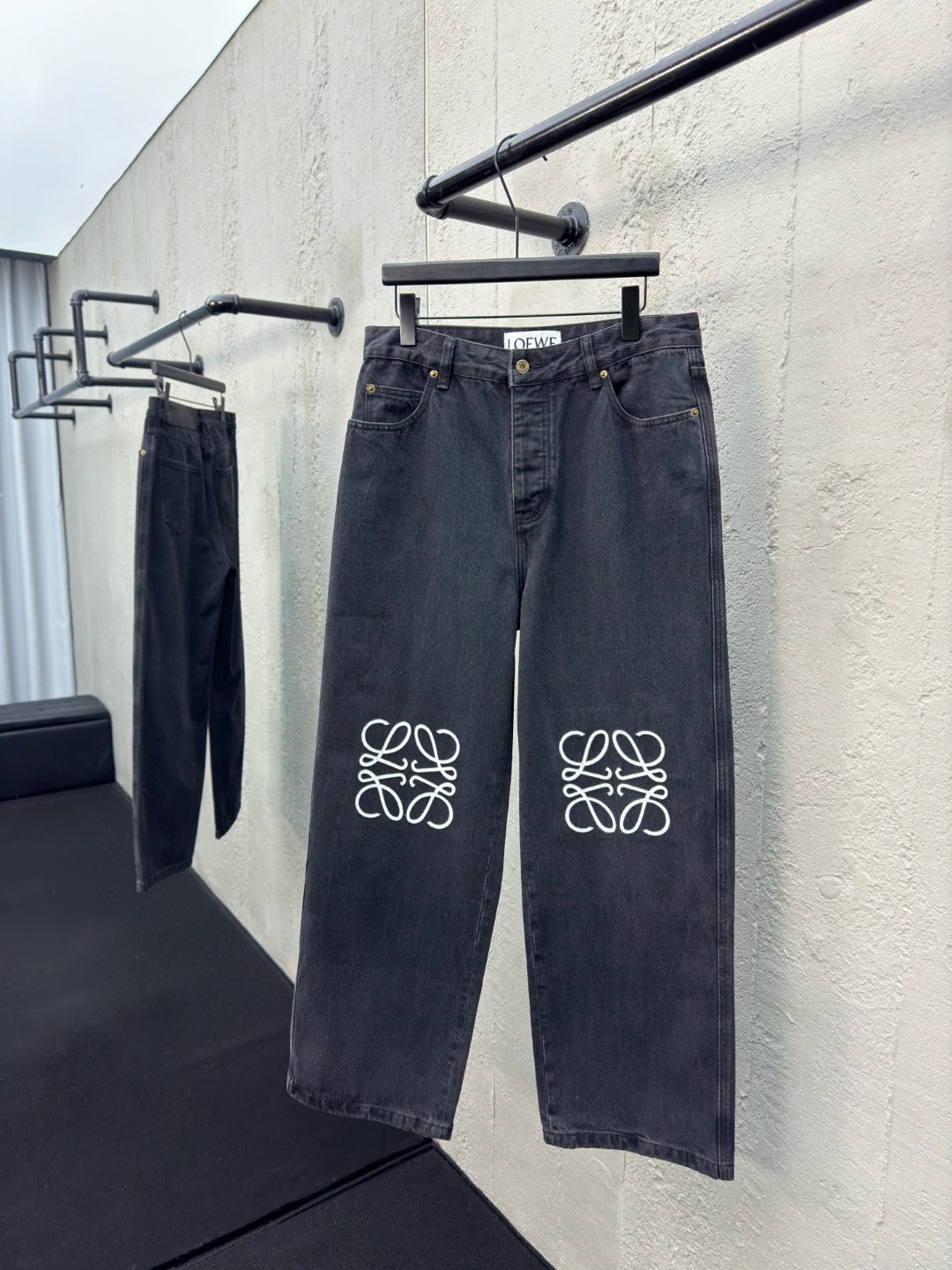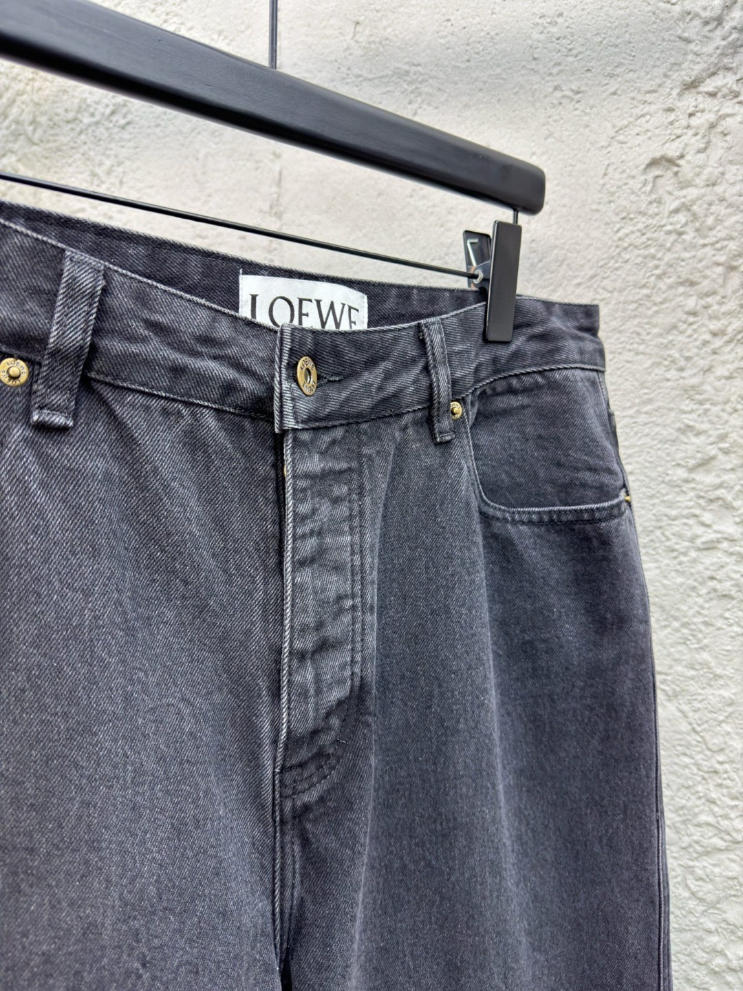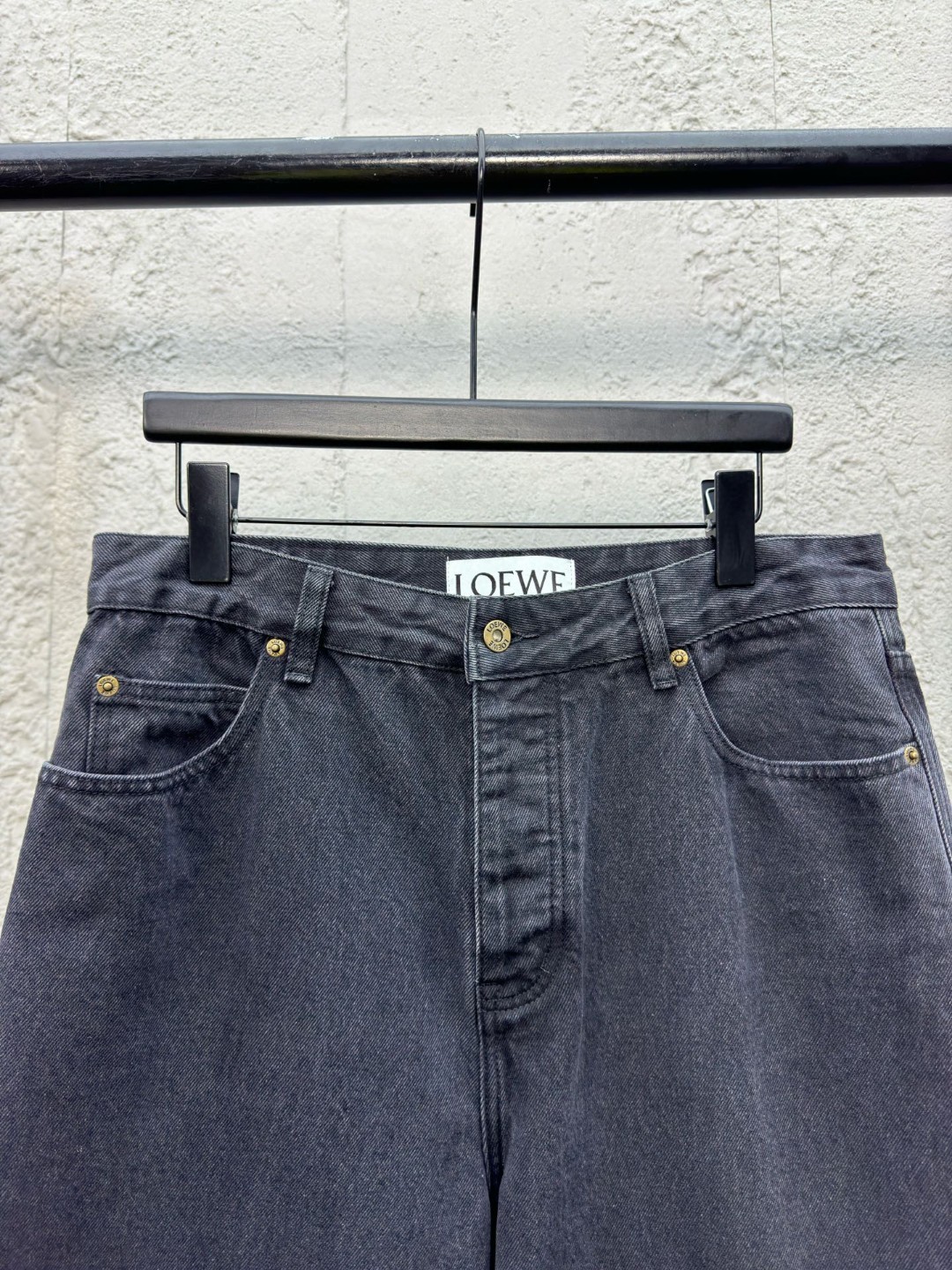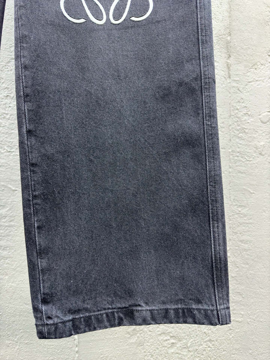 LOEWE Anagram单宁牛仔裤 工艺说明:采用紧密双芯纱 舒适贴肤 质感十足 膝盖处饰有激光切割Anagram 经典皮标采用激光切割 人工拆开裤筒 平铺出来做激光切割Anagram图案 再手工内部贴布最后再人工车缝上去 工费昂贵 损耗高 日产量低 采用进口专机红外线定位“Loewe 皮标” 位置更为精准 牢固结实 采用洗水炒色工艺 优先选择特制的退浆剂 再讲布料浸泡其中 均匀受浆 退浆后 最终再进行漂洗 做工复杂至极 男女同款! ⚠️颜色:黑色 ⚠️Size:46/48/50/52