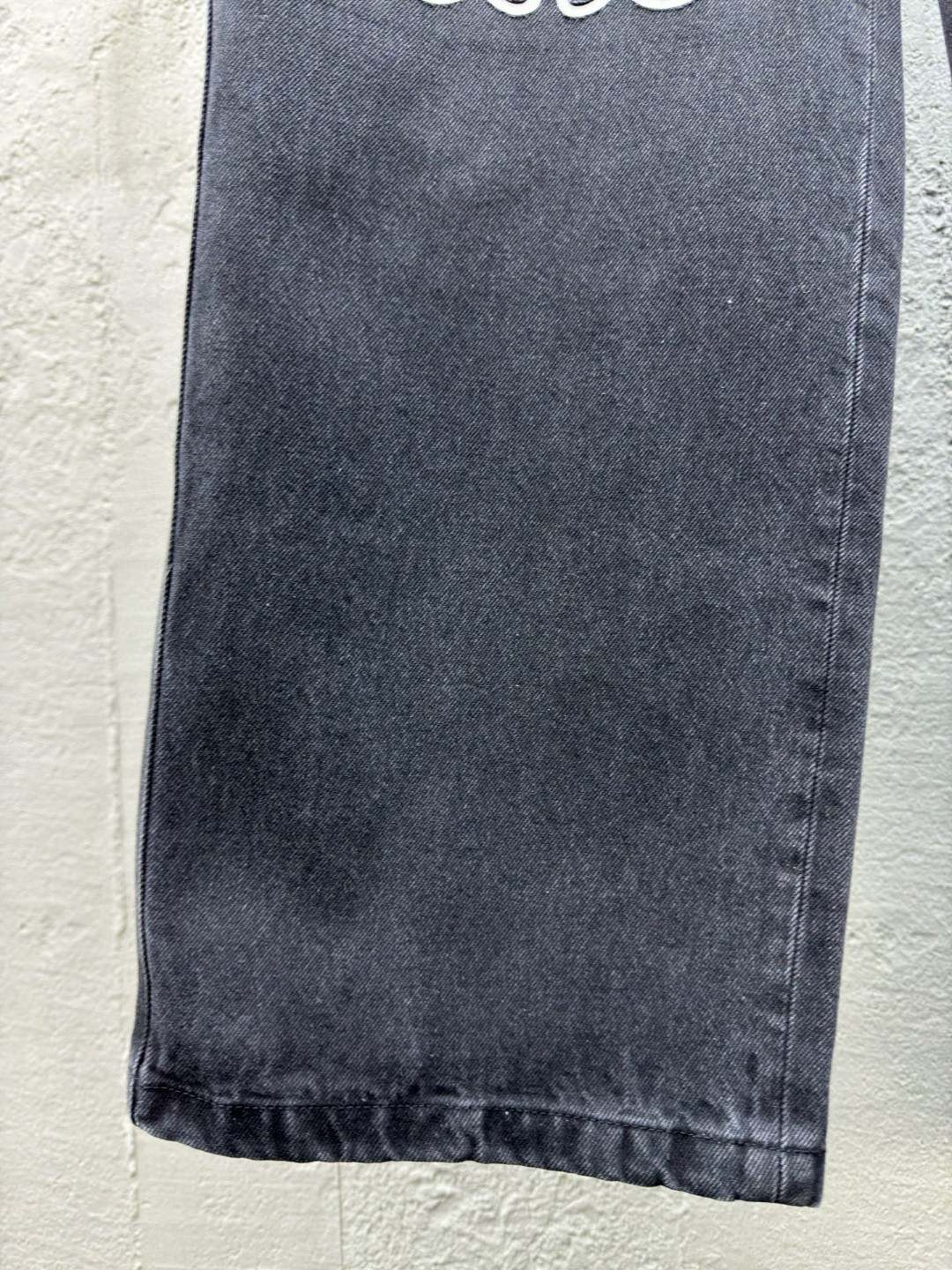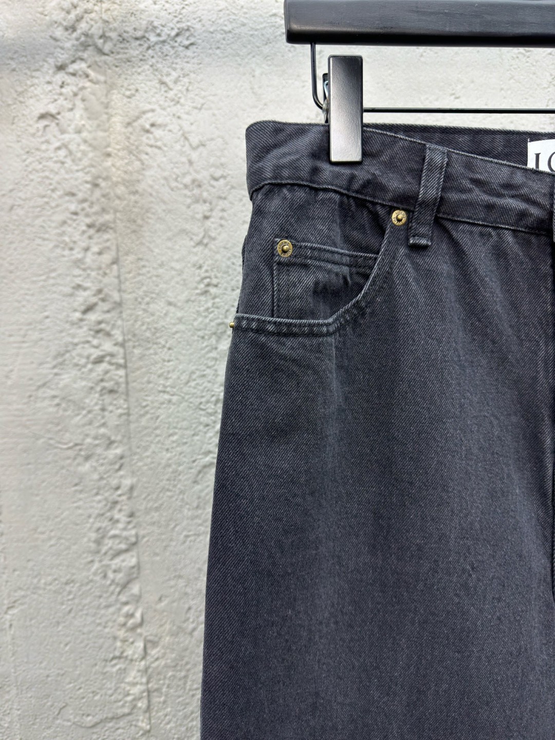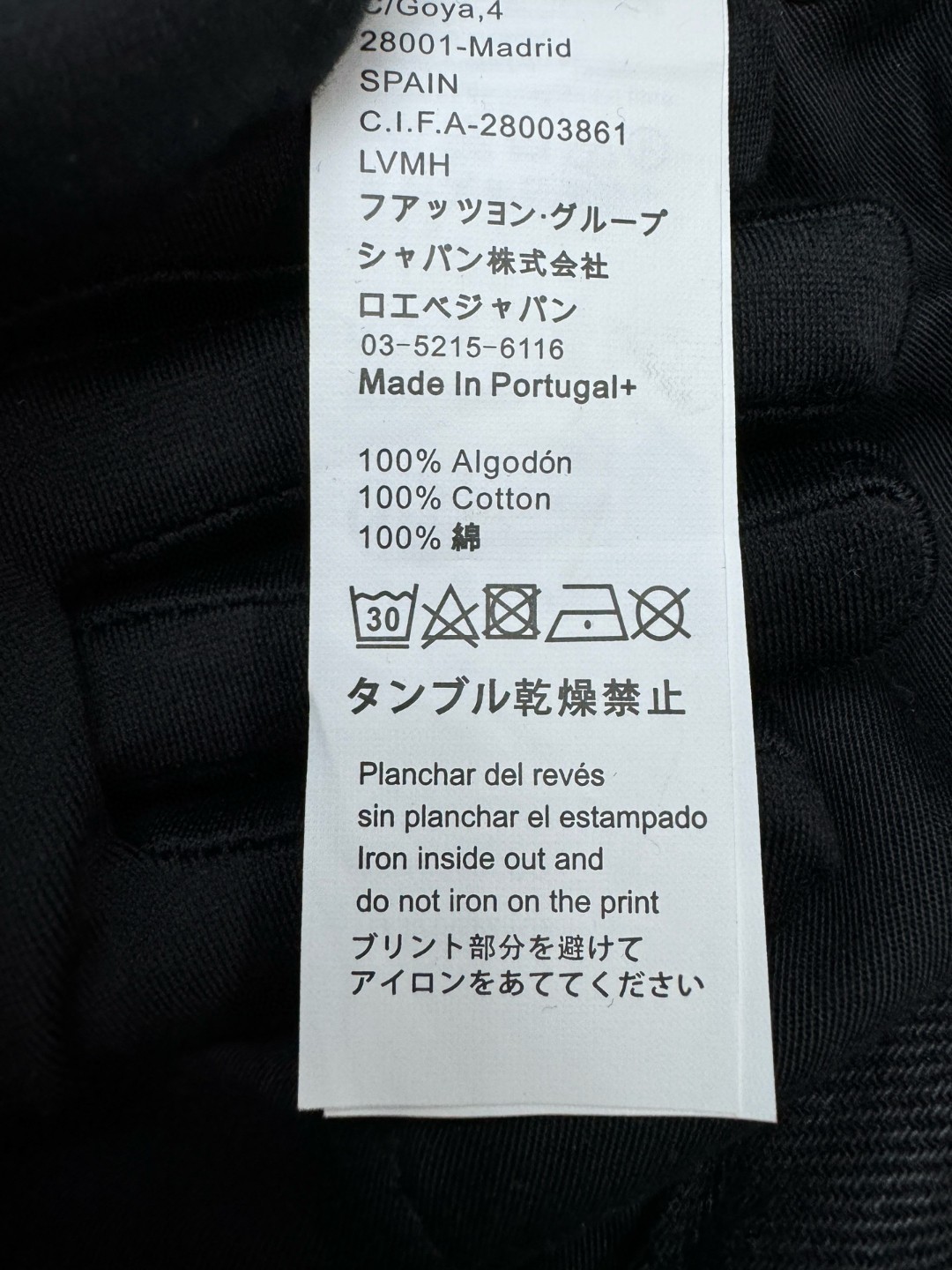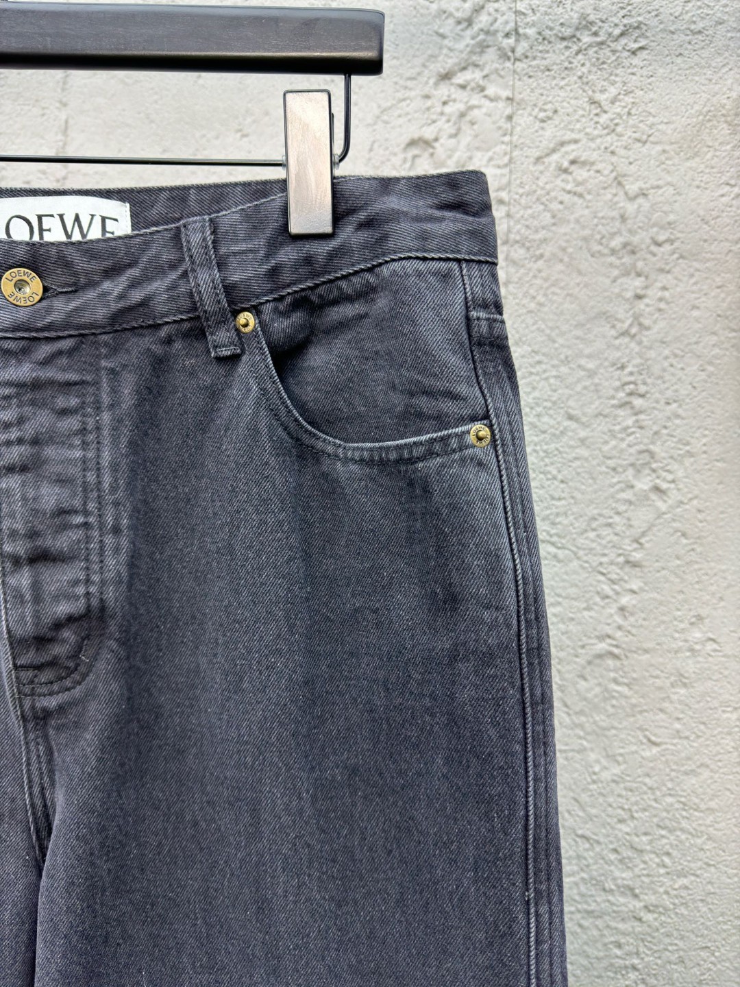 LOEWE Anagram单宁牛仔裤 工艺说明:采用紧密双芯纱 舒适贴肤 质感十足 膝盖处饰有激光切割Anagram 经典皮标采用激光切割 人工拆开裤筒 平铺出来做激光切割Anagram图案 再手工内部贴布最后再人工车缝上去 工费昂贵 损耗高 日产量低 采用进口专机红外线定位“Loewe 皮标” 位置更为精准 牢固结实 采用洗水炒色工艺 优先选择特制的退浆剂 再讲布料浸泡其中 均匀受浆 退浆后 最终再进行漂洗 做工复杂至极 男女同款! ⚠️颜色:黑色 ⚠️Size:46/48/50/52