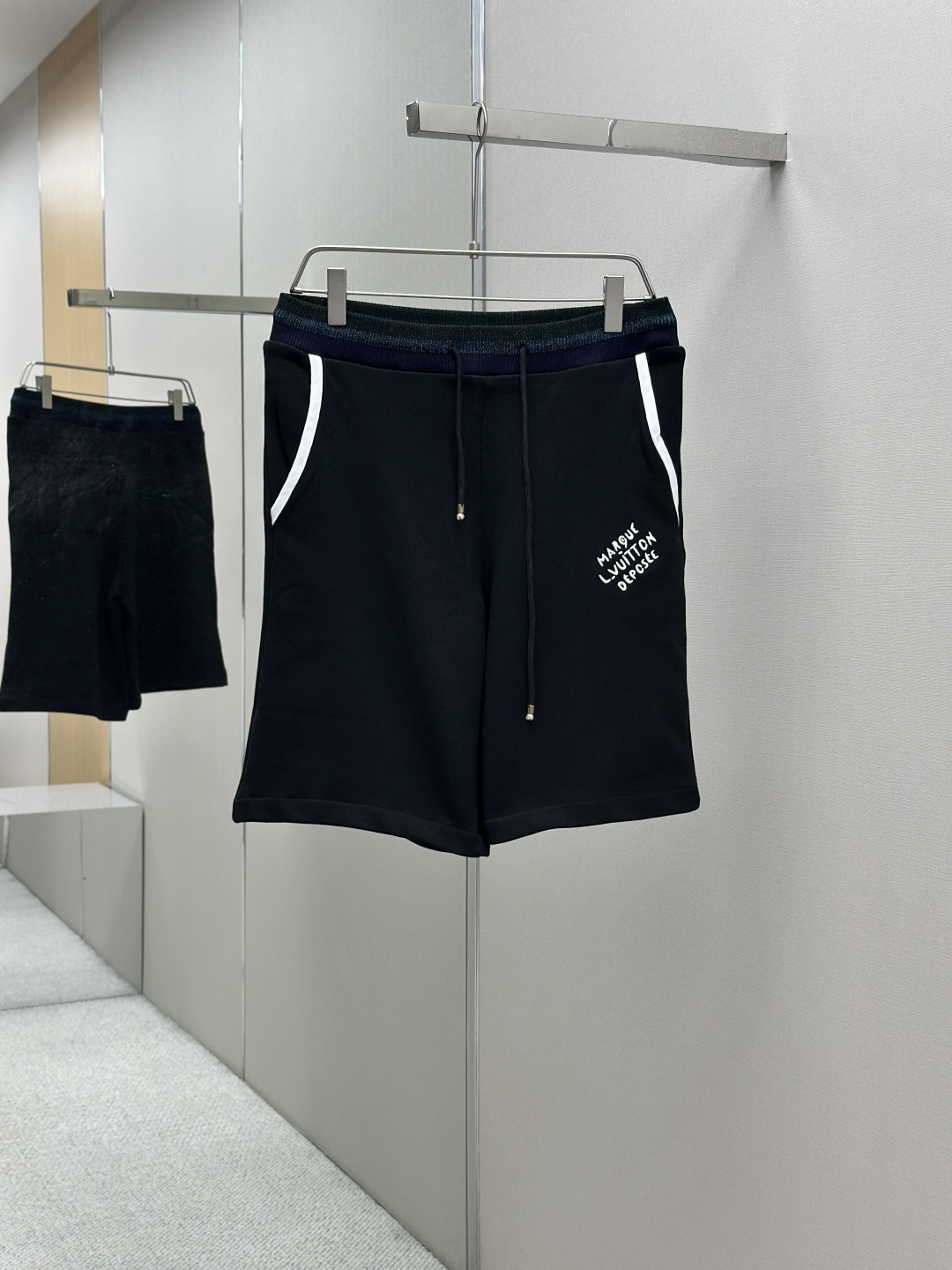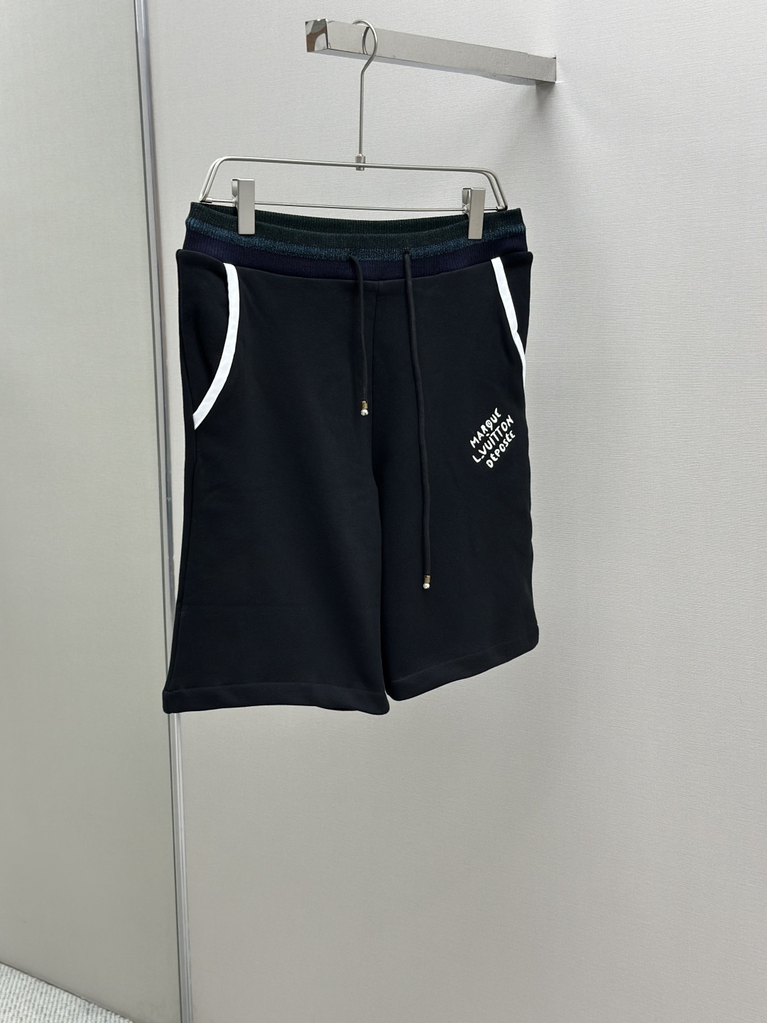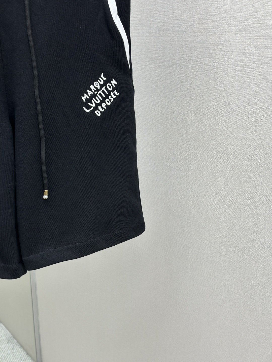 LOUIS VUITTON 学院风标识刺绣短裤 工艺说明:定制双股纱臻选棉质卫衣织料,以莹泽虹彩罗纹点亮腰部,恰似夜空中乍现的绚烂极光,两侧的白色织带简洁利落。左腿呈现LV标识刺绣如同艺术家笔下细腻的笔触,增添了一抹神秘而华丽的气息。整体走线平直细腻,面料舒适柔软,颜色一致无色差 能与同款搭配营造时尚造型,驾驭各种场合,定制辅料,三标齐全,男女同款! 颜色:黑色 Size:SMLXL
