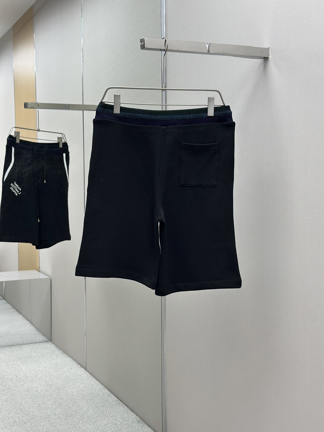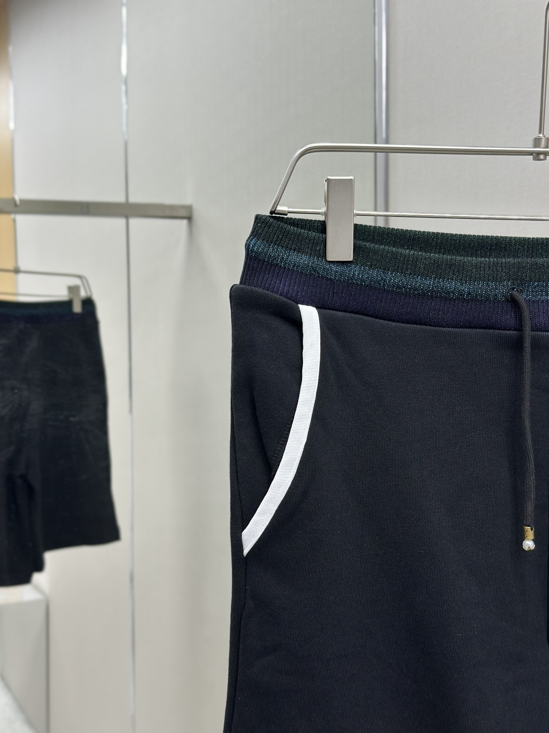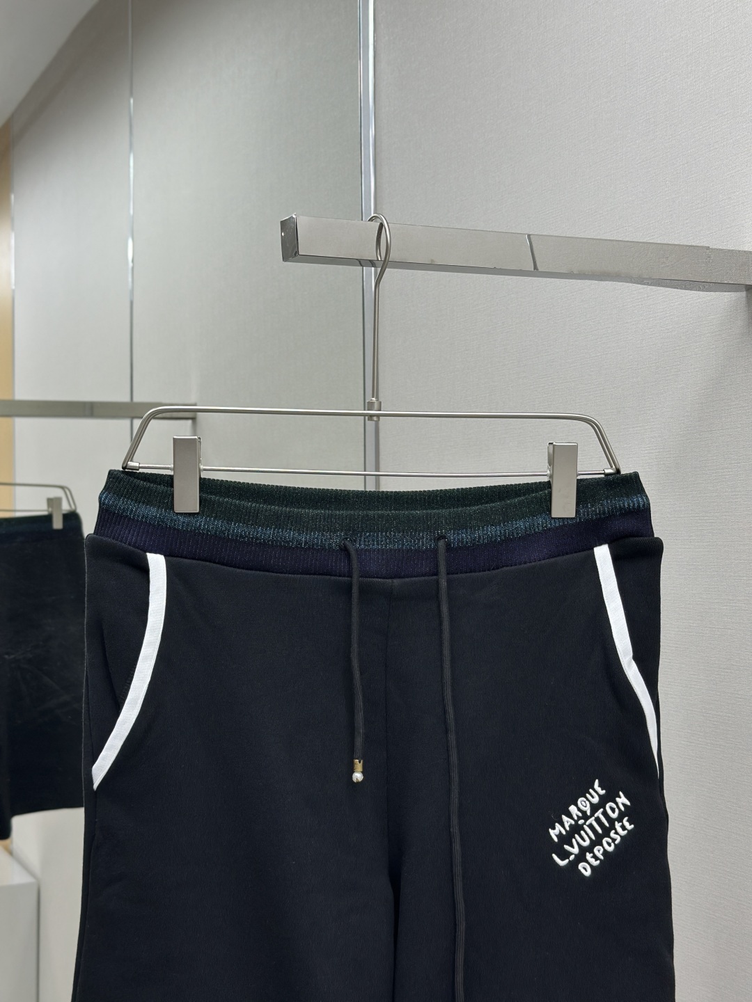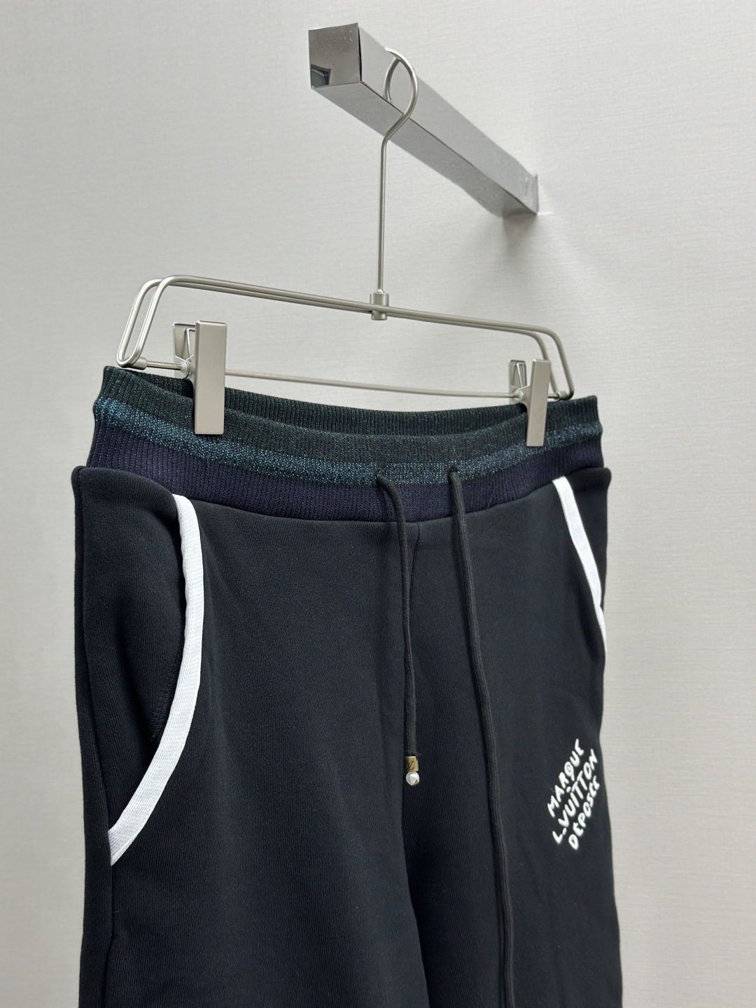 LOUIS VUITTON 学院风标识刺绣短裤 工艺说明:定制双股纱臻选棉质卫衣织料,以莹泽虹彩罗纹点亮腰部,恰似夜空中乍现的绚烂极光,两侧的白色织带简洁利落。左腿呈现LV标识刺绣如同艺术家笔下细腻的笔触,增添了一抹神秘而华丽的气息。整体走线平直细腻,面料舒适柔软,颜色一致无色差 能与同款搭配营造时尚造型,驾驭各种场合,定制辅料,三标齐全,男女同款! 颜色:黑色 Size:SMLXL