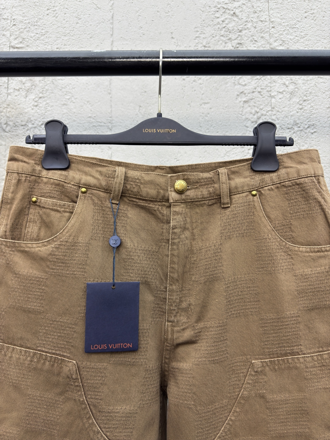 LOUIS VUITTON 棋盘格牛仔短裤 工艺说明:将 Marque LVuitton dleposee 标识融入 Damier 提花帆布,再以水洗工艺营造做旧效果。珠光纽扣流露丹迪意味,中性色调可轻松混搭体闲造型。整体走线平直细腻,面料舒适柔软,颜色一致无色差 能与同款搭配营造时尚造型,驾驭各种场合,定制辅料,三标齐全,男女同款! ⚠️颜色:棕色 ⚠️Size:29/30/31/32