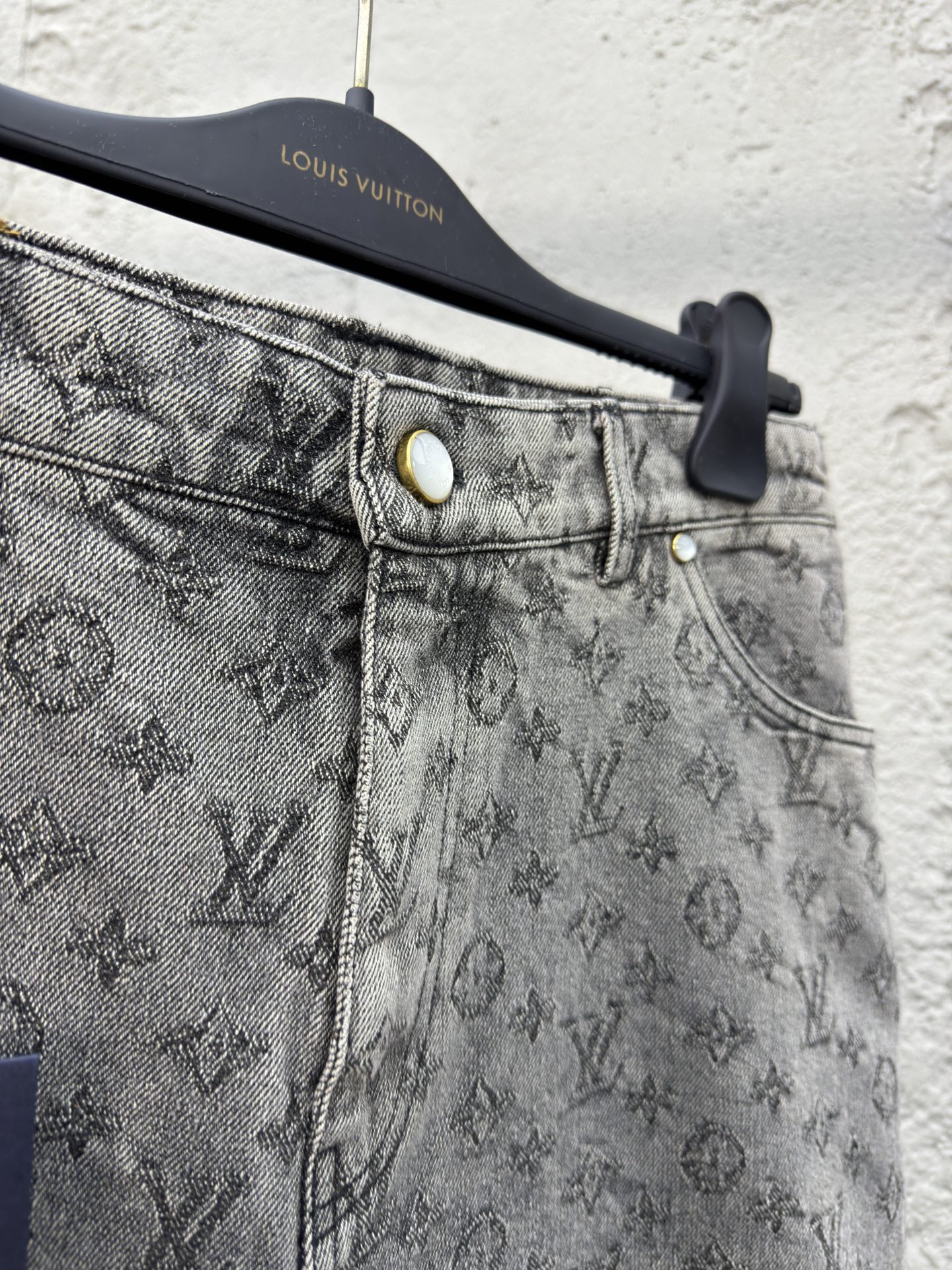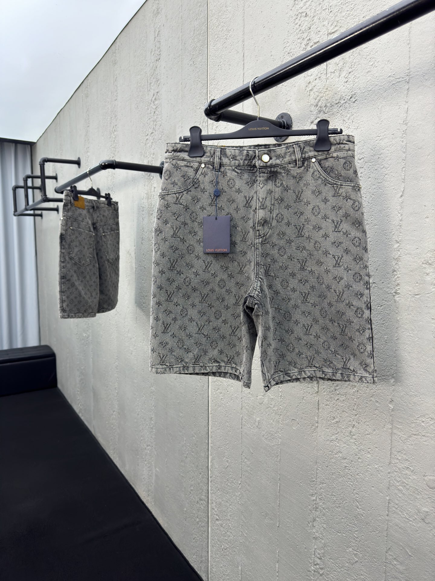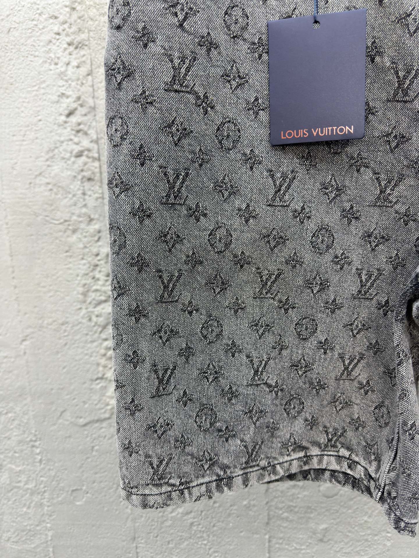 LOUIS VUITTON 重工水洗满印牛仔短裤 工艺说明:采用深灰色洗水牛仔面料打造,全幅提花图案设计,刻字白色珠扣纽扣开合门襟,直筒剪裁版型设计,满身徽标构成品牌经典图案,由意大利进口高密度器械制造,原胚底不含氨纶几乎无弹,传达牛仔单品本身的拙朴质感,通过洗水及砂石打磨,形成做旧质感,色泽过度自然,整体走线平直细腻,面料舒适柔软,颜色一致无色差 能与同款搭配营造时尚造型,驾驭各种场合,定制辅料,三标齐全,男女同款! ⚠️颜色:灰色 ⚠️Size:S/M/L/XL
