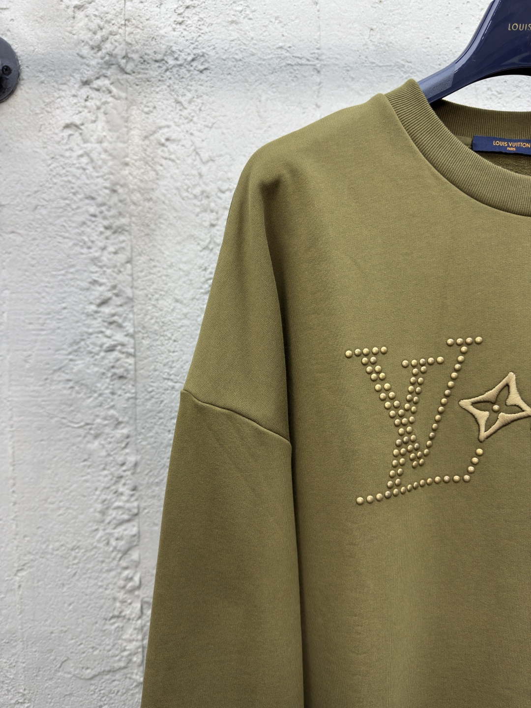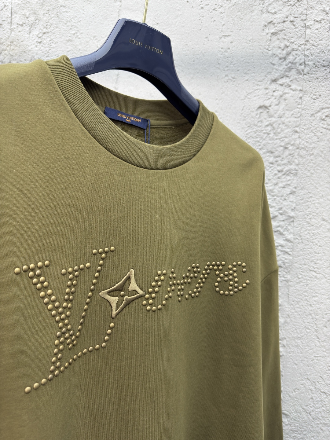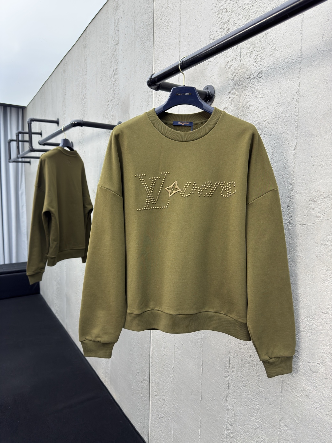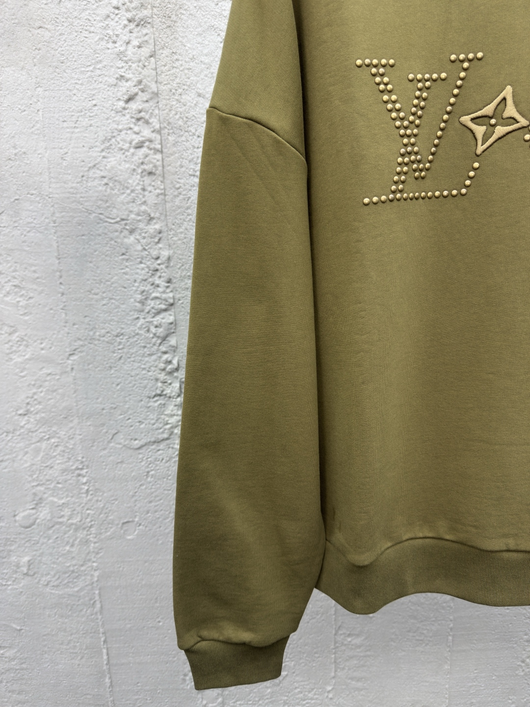 LOUIS VUITTON 金属烫钻卫衣 工艺说明:面料采用32s双纱大卫衣布,克重400g,配套21s双纱1*1横版机织造螺纹,购入Y版订染大货面料罗纹颜色,前后幅采用日本进口田岛绣花机刺绣,前幅丝光线立体胶包边绣,前幅采用高温烫钻工艺,金属钻对版滚镀颜色,底面涂层热熔胶,手工排版扫钻做花型图稿,扫粉定位裁片高温压烫一体成型 ⚠️颜色:墨绿色 ⚠️Size:XS/S/M/L