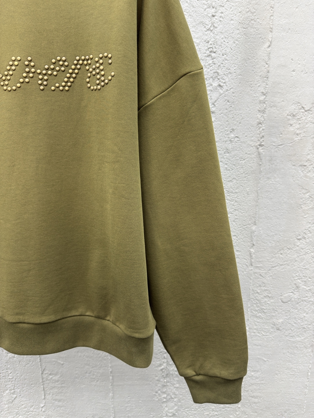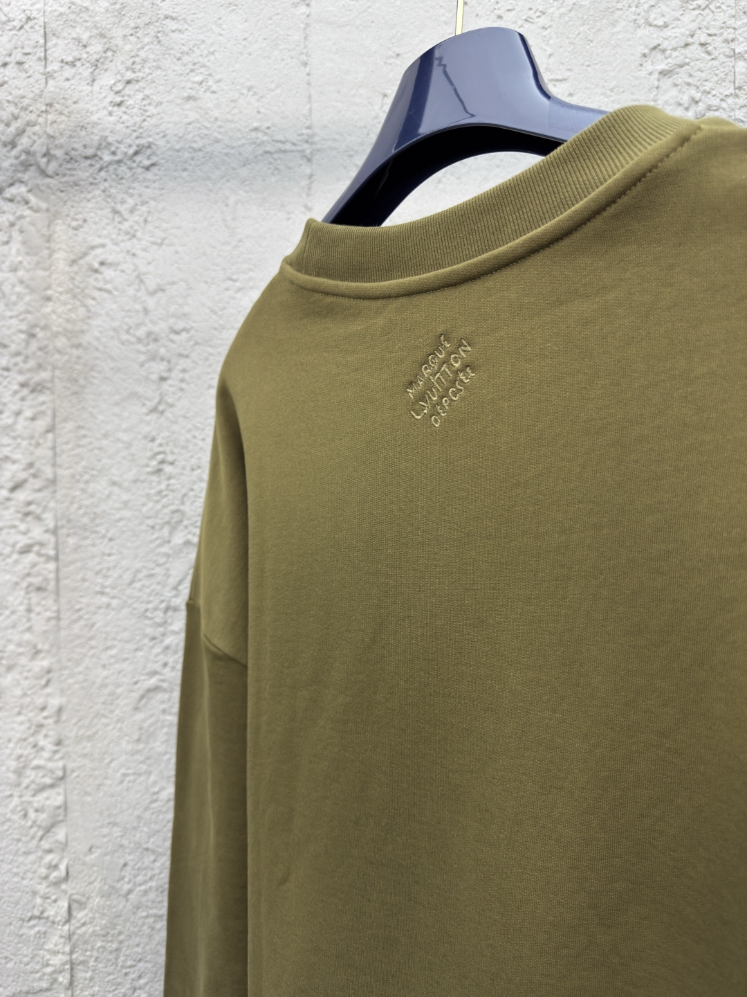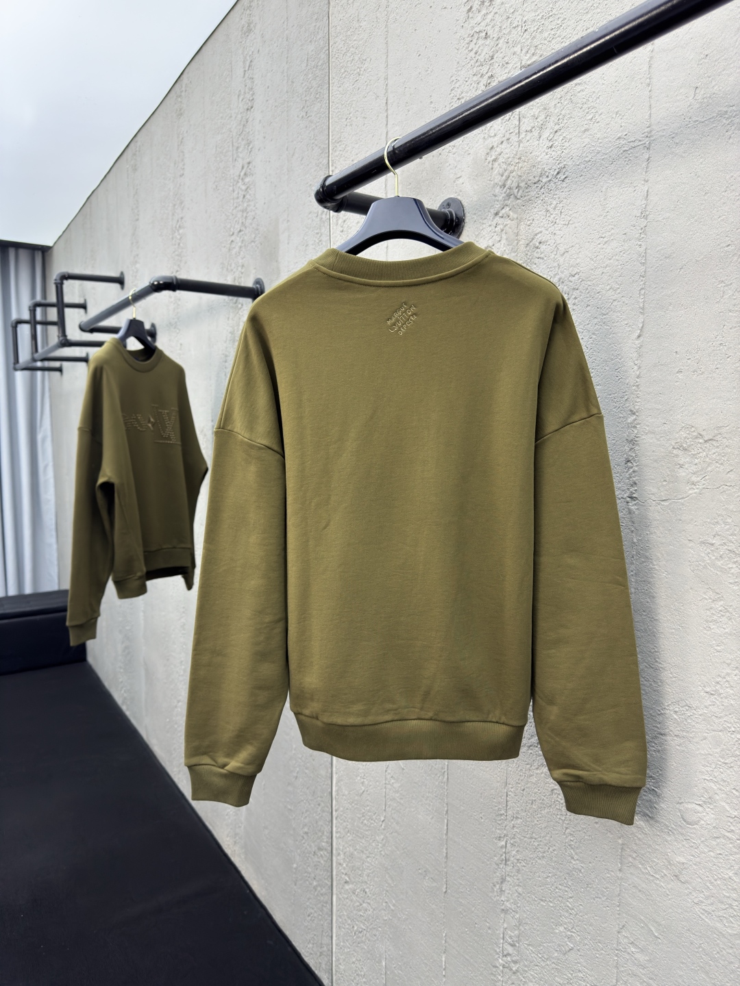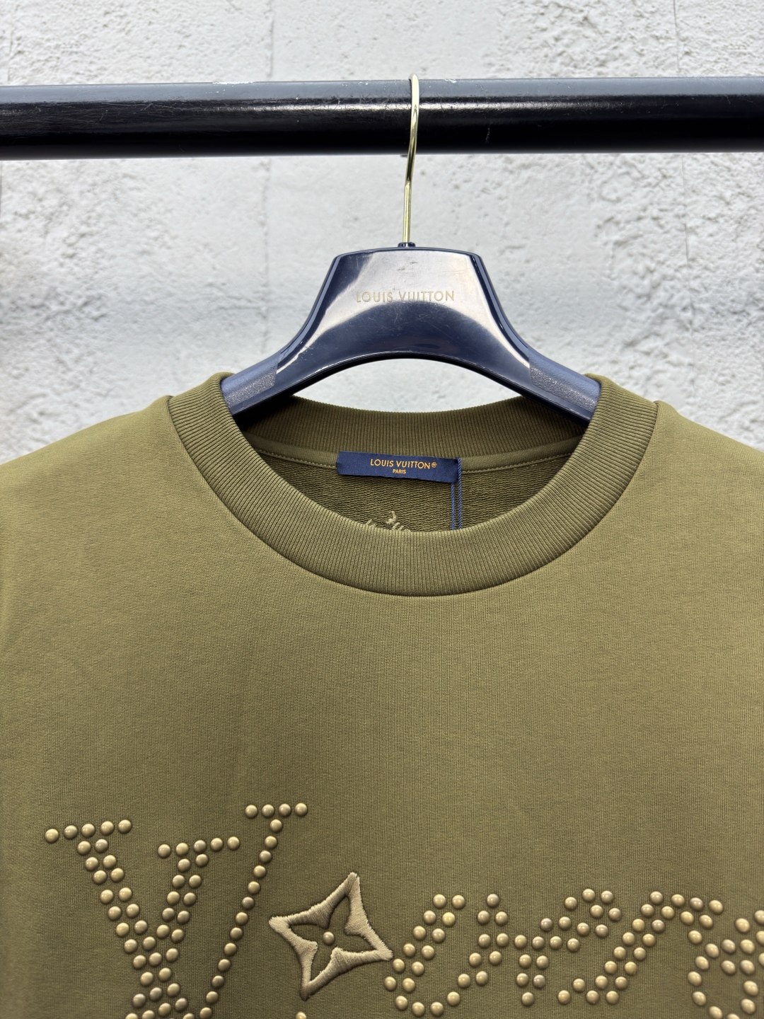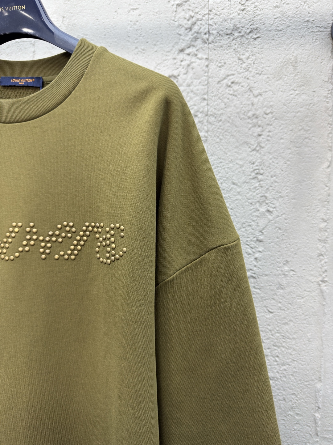LOUIS VUITTON 金属烫钻卫衣 工艺说明:面料采用32s双纱大卫衣布,克重400g,配套21s双纱1*1横版机织造螺纹,购入Y版订染大货面料罗纹颜色,前后幅采用日本进口田岛绣花机刺绣,前幅丝光线立体胶包边绣,前幅采用高温烫钻工艺,金属钻对版滚镀颜色,底面涂层热熔胶,手工排版扫钻做花型图稿,扫粉定位裁片高温压烫一体成型 ⚠️颜色:墨绿色 ⚠️Size:XS/S/M/L