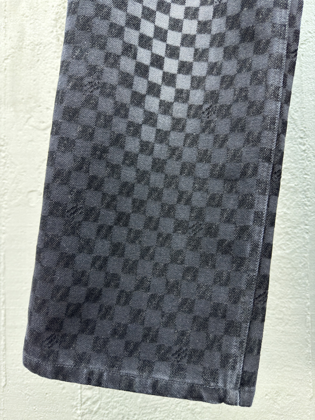 LOUIS VUITTON 格子渐变植绒牛仔裤 工艺说明:采用斜纹棉丹宁面料,多重酵素水洗工艺处理,打造柔和自然的褪色效果,后部呈现正绒面革标签,以细腻笔触玩味当季深邃设计,全幅植绒图案和标识烘托丰盈肌理,标识铭纹珠光纽扣点睛细节,整体走线平直细腻,面料舒适柔软,颜色一致无色差 能与同款搭配营造时尚造型,驾驭各种场合,定制辅料,三标齐全,男女同款! ⚠️颜色:黑色 ⚠️Size:29/30/31/32