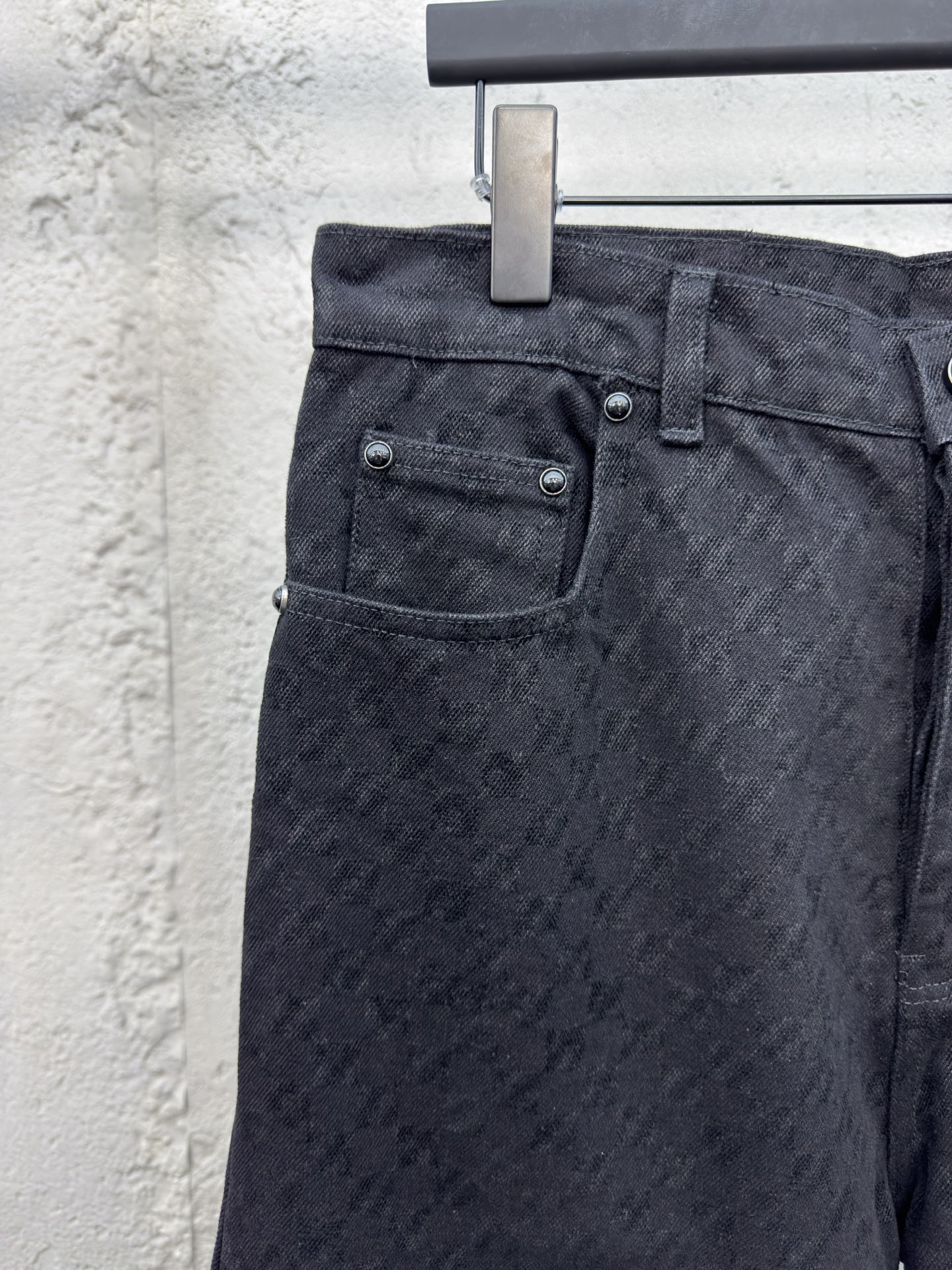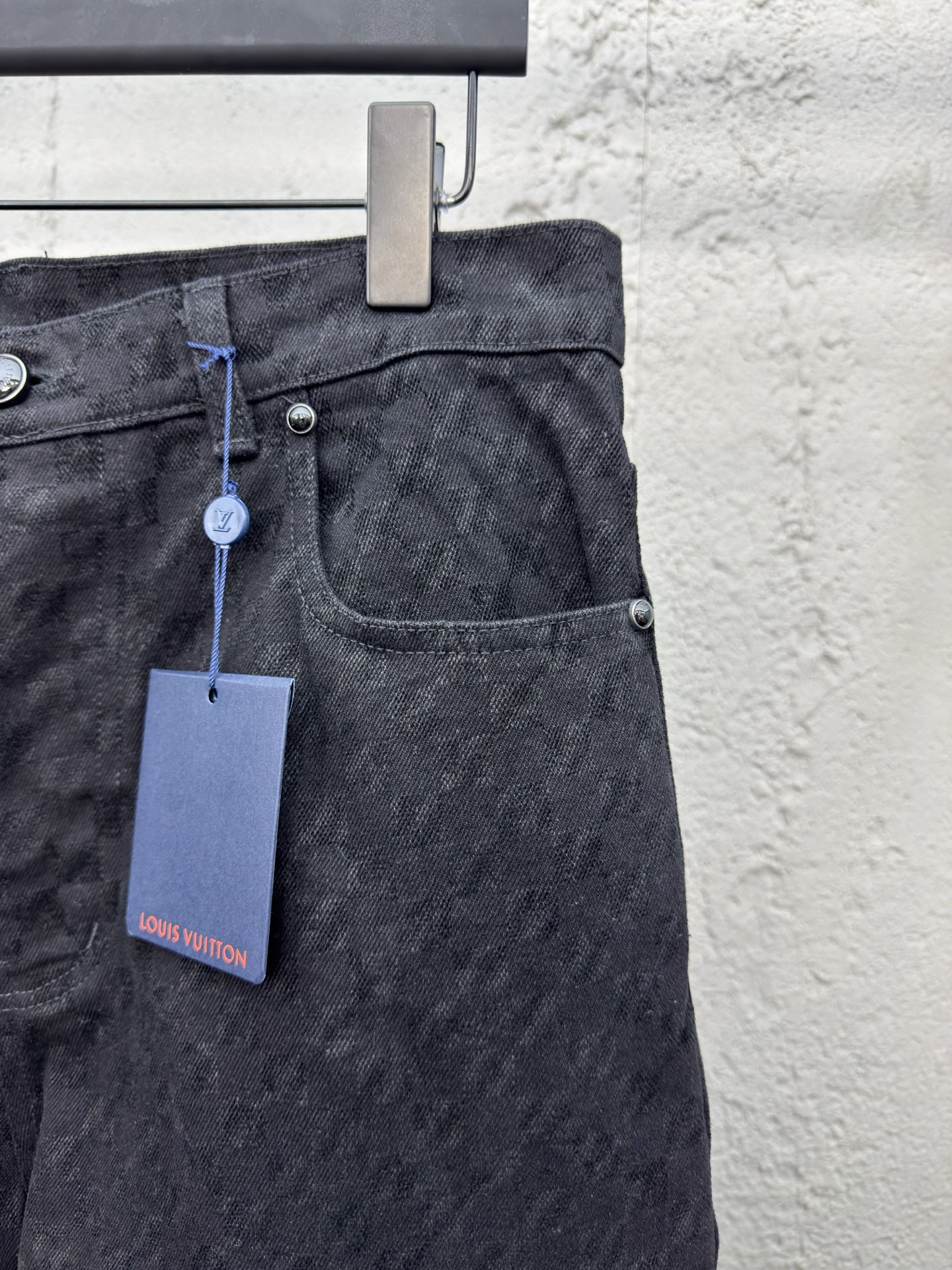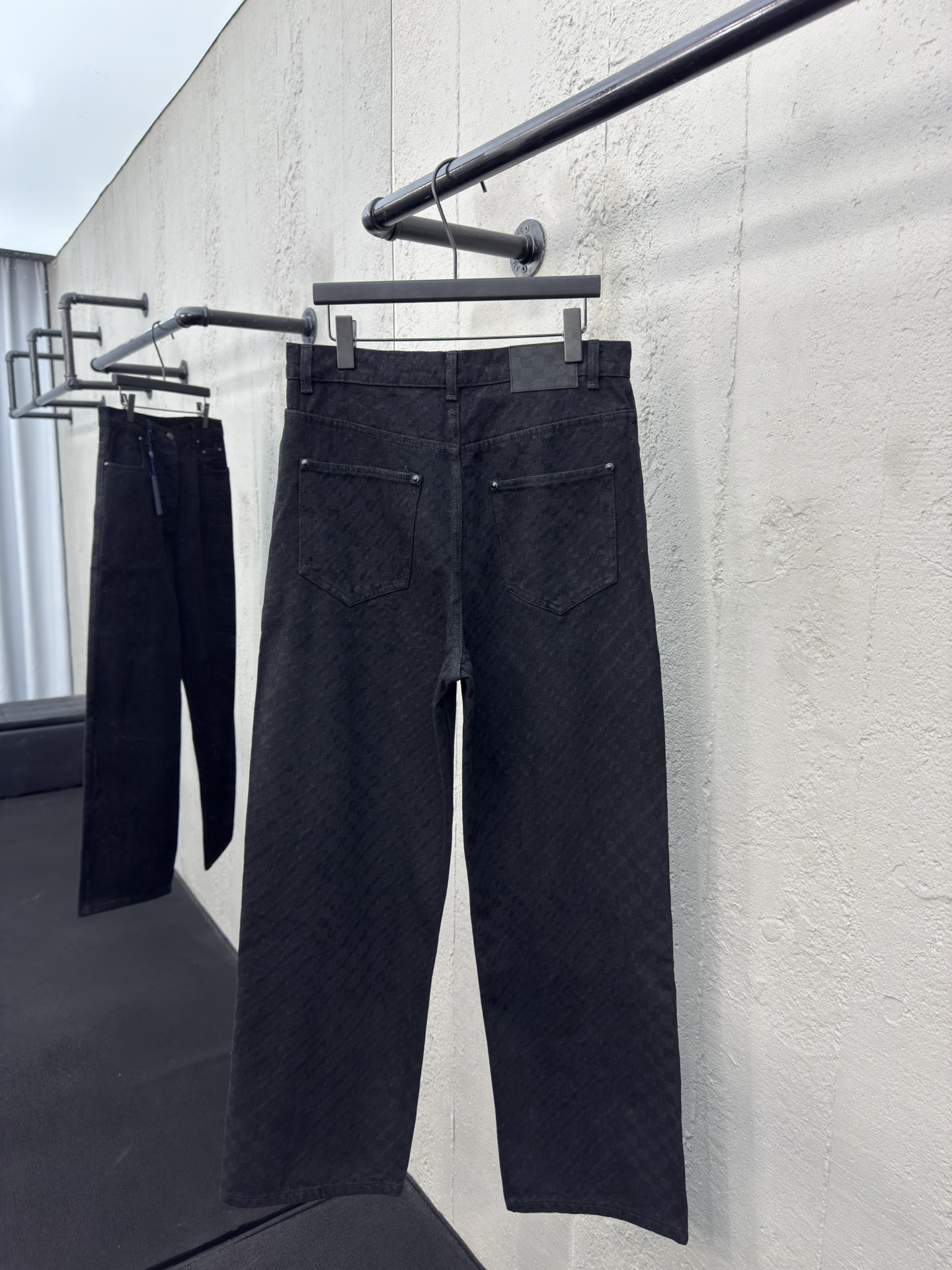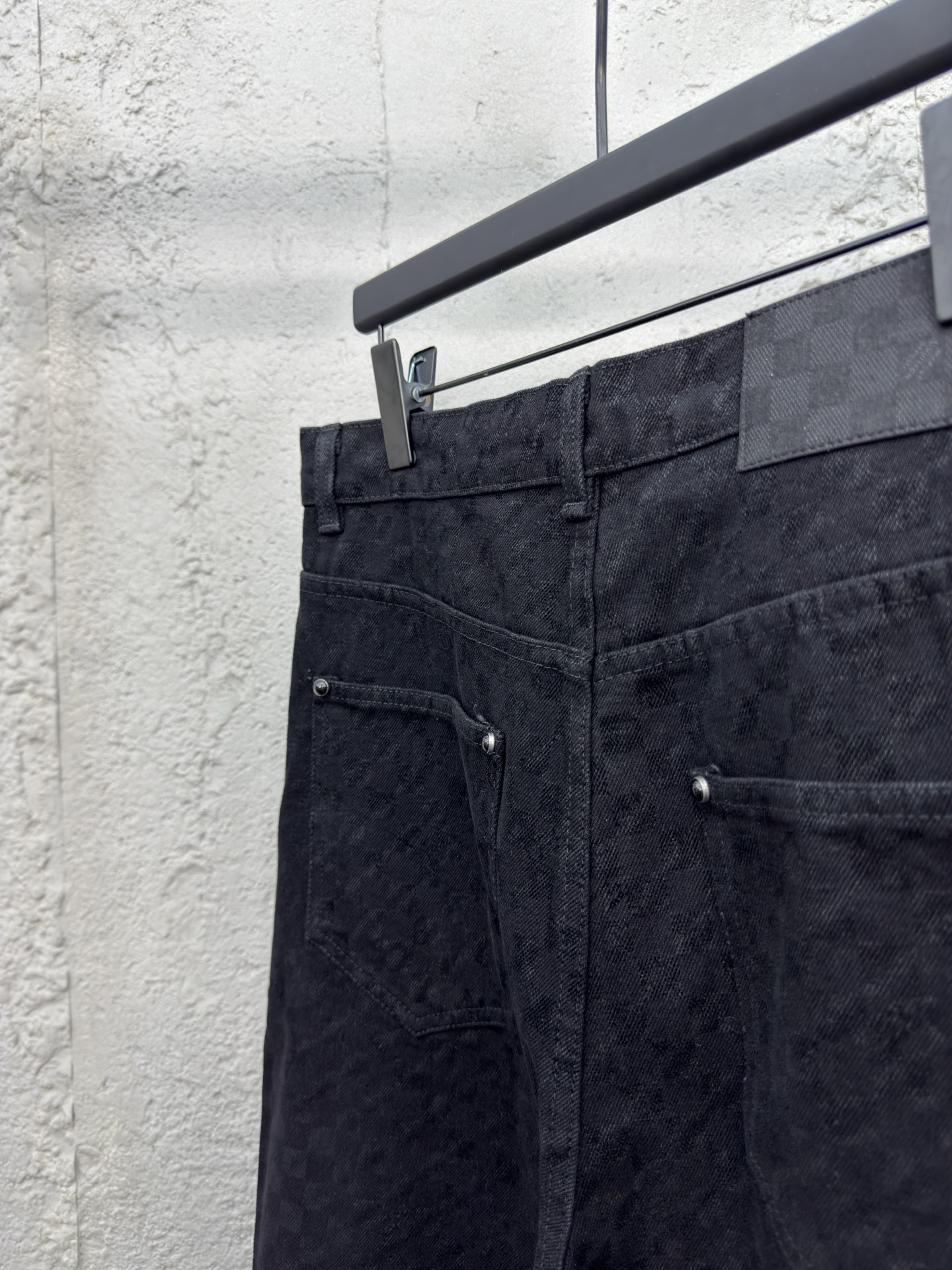 LOUIS VUITTON 棋盘格植绒牛仔裤 工艺说明:采用斜纹棉丹宁面料,多重酵素水洗工艺处理,打造柔和自然的褪色效果,后部呈现正绒面革标签,以细腻笔触玩味当季深邃设计,全幅植绒图案和标识烘托丰盈肌理,标识铭纹珠光纽扣点睛细节,整体走线平直细腻,面料舒适柔软,颜色一致无色差 能与同款搭配营造时尚造型,驾驭各种场合,定制熏黑烤漆五金纽扣,全身对格定位裁剪。三标齐全。 ⚠️颜色:黑色 ⚠️Size:30/32/34/36