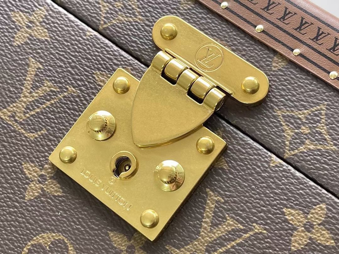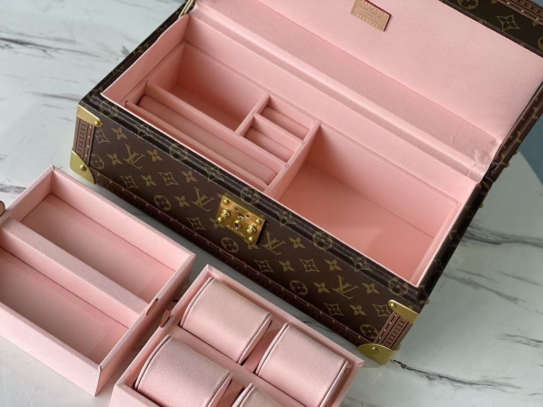 LV路易威登手表盒,饰品盒,多宝盒,多功能收纳盒 MCoffret Accessoires 硬箱以 Monogram 帆布延续经典 Coffret 8 Montres 硬箱的设计精髓,令腕表、袖扣等配饰轻松随行。可储物隔层可收纳太阳眼镜、袖扣、腕表等配饰 详细特征39x 18 x 17厘米