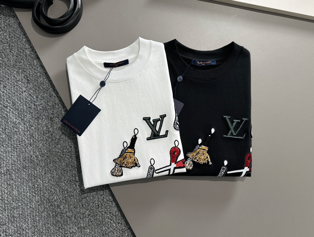 LV 2025ss春夏新款棉质圆领短袖T恤 胸前嵌珠+重工刺绣工艺 顶级丝光棉面料定制 标准版型 黑 白 两色 男女同款 码数:S M L XL XXL