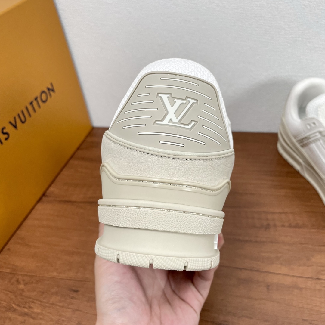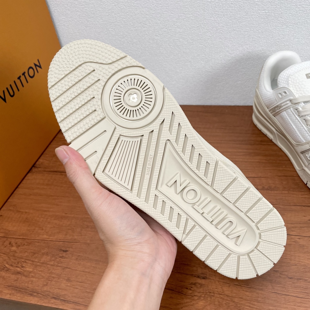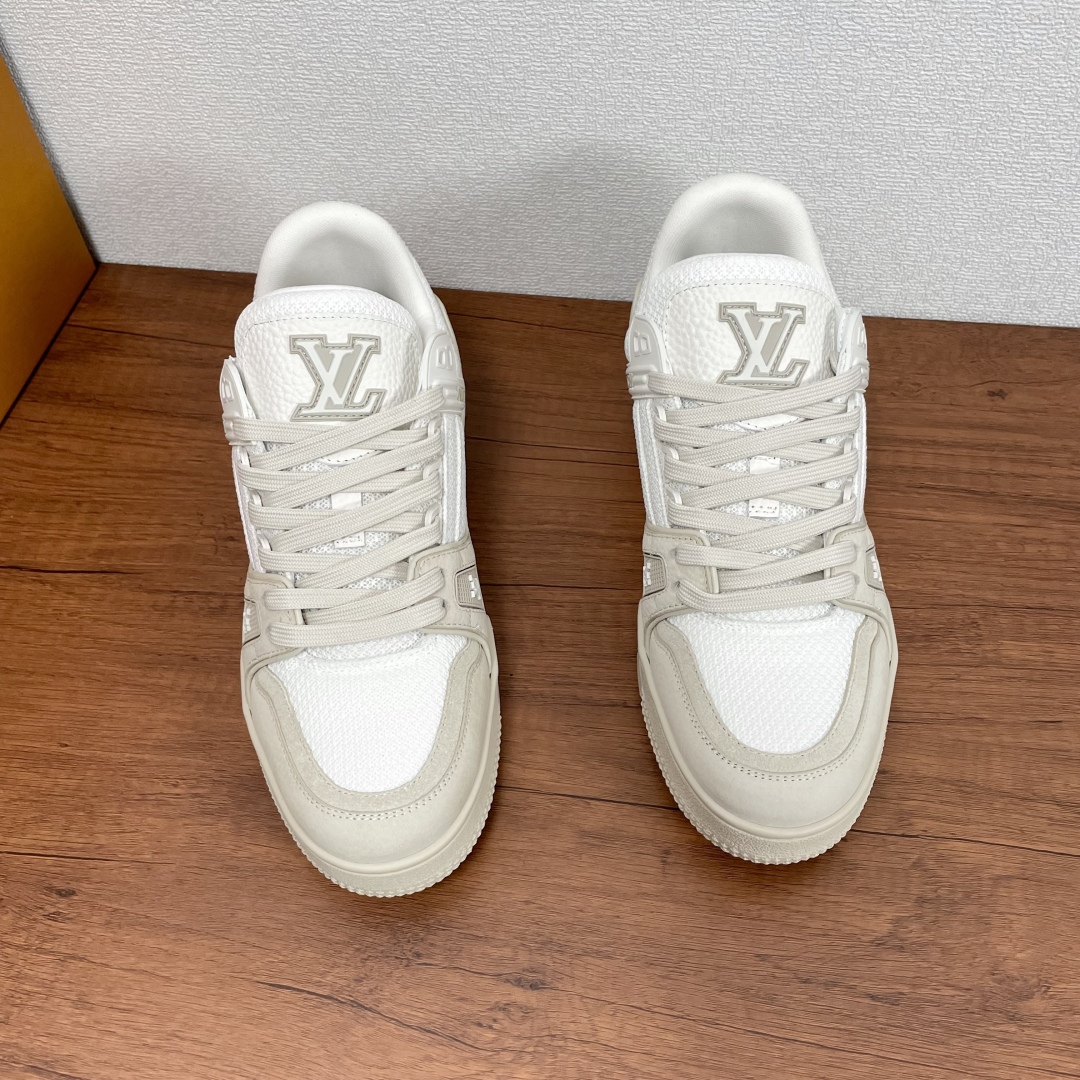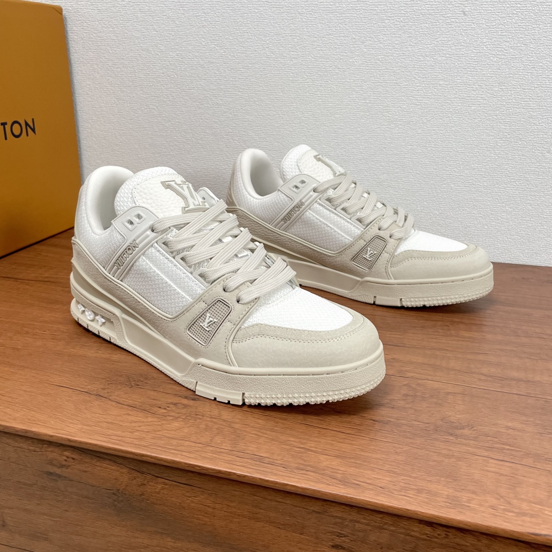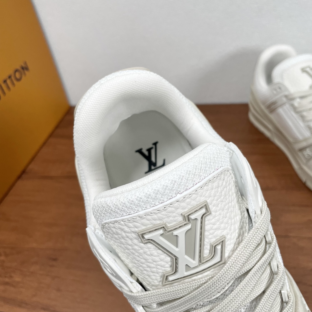 LV TRAINER 新款男士运动鞋出货 本款 LV Trainer 运动鞋糅合织物网格面料和丝绒粒面牛皮革鞋面,采用碰撞色彩与材质反差,巧妙展现复古篮球鞋的灵感启发。鞋侧橡胶 LV 字母与 Vuitton 标识完善整体,繁复鞋面延续传统结构,鞋舌及后跟饰有 LV 字母标识,Monogram 花卉橡胶外底延续舒适体验。配原盒全套包装! 码数:39-40-41-42-43-44 标准皮鞋码(38/45/46可定做不支持退换货)