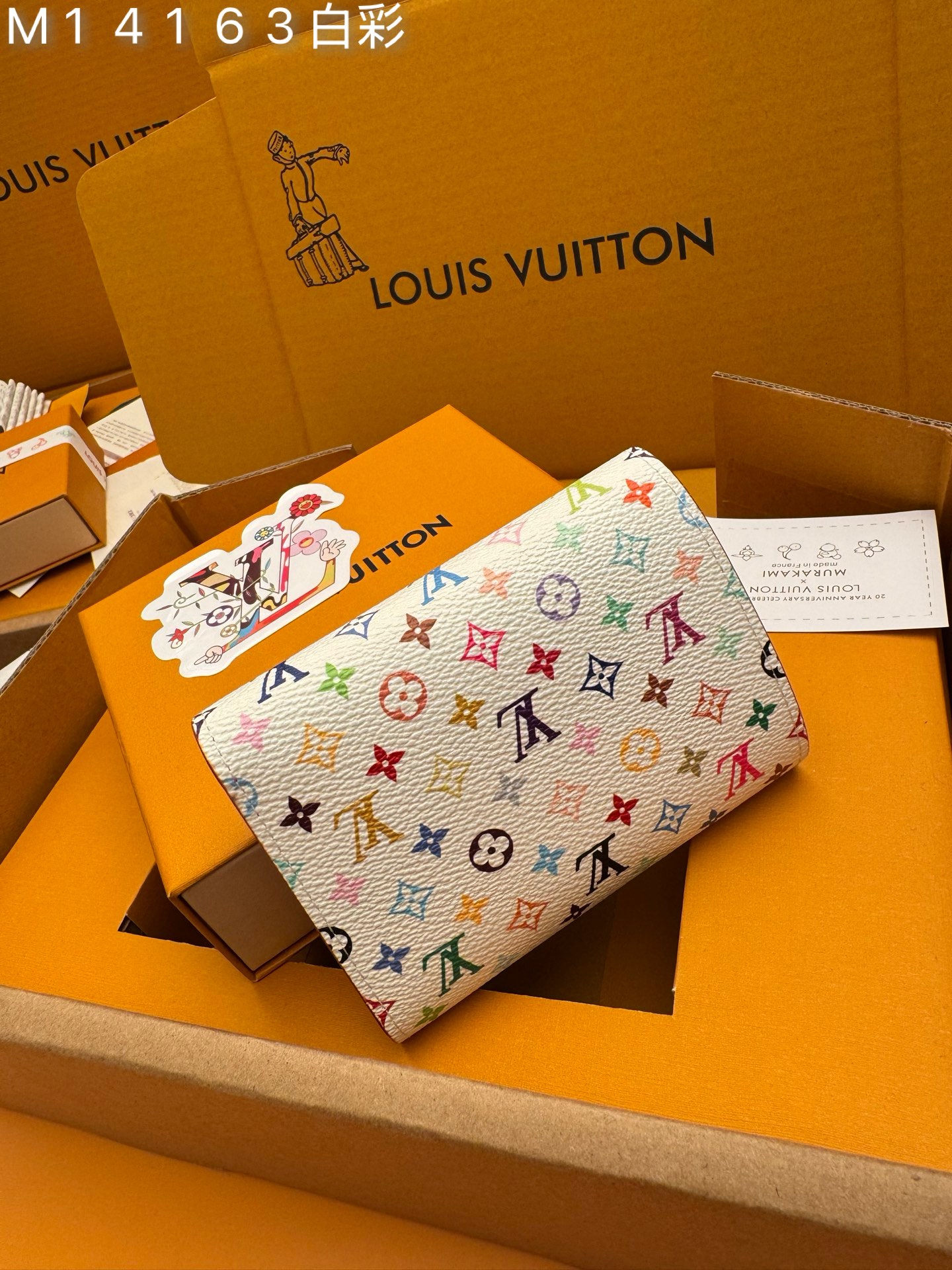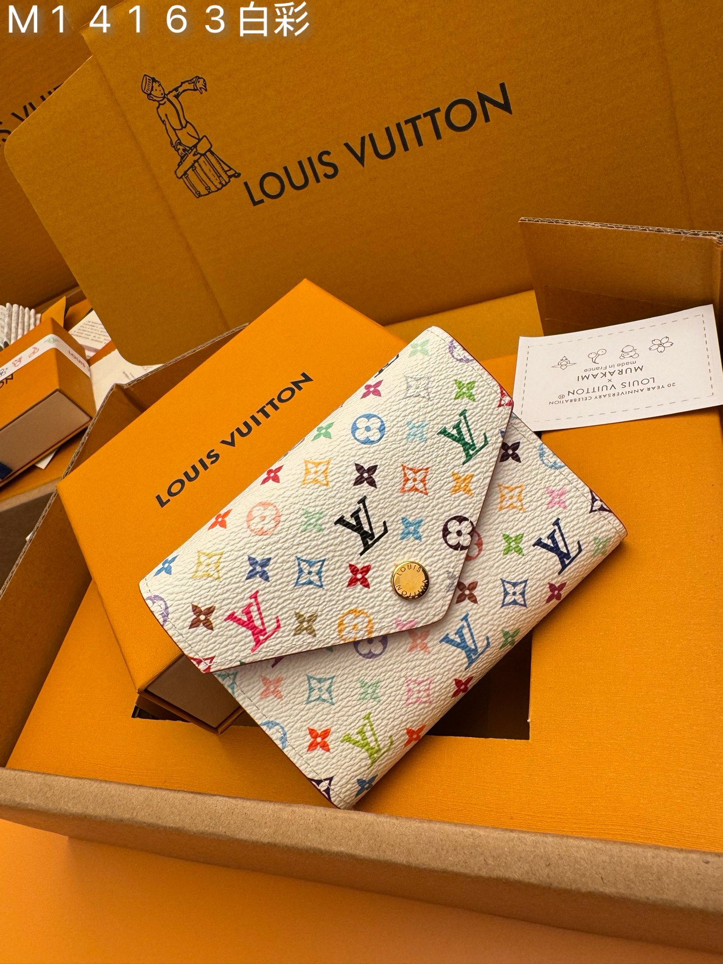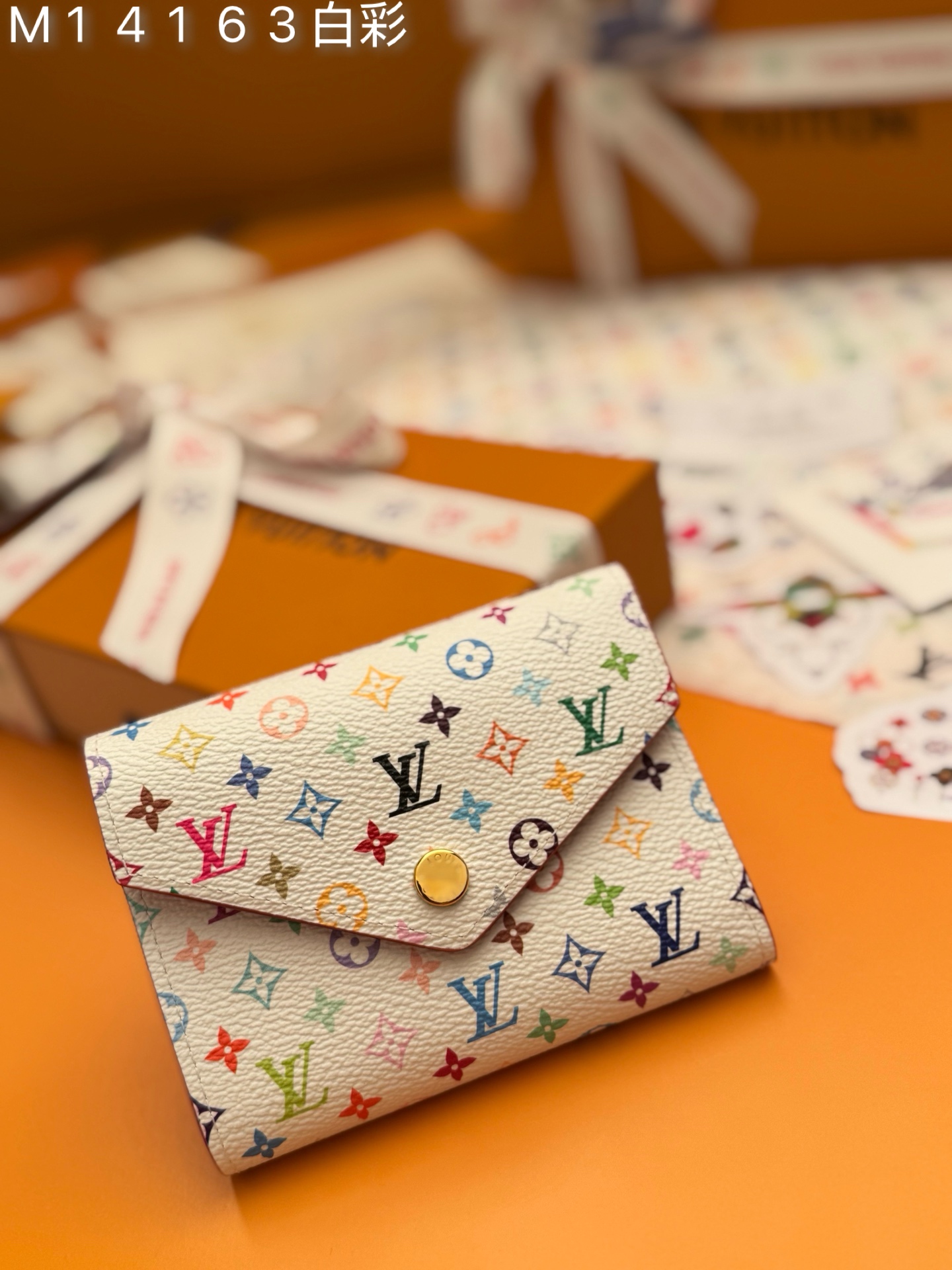 M14163白彩 《特級免稅》♻️ [官方专版·一級材料·全鋼五金·163芯片·全套包裝] 新品L Victorine 钱包,这款紧凑的Victorine钱包采用了路易威登与村上隆联名系列重新推出的充满活力的多色Monogram图案,用这位日本艺术家的招牌彩虹色焕新了品牌的标志性标志。它由涂布帆布制成,内衬精细的牛皮,配有银色金属硬件。一个拉链口袋可以存放硬币,而内部的多个隔层可以整理钞票和卡片。12×9.5×2.5cm