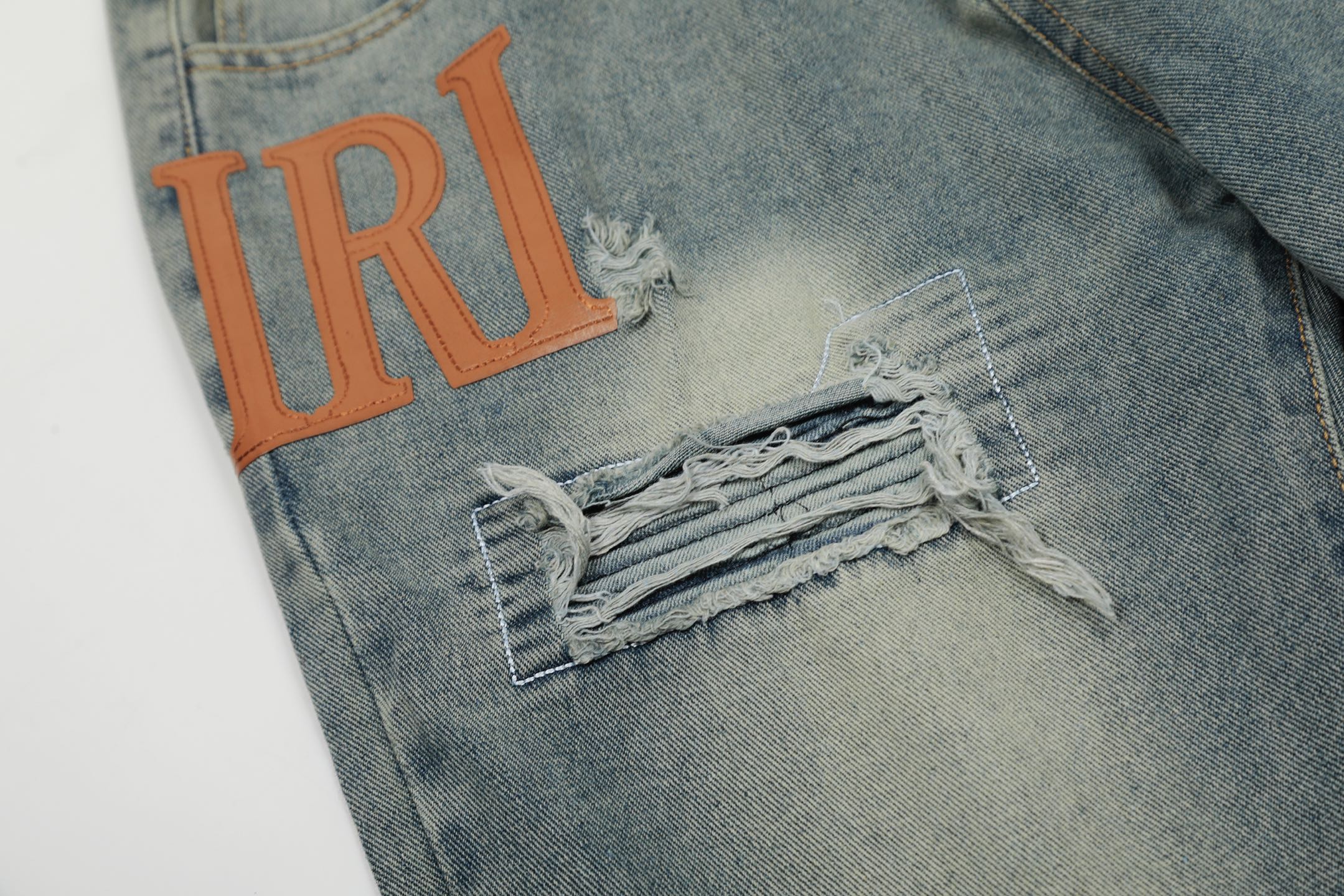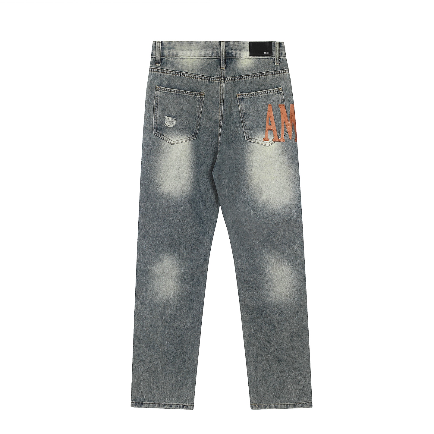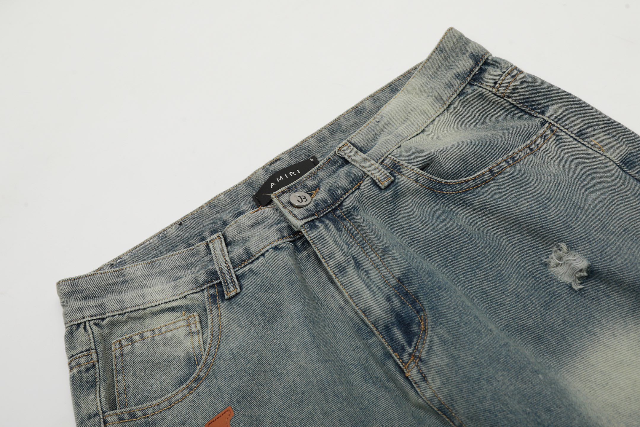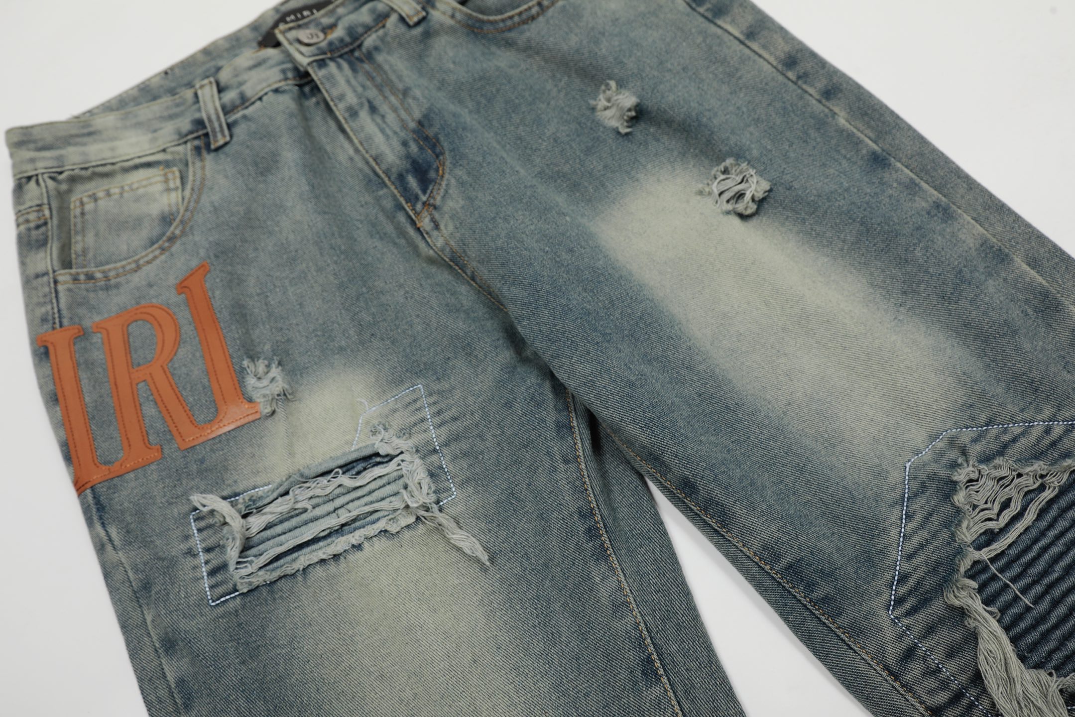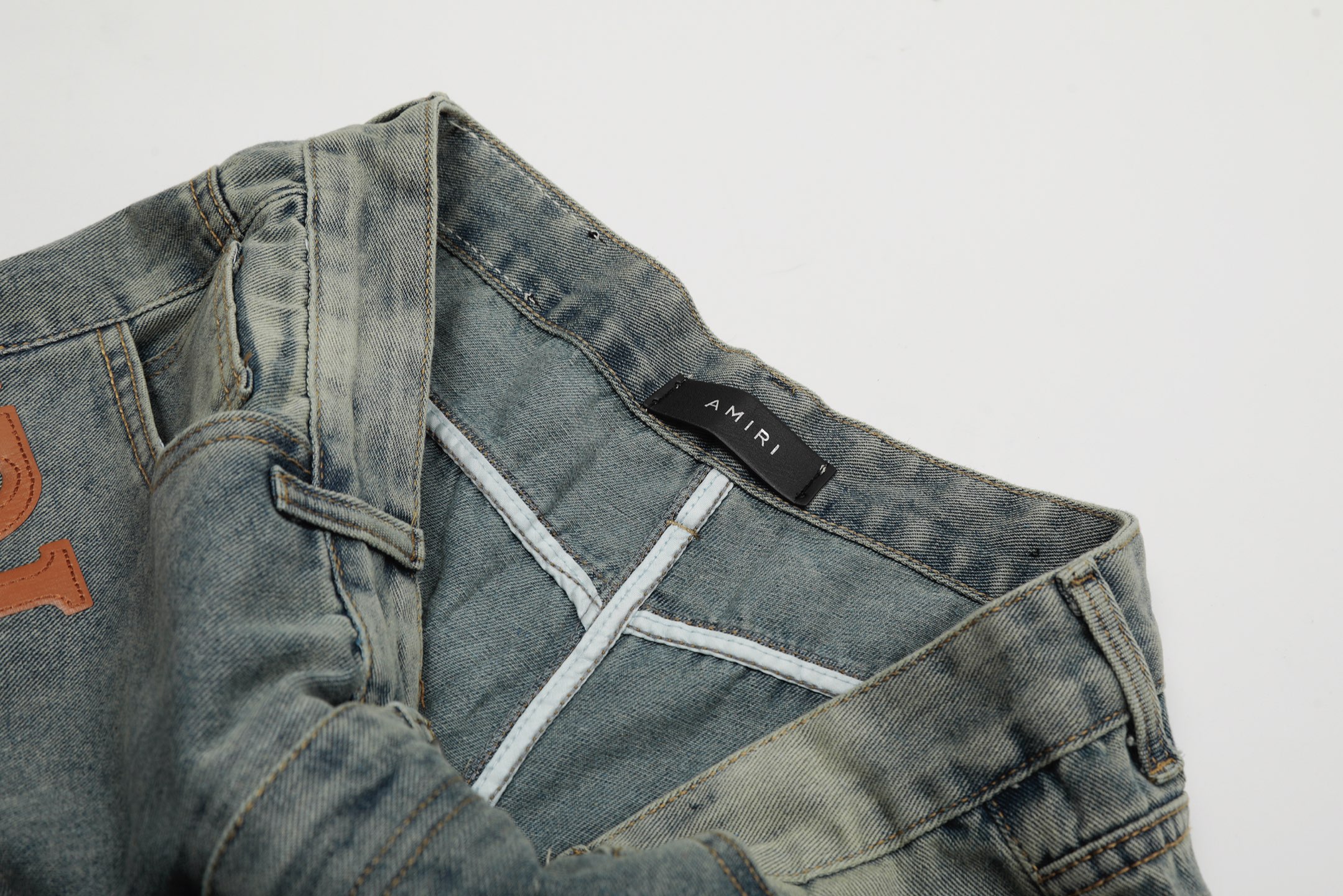 #M25 Amiri经典字母刺绣贴补丁破洞水洗小脚牛仔裤修身小脚牛仔裤