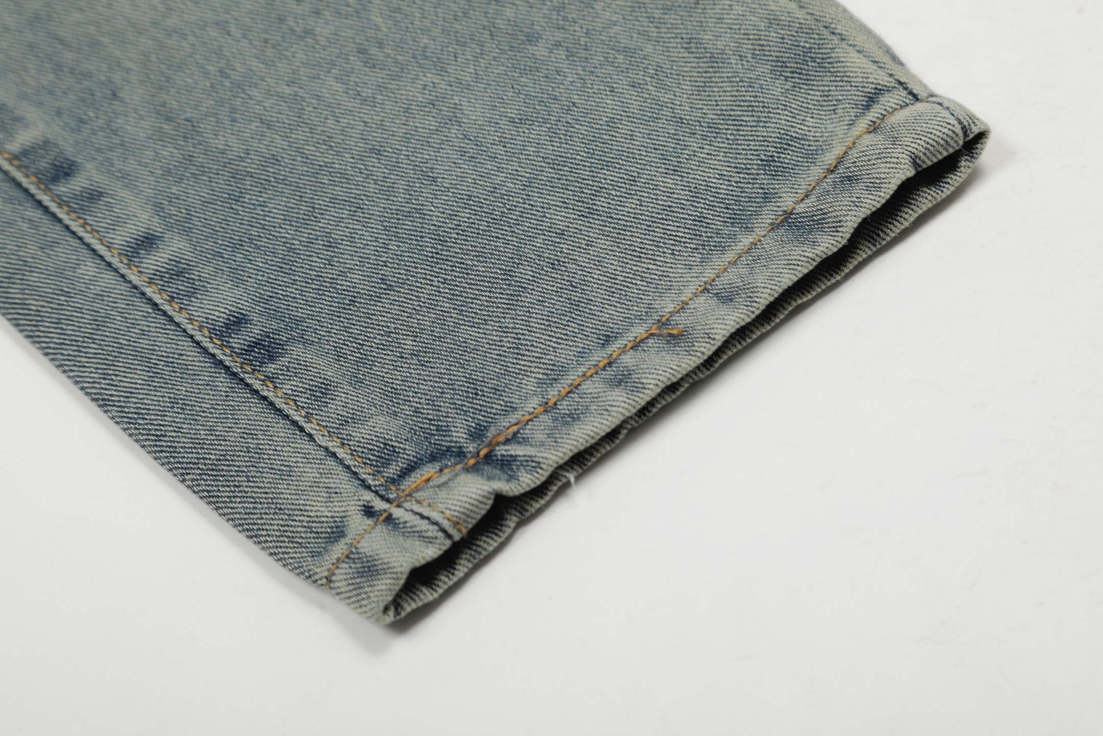 水洗大厂出品 满满的高级感 膝盖部分破坏设计搭配拼皮设计 已经作为门面设计 皮质腰部铭牌 此款的重点不在于水洗,而是在于破坏的形状以及版型 秘诀都是在于师傅的手艺,后期磨破,马骝,刀割等等这些手工制作的成本是流水线产品所远远无法比较的