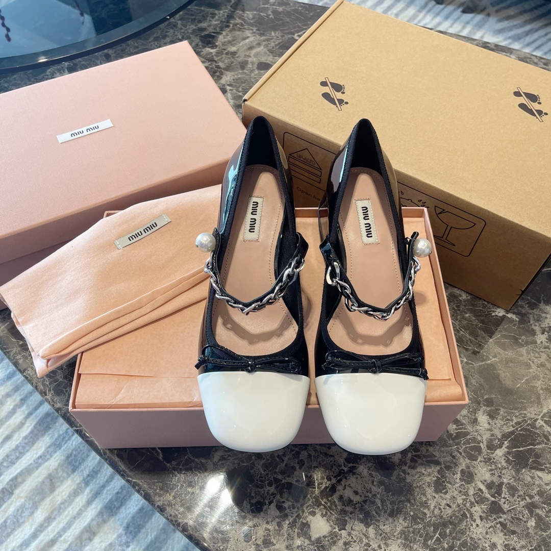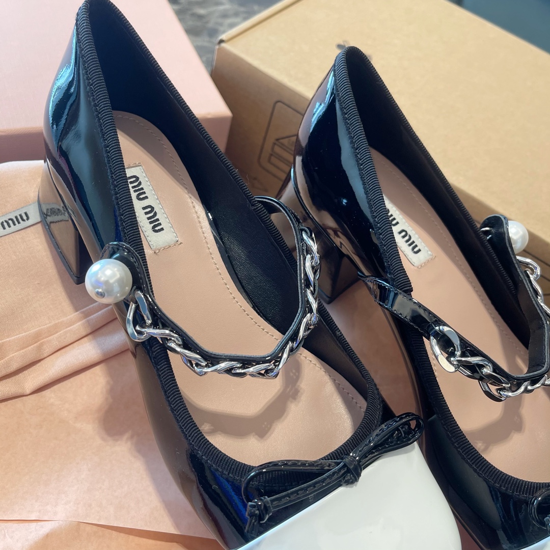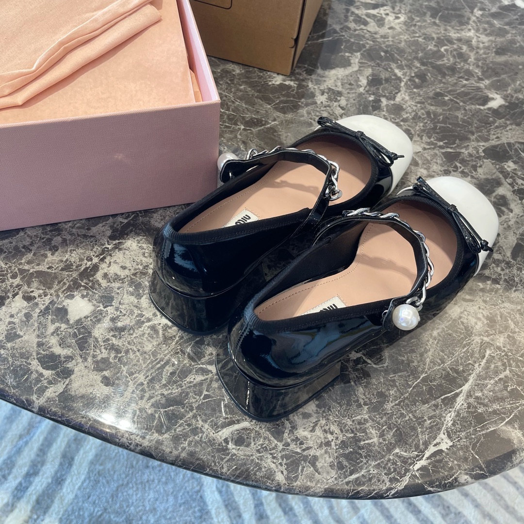 Miu Miu 2022新款蝴蝶结 玛丽珍单鞋‼️ 【新版低跟3.5公分】 Miu Miu缪缪今年最新~比之前玛丽珍鞋多了蝴蝶结 少女感十足 更加俏皮可爱 妥妥滴仙女鞋 上脚超级舒服 非常显腿细 面料:原版进口小牛皱漆皮!边缘独家原版1:1定制花边织带! 垫脚:混种羊皮材质!独家定制1:1原版米色布标! 饰扣:天然粉镀膜珍珠!独家原版1:1开模纯钢五金链条⛓持久不软化!这些差价都非常大❗️ 大底:进口意大利真皮大底!高密度原色皮呸! :35~39