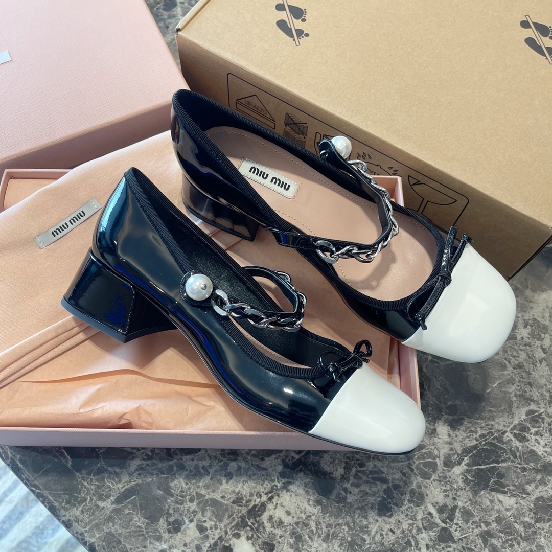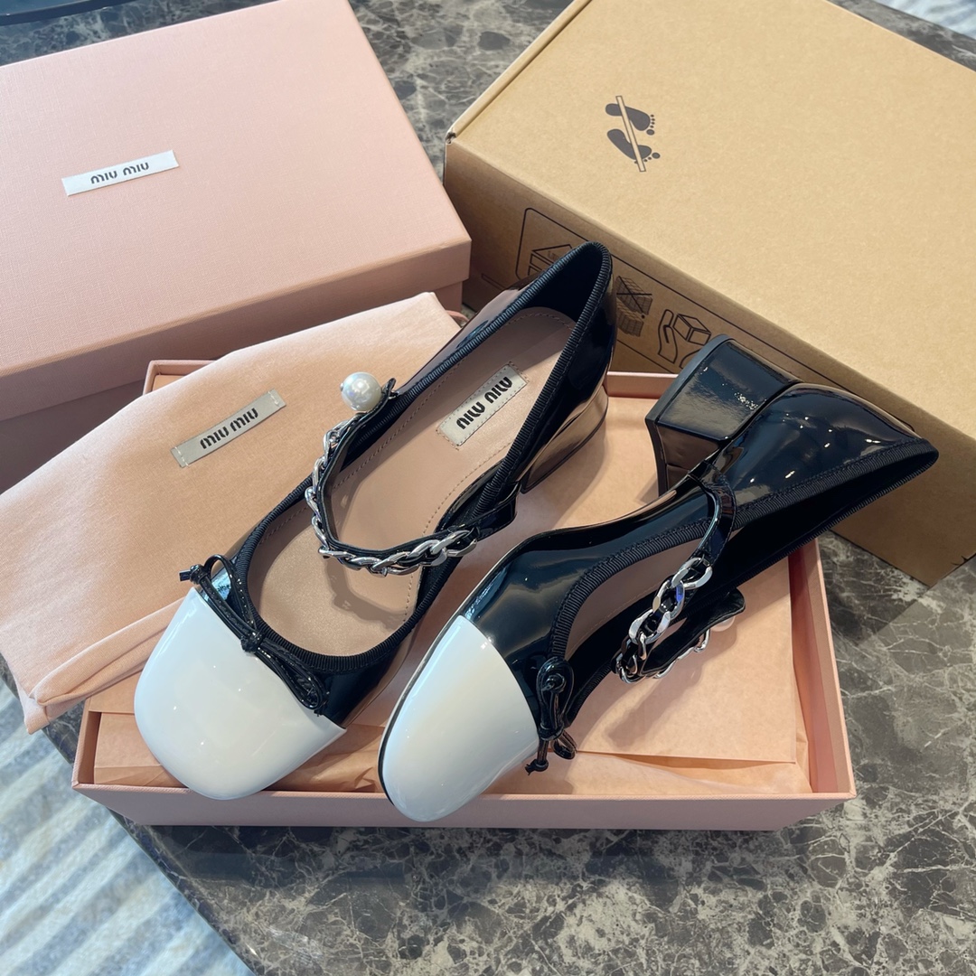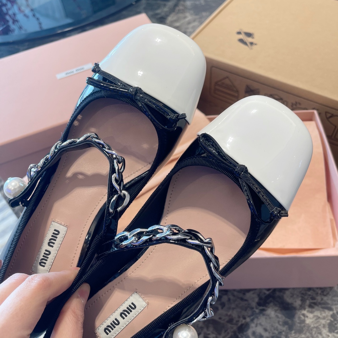 Miu Miu 2022新款蝴蝶结 玛丽珍单鞋‼️ 【新版低跟3.5公分】 Miu Miu缪缪今年最新~比之前玛丽珍鞋多了蝴蝶结 少女感十足 更加俏皮可爱 妥妥滴仙女鞋 上脚超级舒服 非常显腿细 面料:原版进口小牛皱漆皮!边缘独家原版1:1定制花边织带! 垫脚:混种羊皮材质!独家定制1:1原版米色布标! 饰扣:天然粉镀膜珍珠!独家原版1:1开模纯钢五金链条⛓持久不软化!这些差价都非常大❗️ 大底:进口意大利真皮大底!高密度原色皮呸! :35~39