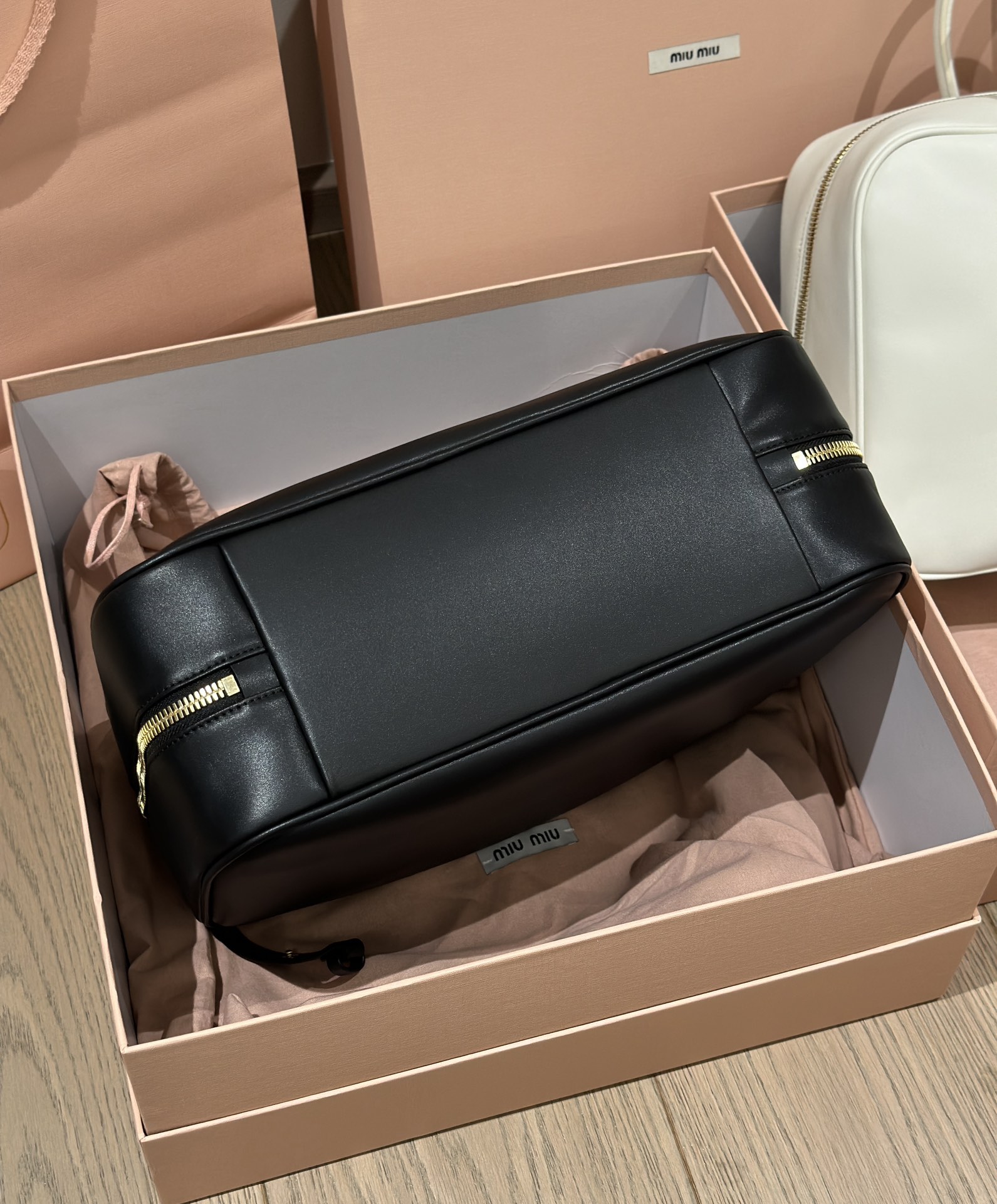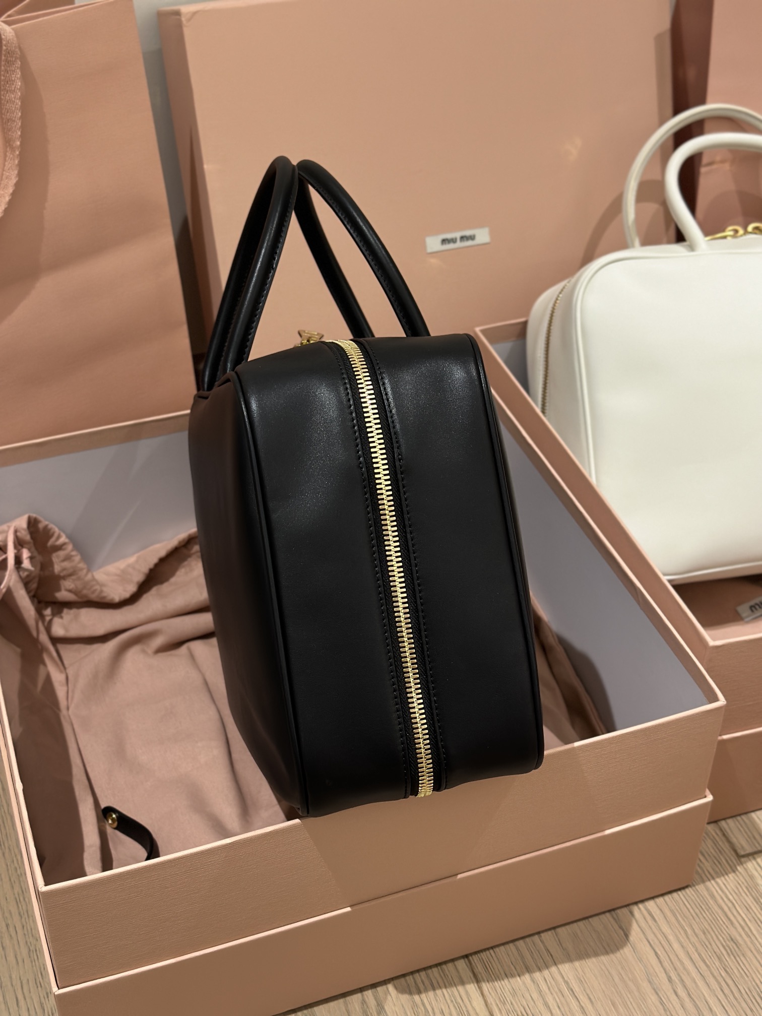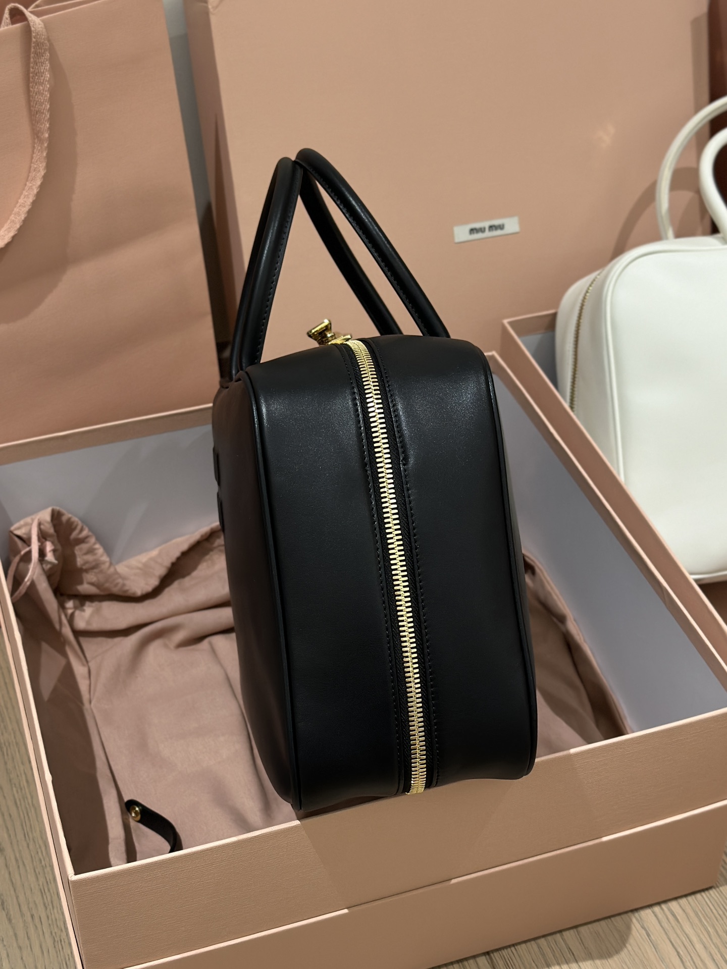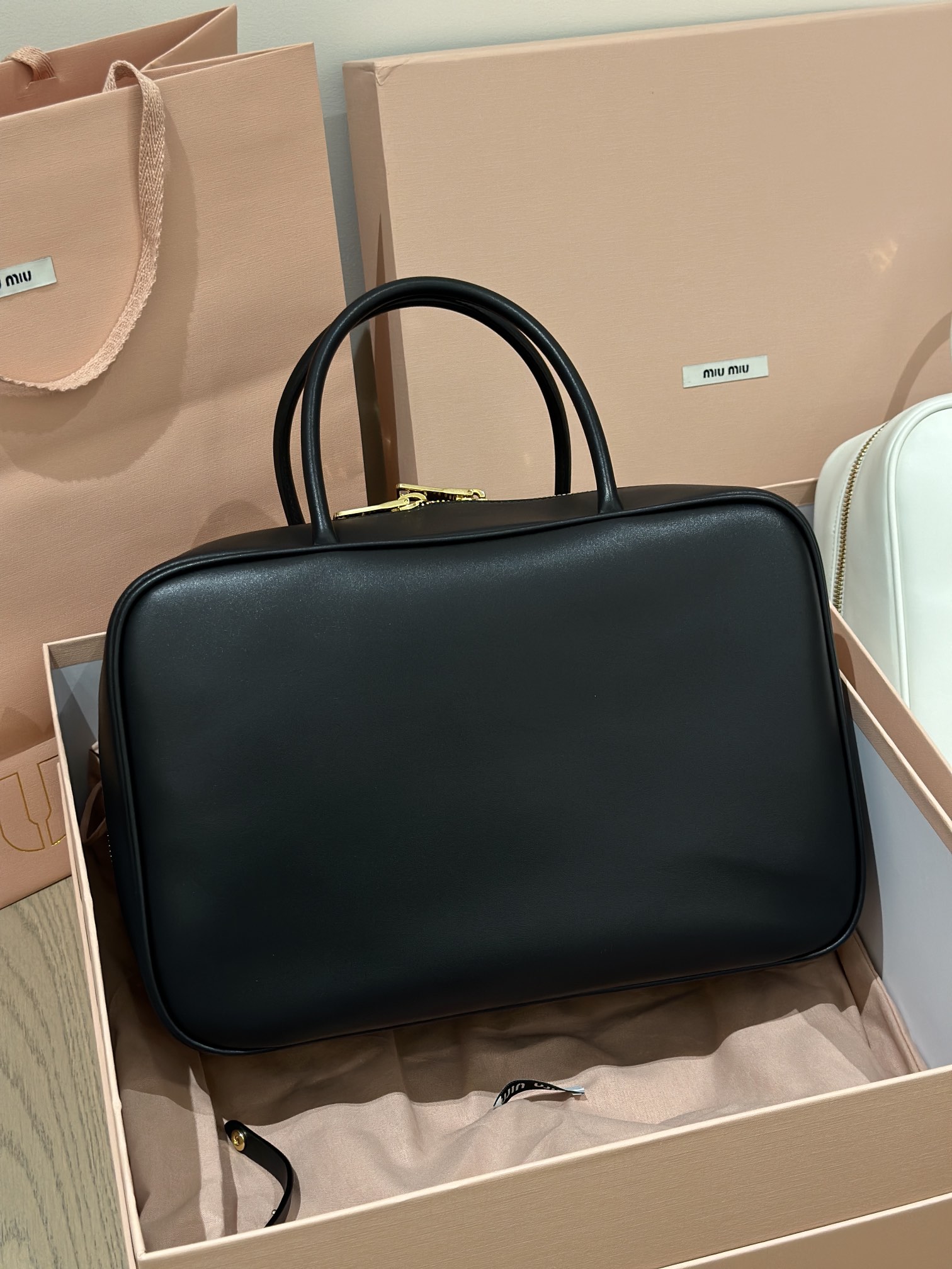 MiuMiU 保龄球/公文包‼️‼️ 秀款真的太种草了!! 采用顶级进口小牛皮,皮质光滑细腻柔软,棉质缎面衬里。背起来都很 nice 哦,拿在手上真的气场十足,完全不会过时的包款!!快 get 这款男生/女生都可背的包包吧大包休闲通勤还可当公文包、上班包.超大容量还很轻便,简约却不简单,各大时尚搏主几乎人手一个。 尺寸:底长35x底宽12cm x高22cm