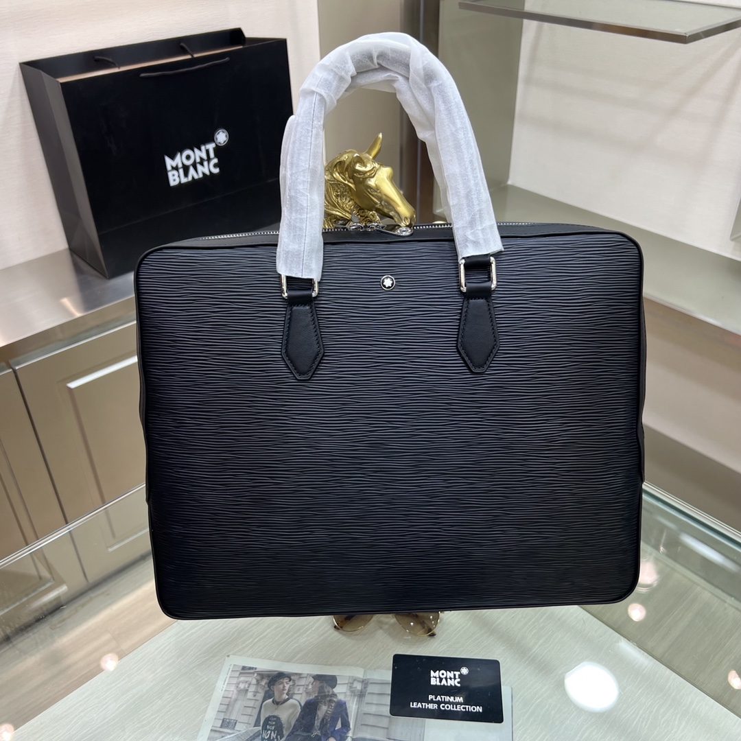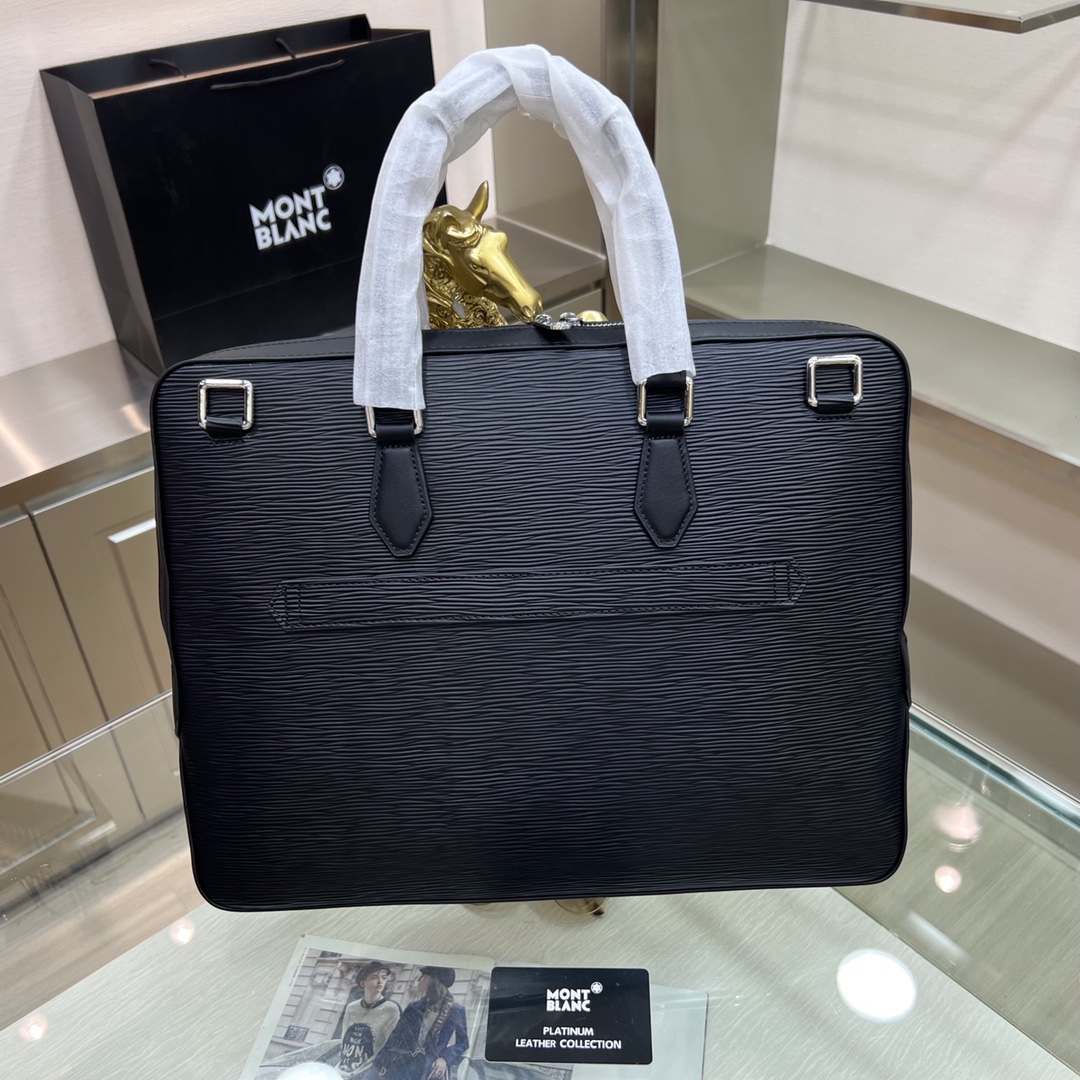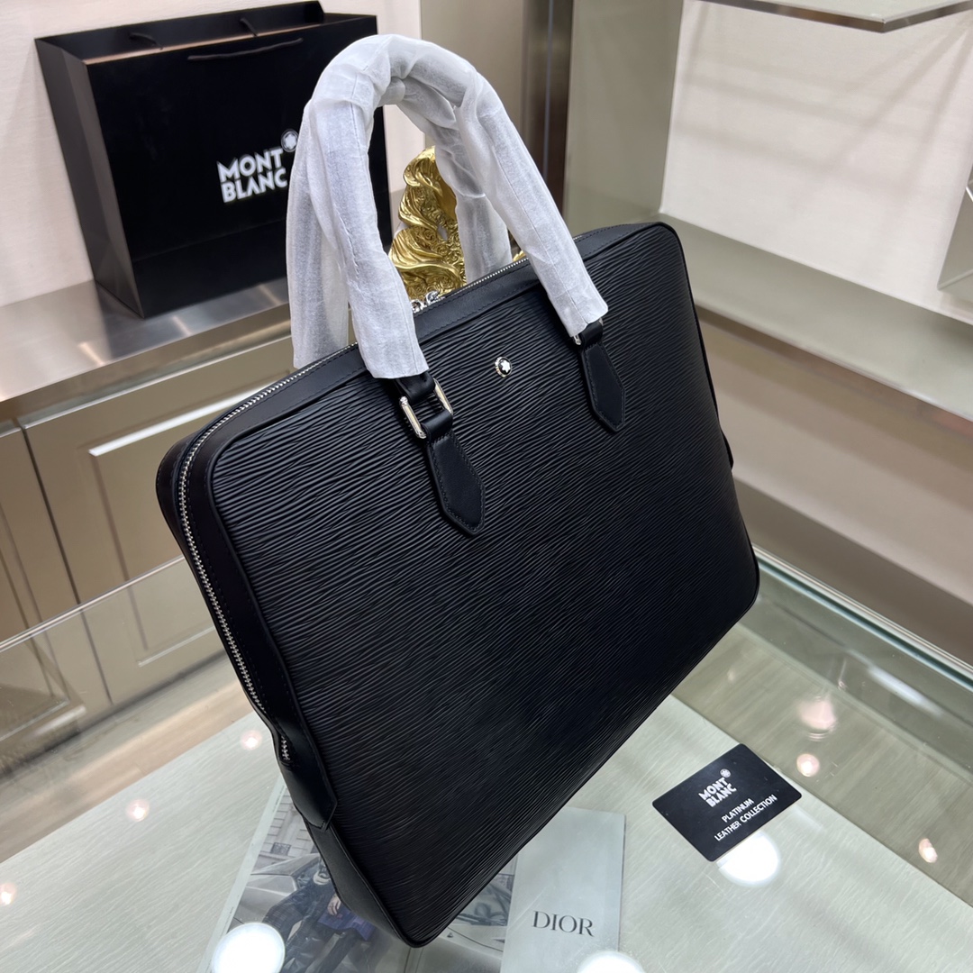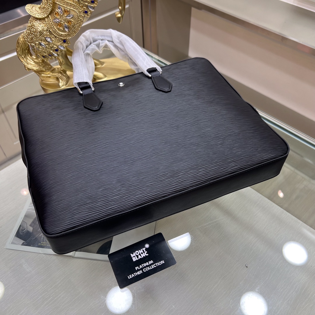 Montblanc International(万宝龙) 万宝龙原版新款 这款超薄公文包优雅而空间充裕,采用树皮图案印刷皮革制作,可容纳一系列商务必需品,包括电子设备和A4文件。打开主隔层,可见两个开放式口袋和两个专门用于放置书写工具的口袋。这款包的提手采用普通皮革精心制作,并具有以传承墨水瓶为灵感的细节。 型号:24409-1A 尺寸:39-30-5.5