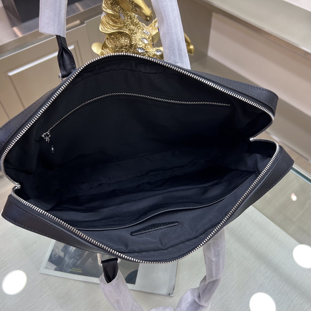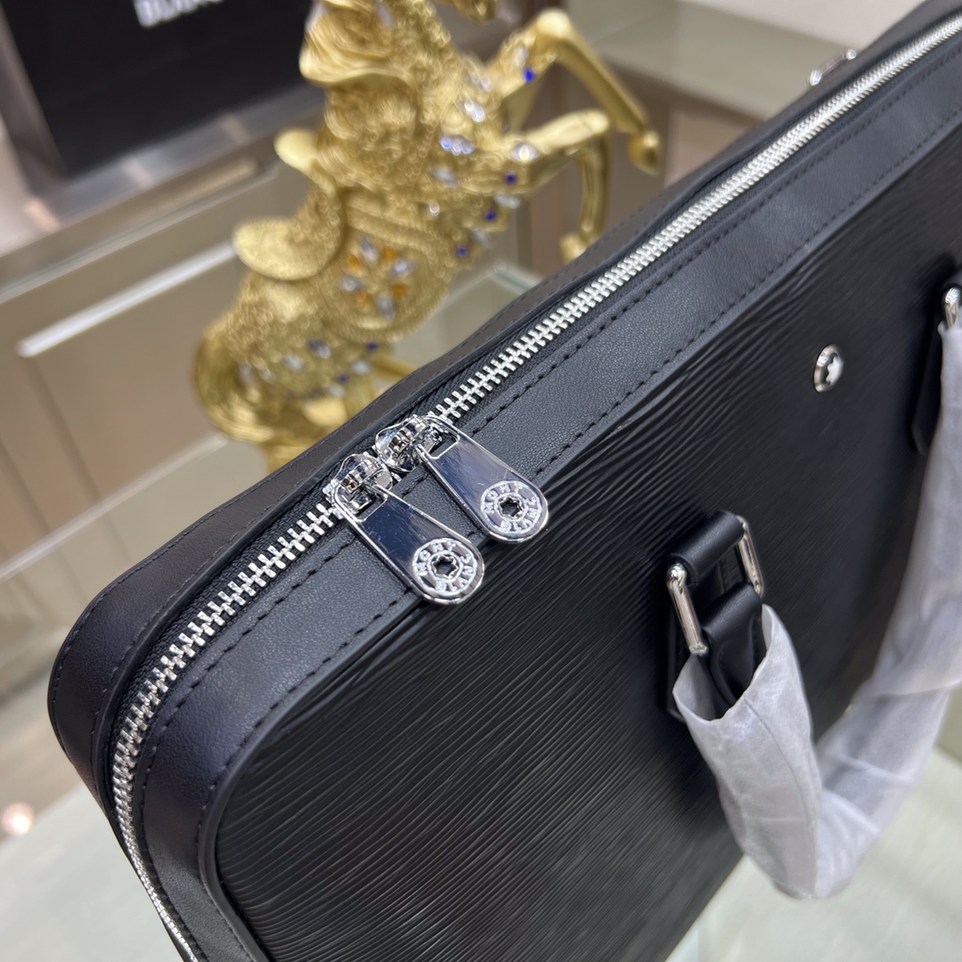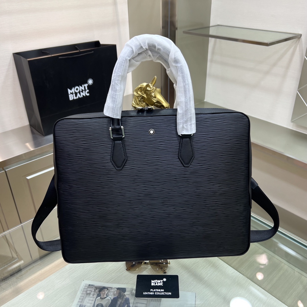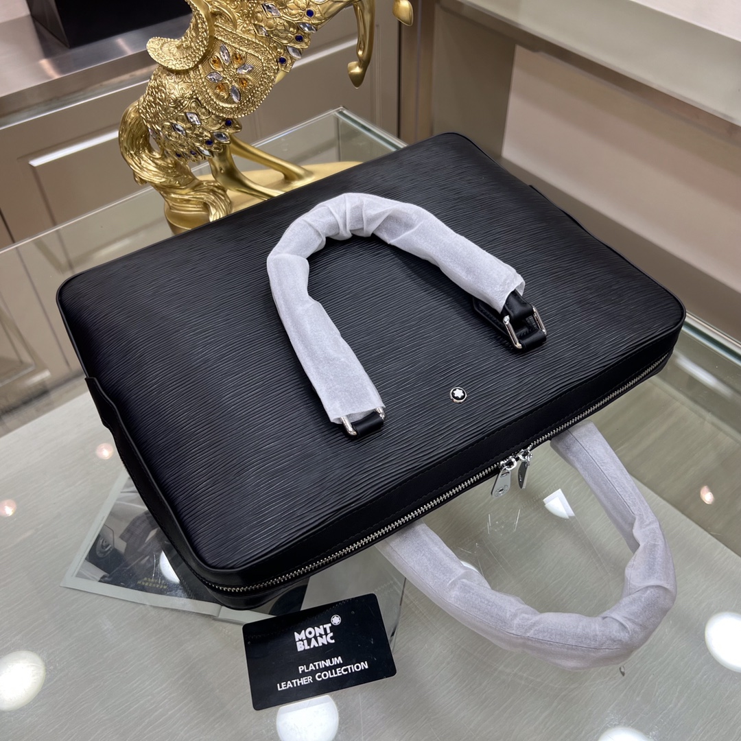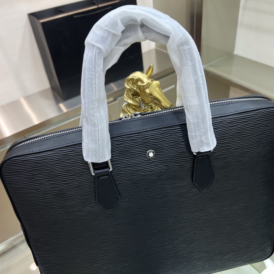 Montblanc International(万宝龙) 万宝龙原版新款 这款超薄公文包优雅而空间充裕,采用树皮图案印刷皮革制作,可容纳一系列商务必需品,包括电子设备和A4文件。打开主隔层,可见两个开放式口袋和两个专门用于放置书写工具的口袋。这款包的提手采用普通皮革精心制作,并具有以传承墨水瓶为灵感的细节。 型号:24409-1A 尺寸:39-30-5.5