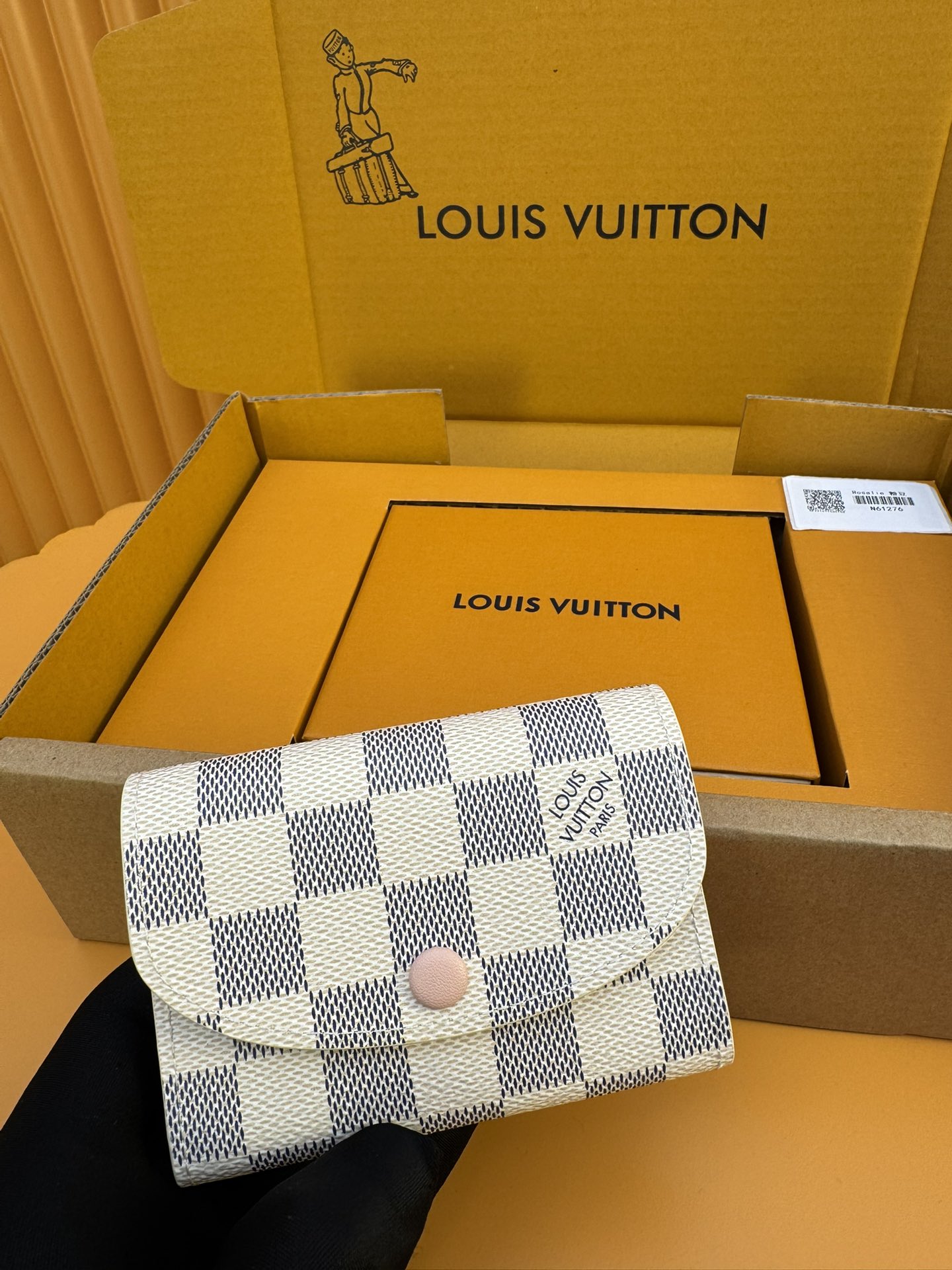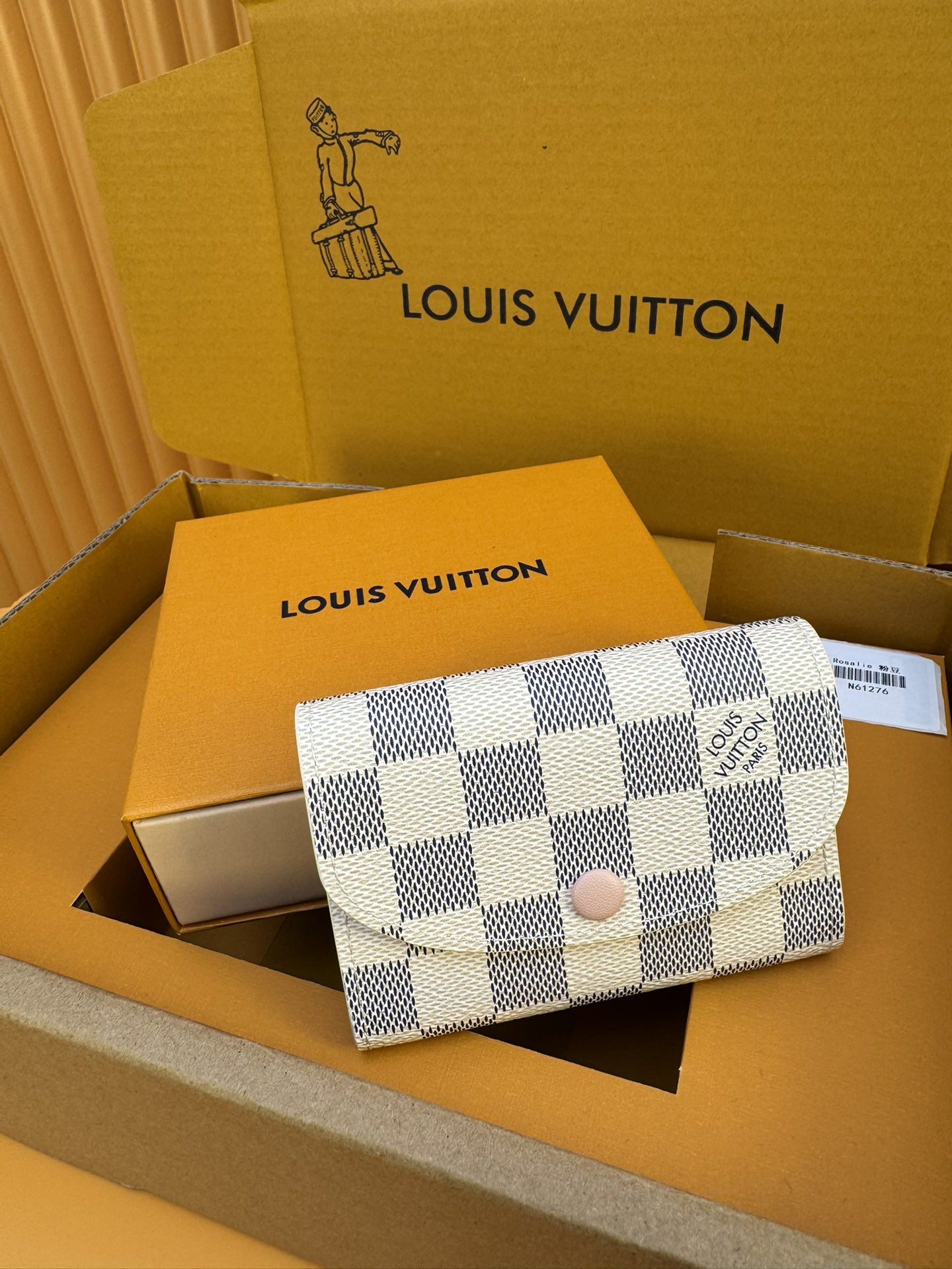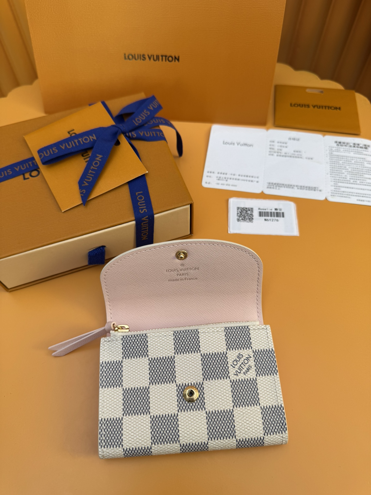 N61276粉豆[官方全鋼芯片版]用蓝色的Damier帆布制成,这款罗莎莉钱包是一个女性化的小饰品,优雅的比例和略微圆润的折叠。画布上配有五颜六色的牛皮花纹衬垫。内部提供两个卡槽和一个带拉链的钱包。11x8x2.5cm