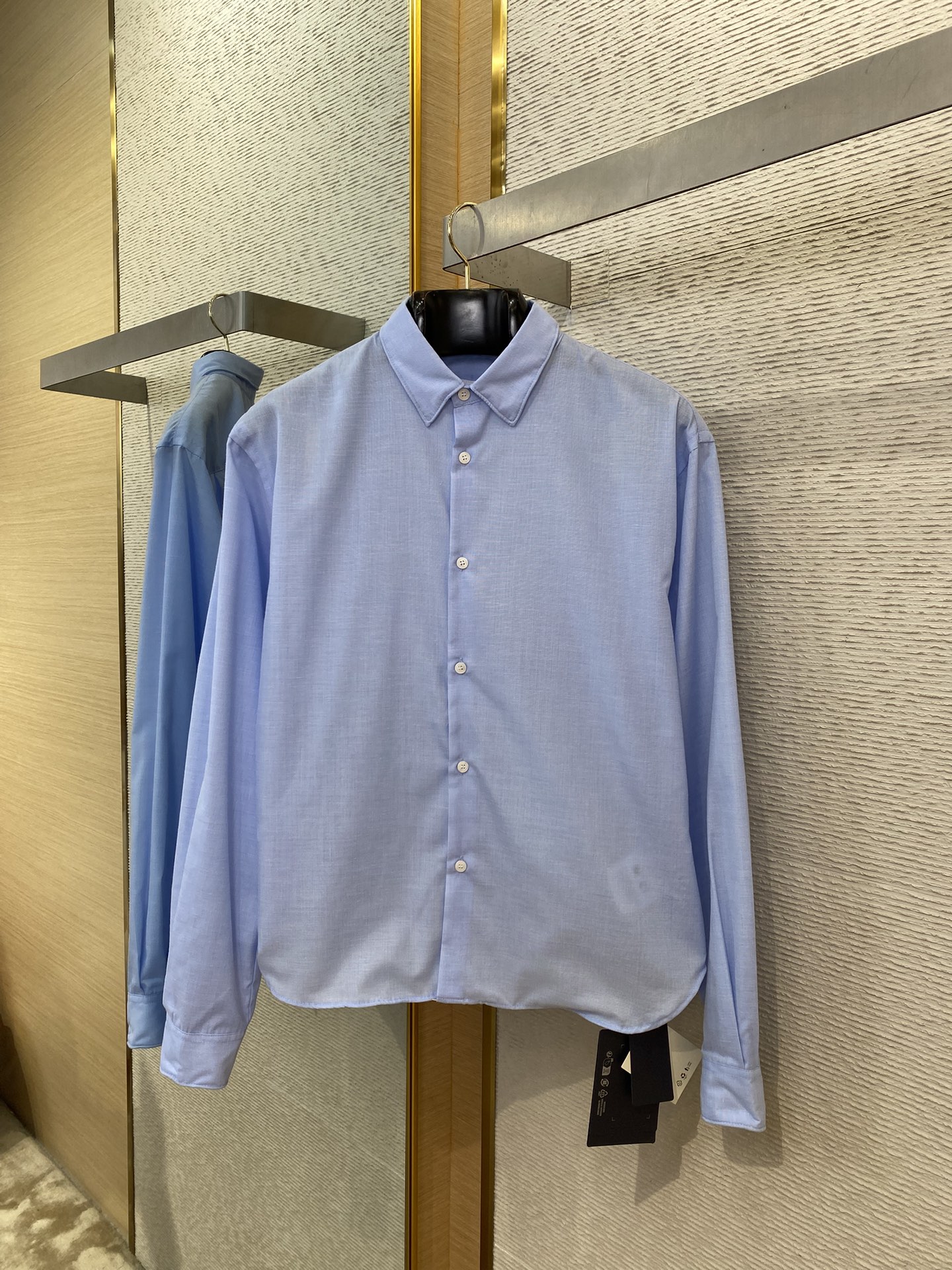 YB购入打版,采用定制棉质面料,面料非常舒适柔软,后领三角标定位裁剪,做工非常工整高级,这款衬衫的特点在于衣领、袖子、下摆里面埋藏了可以任意折叠弯曲的金属丝,你可以把它们拧成你最喜欢的形状,不规则的轮廓可以把飘逸的造型定格,能与多类型下装搭配营造时尚造型,定制辅料,三标齐全!