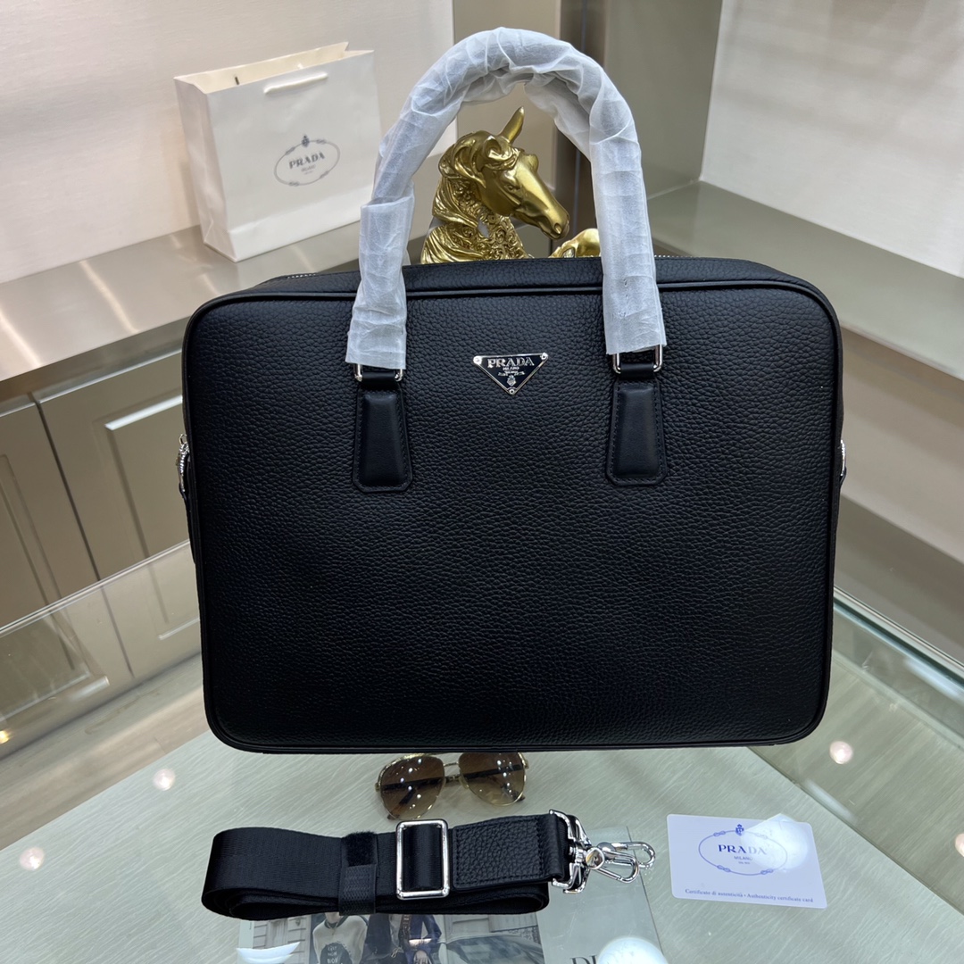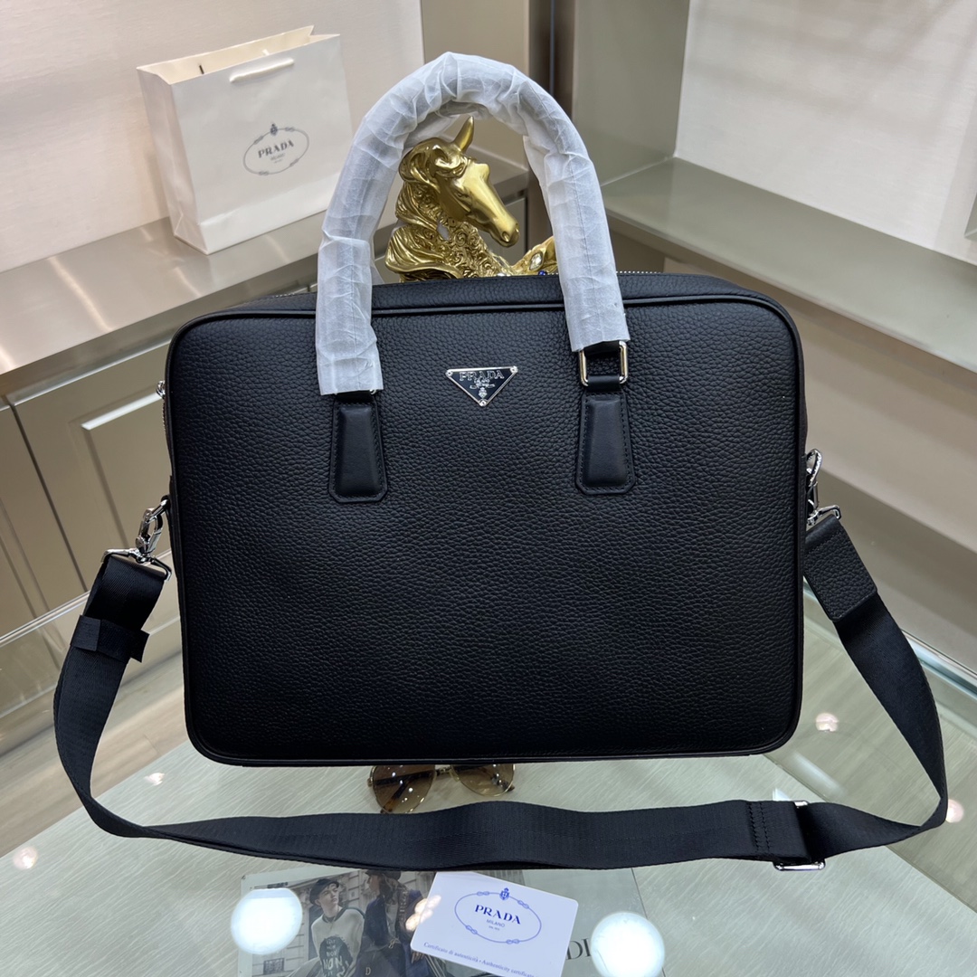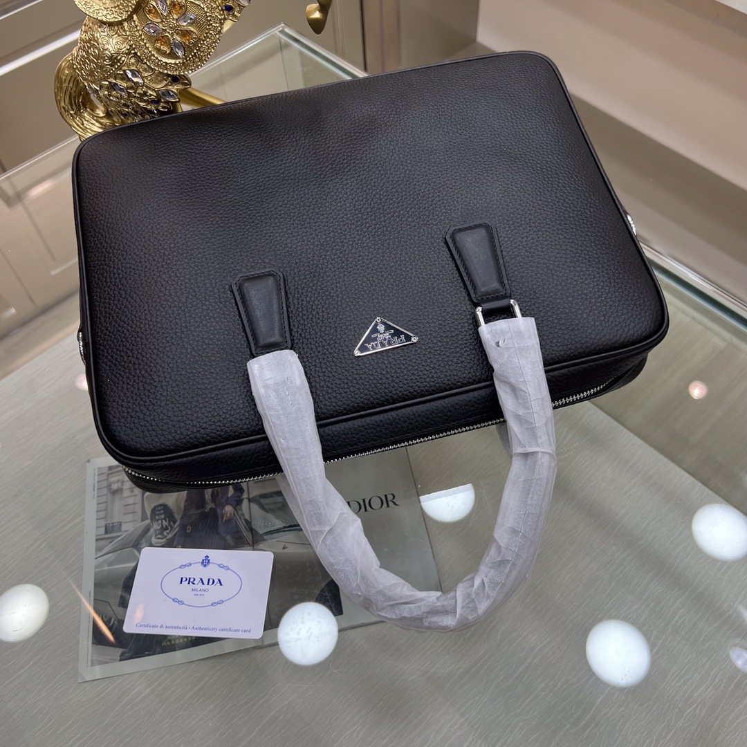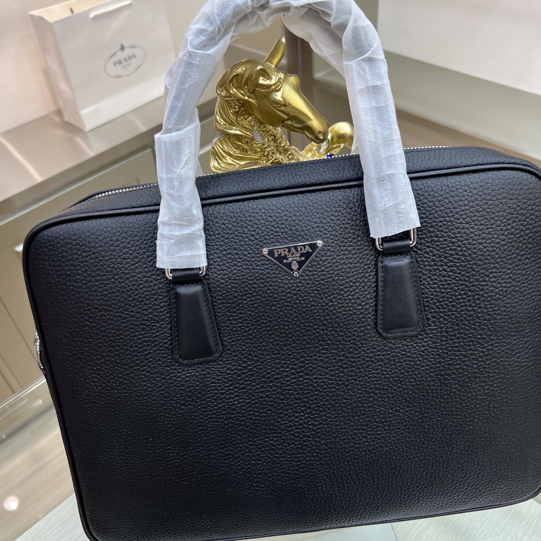 PRADA普拉达 新款公文包 采用进口摔纹牛皮,顶级抛光不锈钢饰面金属配件 ,正面外部三角形珐琅徽标,简单大方商务 成功男士们的最爱 !