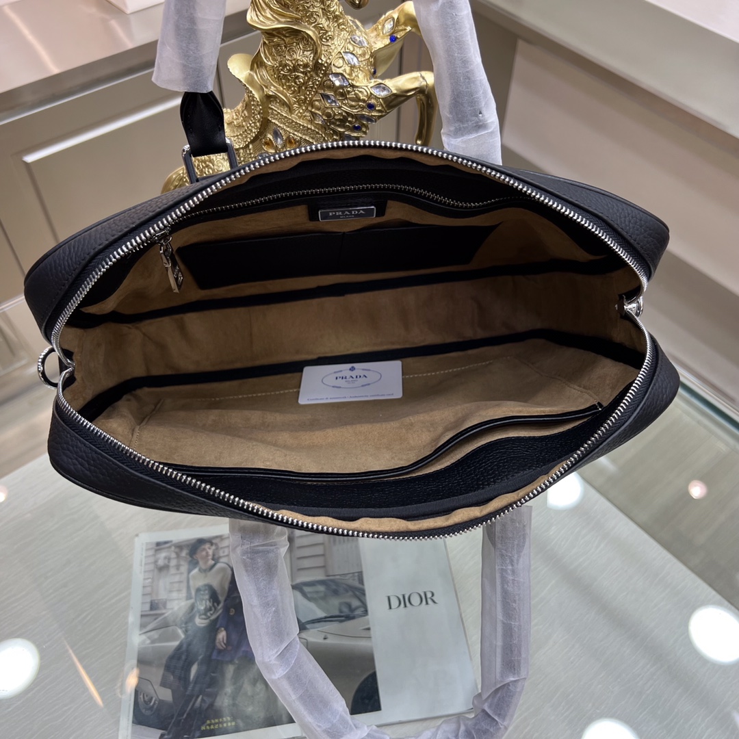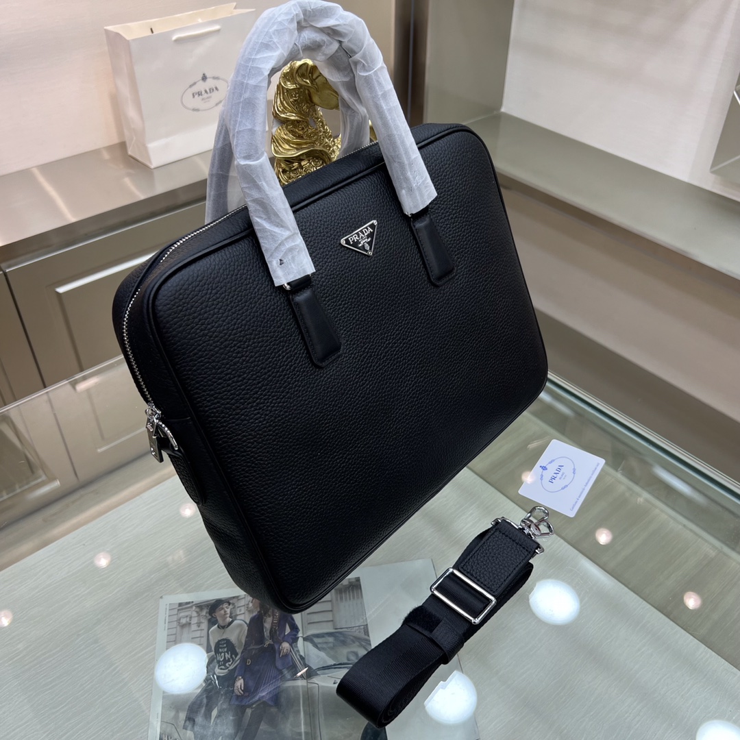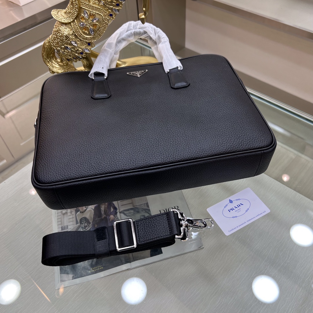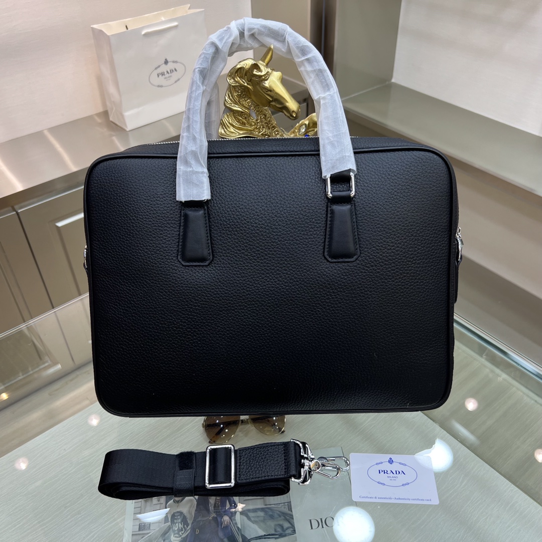 PRADA普拉达 新款公文包 采用进口摔纹牛皮,顶级抛光不锈钢饰面金属配件 ,正面外部三角形珐琅徽标,简单大方商务 成功男士们的最爱 !