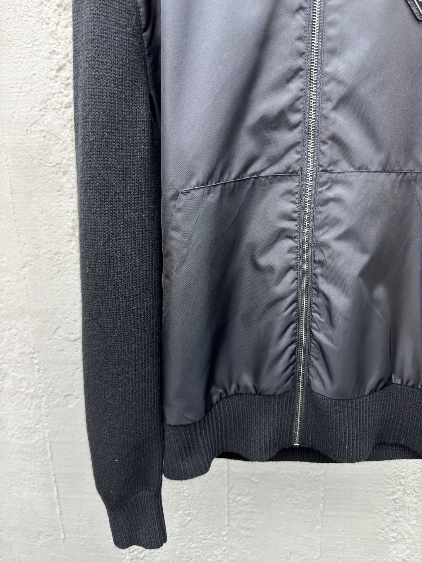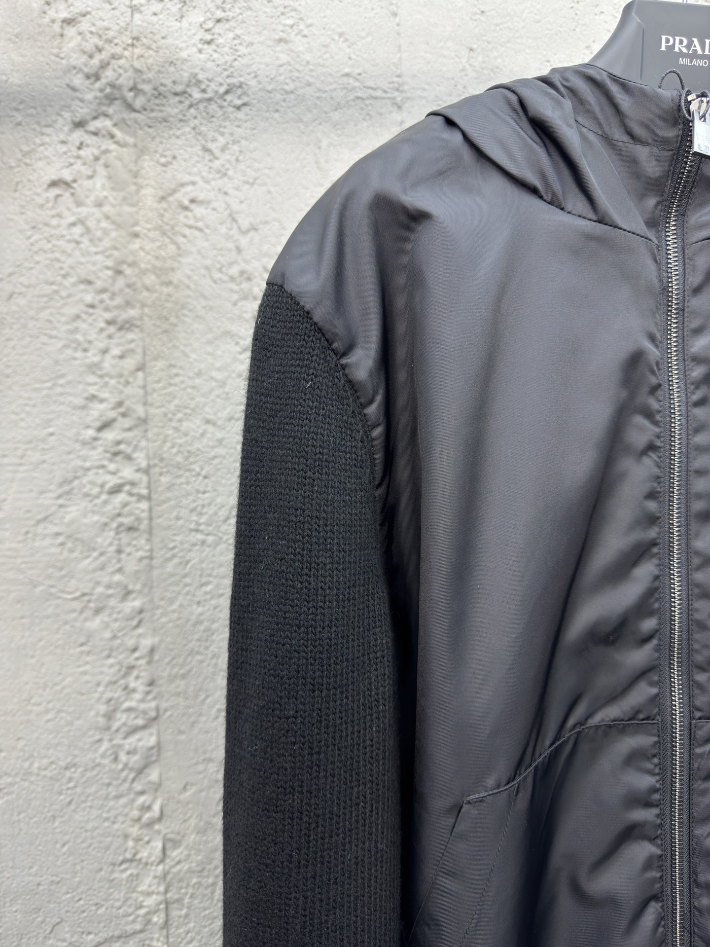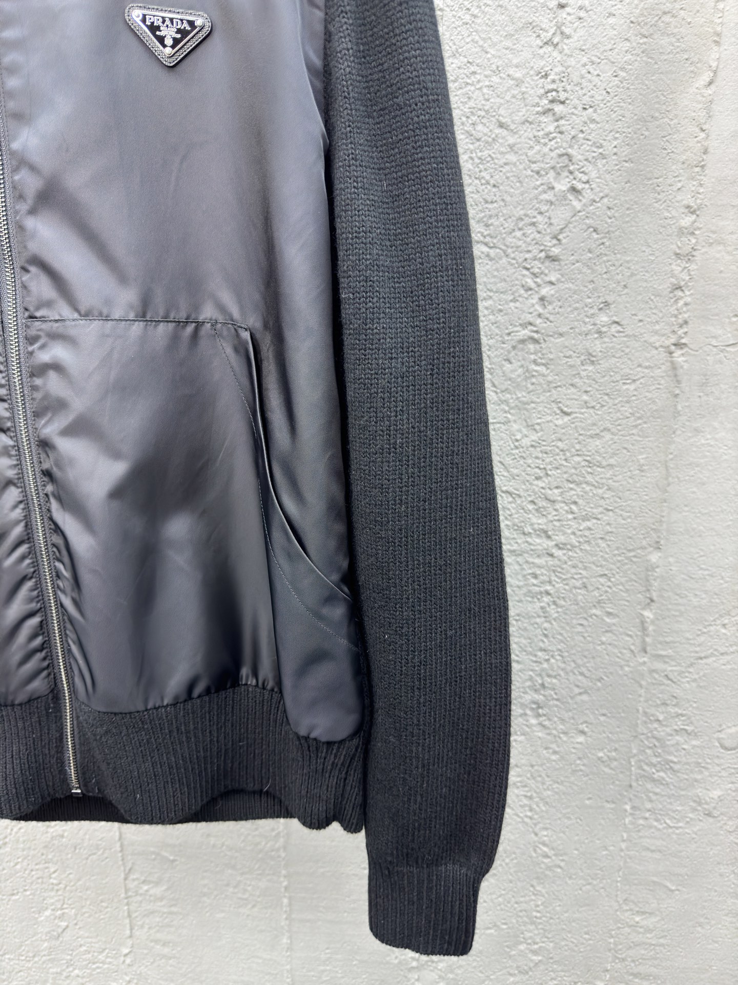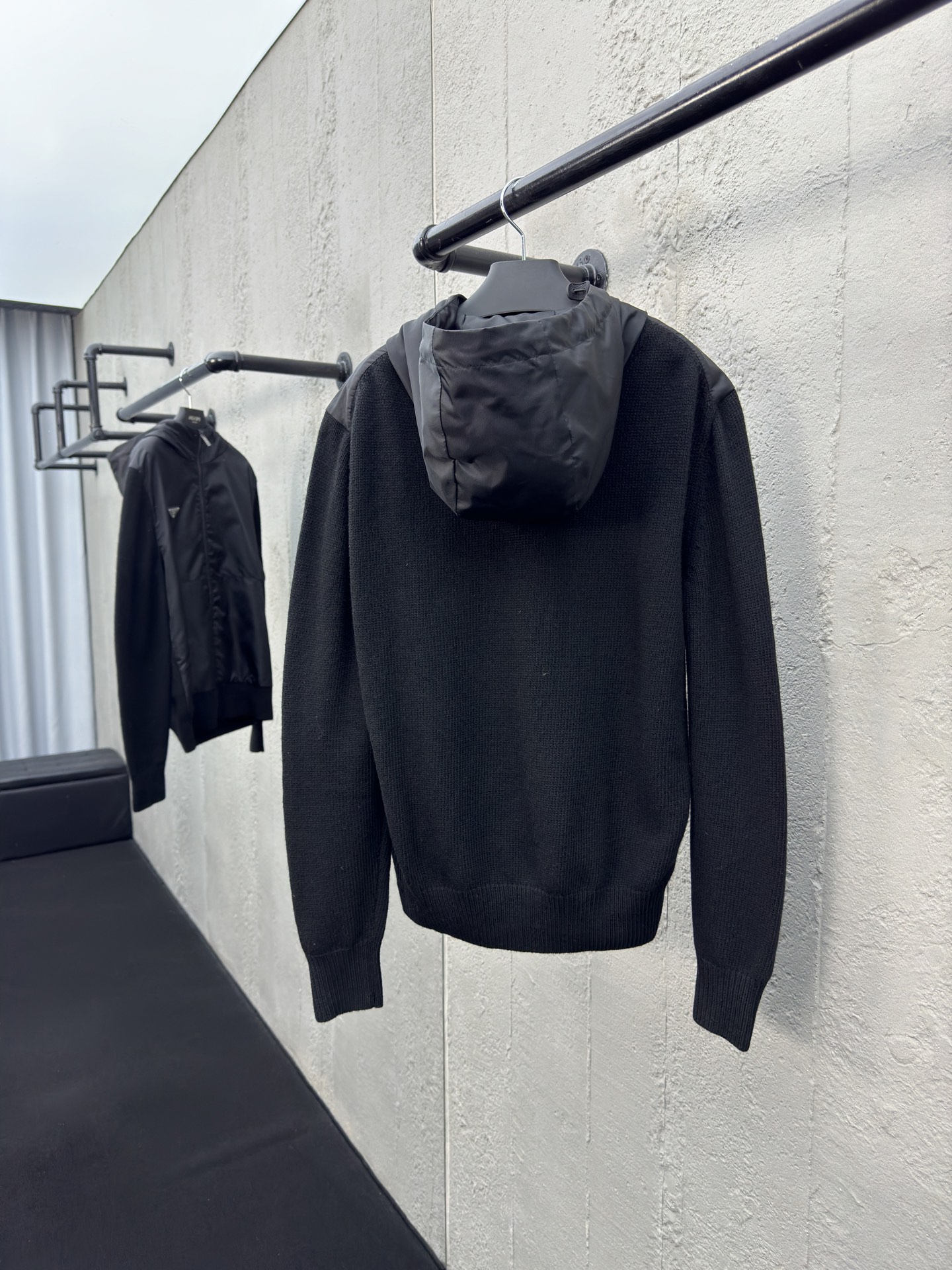 工艺说明:选用了羊毛羊绒混纺和P家经典再生尼龙面料,衣袖和后背的羊绒羊毛混纺采用平纹针织工艺表面平整质感细腻,袖口和下摆罗纹运用双针机编织而成,凹凸有致,条纹清晰,前片和袖子采用隐藏线工艺拼接而成,提升整体的美观度和品质感。风帽做了双层缝合增加牢固性,整体走线平直细腻,面料舒适柔软,颜色一致无色差 能与同款搭配营造时尚造型,驾驭各种场合,定制辅料,三标齐全,男女同款!